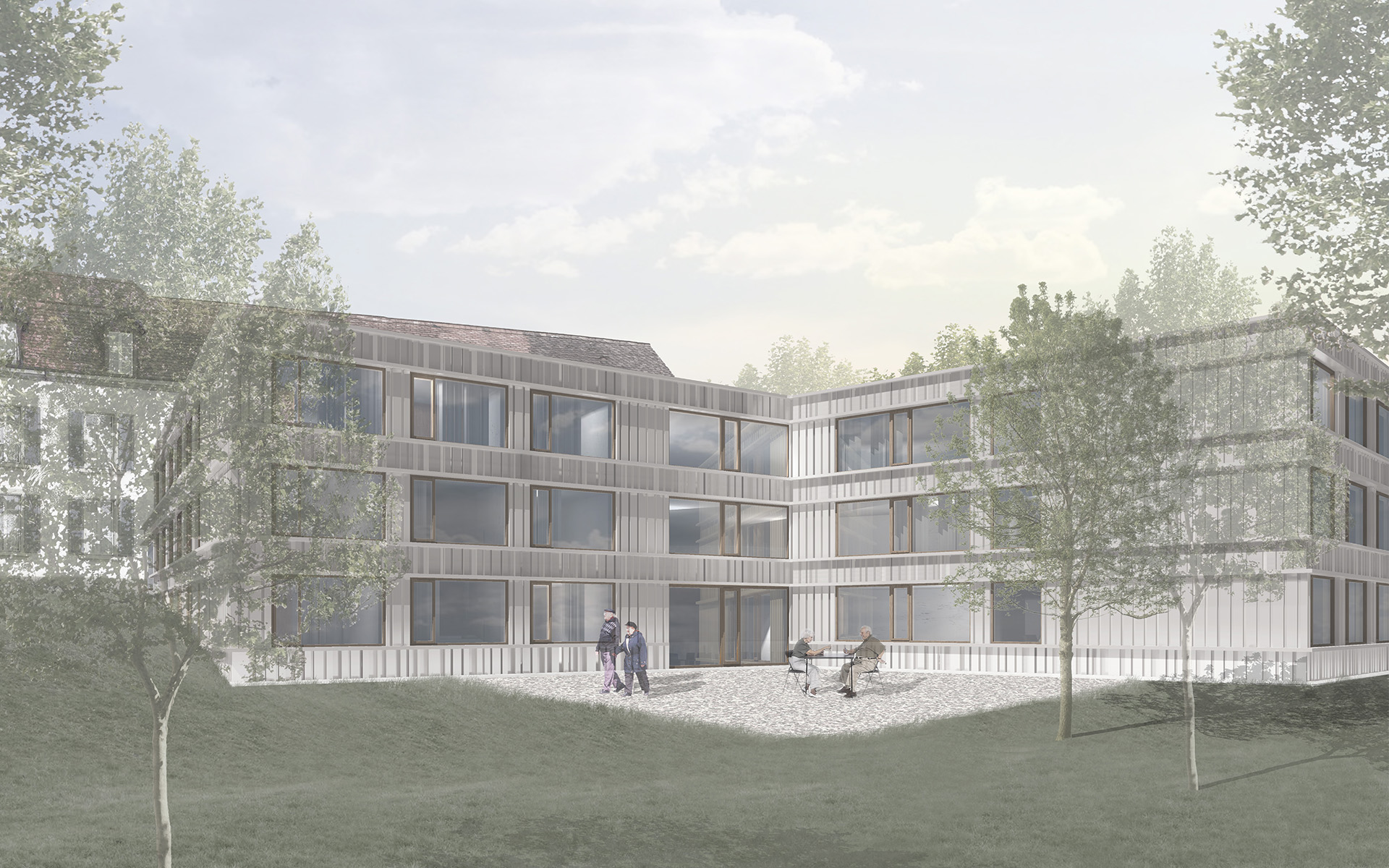 L’EMS des Fauvettes se situe sur une colline dominant la plaine de la Broye fribourgeoise et le Jura à l’ouest, les préalpes fribourgeoises et la plaine de la Sarine à l’est. Les bâtiments existants se développent en forme d’équerre autour d’un ancien jardin à la française ouvert sur le grand paysage au sud. Une grande cour permet d’accéder à l’entrée principale depuis la route conduisant au village de Montagny-la-Ville. Les lignes brisées du nouveau bâtiment se connectent à l’espace de liaison des bâtiments existants, un ancien orphelinat et une chapelle. Les bâtiments existants abritent toutes les fonctions communes. Les 60 chambres du programme sont organisées en 3 unités de vie regroupées autour d’un grand espace commun central.
