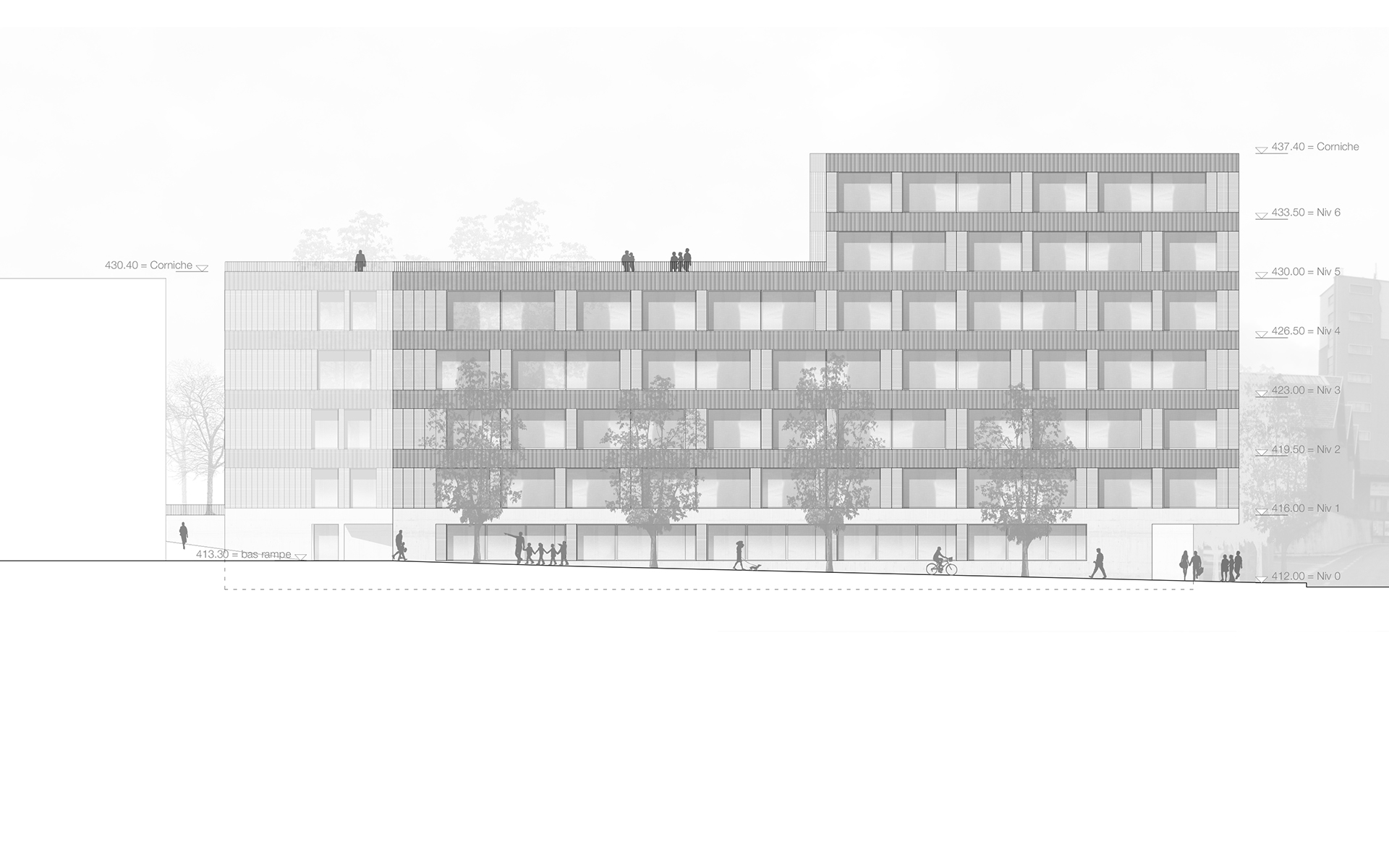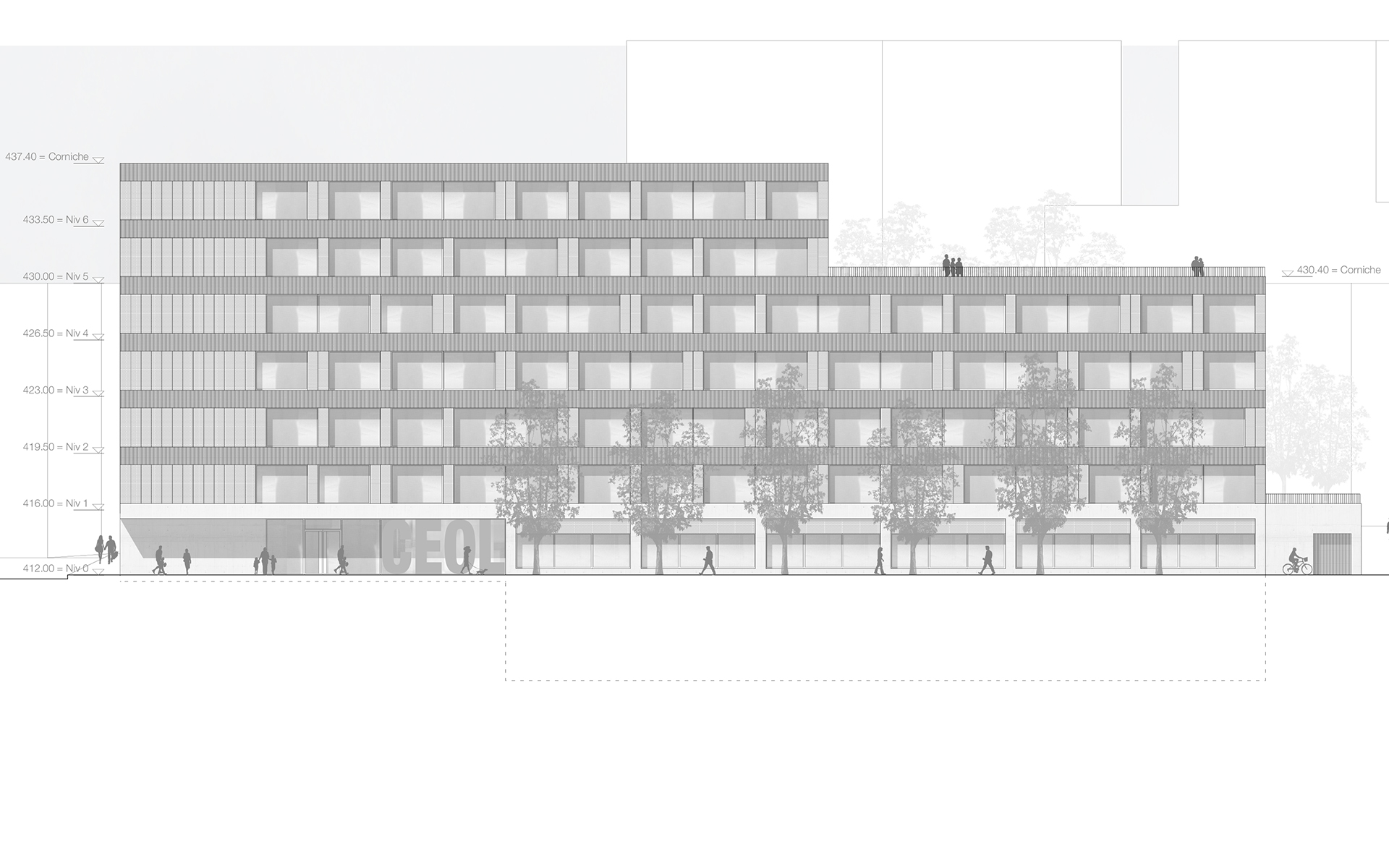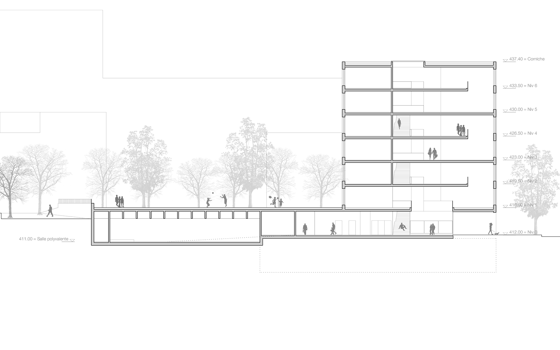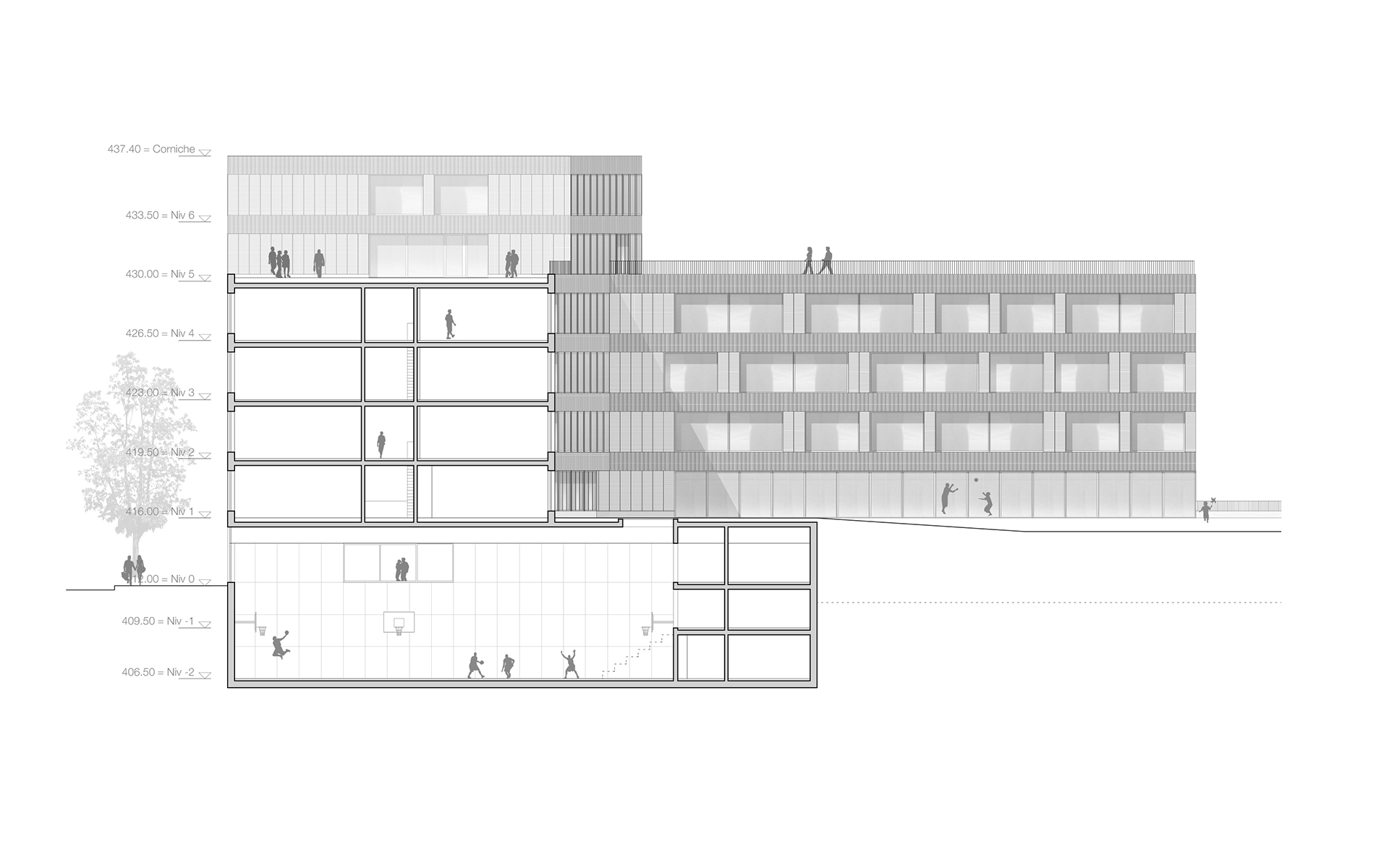Le projet s’implante dans l’angle est de la parcelle sous la forme d’une figure en forme d’équerre, en respectant les alignements sur rue définis par le plan directeur du quartier. La volumétrie générale reprend les altitudes des volumes environnants. L’angle du volume est rehaussé pour rendre accessible les terrasses situées en toiture. La cour située à l’arrière constitue une partie du préau scolaire, l’autre partie étant située sur les toitures terrasses du bâtiment. On y trouve l’un des accès à l’école, des espaces de récréation et des îlots de parcs à vélos. Les différentes salles du programme se distribuent de part et d’autre d’un couloir central, ponctué ici et là par des espaces de dégagement, de service ou par des cages d’escalier. Ces couloirs sont de dimensions variables, leur largeur diminuant dans les extrémités où le nombre de classes à distribuer diminue.