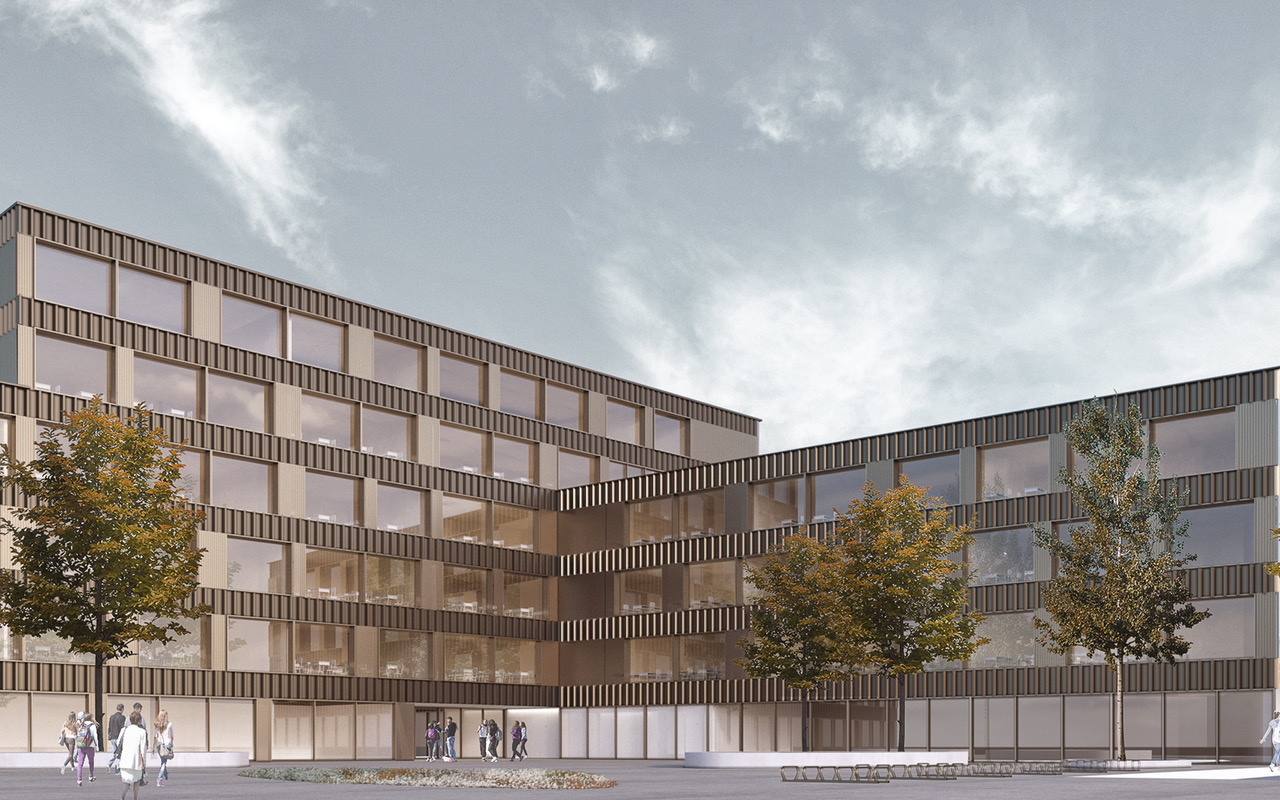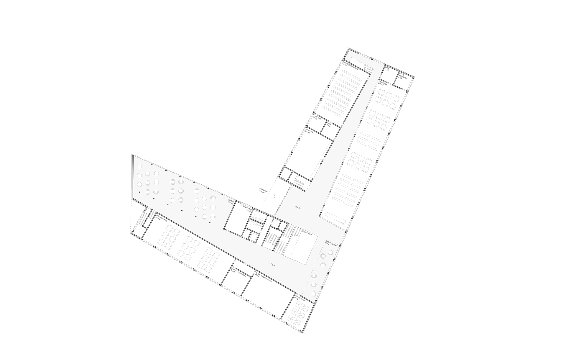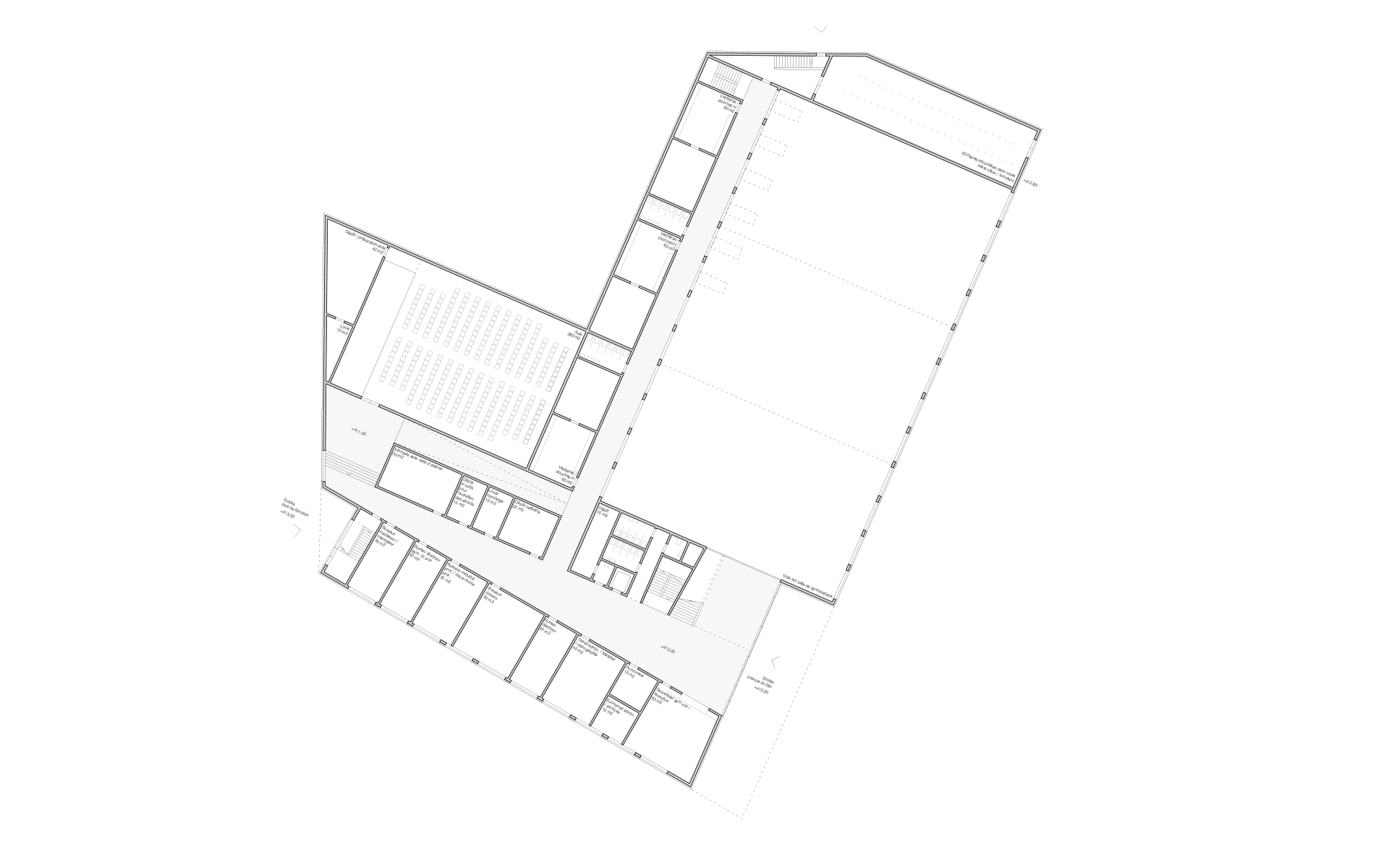 Le projet s’implante dans l’angle est de la parcelle sous la forme d’une figure en forme d’équerre, en respectant les alignements sur rue définis par le plan directeur du quartier. La volumétrie générale reprend les altitudes des volumes environnants. L’angle du volume est rehaussé pour rendre accessible les terrasses situées en toiture. La cour située à l’arrière constitue une partie du préau scolaire, l’autre partie étant située sur les toitures terrasses du bâtiment. On y trouve l’un des accès à l’école, des espaces de récréation et des îlots de parcs à vélos. Les différentes salles du programme se distribuent de part et d’autre d’un couloir central, ponctué ici et là par des espaces de dégagement, de service ou par des cages d’escalier. Ces couloirs sont de dimensions variables, leur largeur diminuant dans les extrémités où le nombre de classes à distribuer diminue.