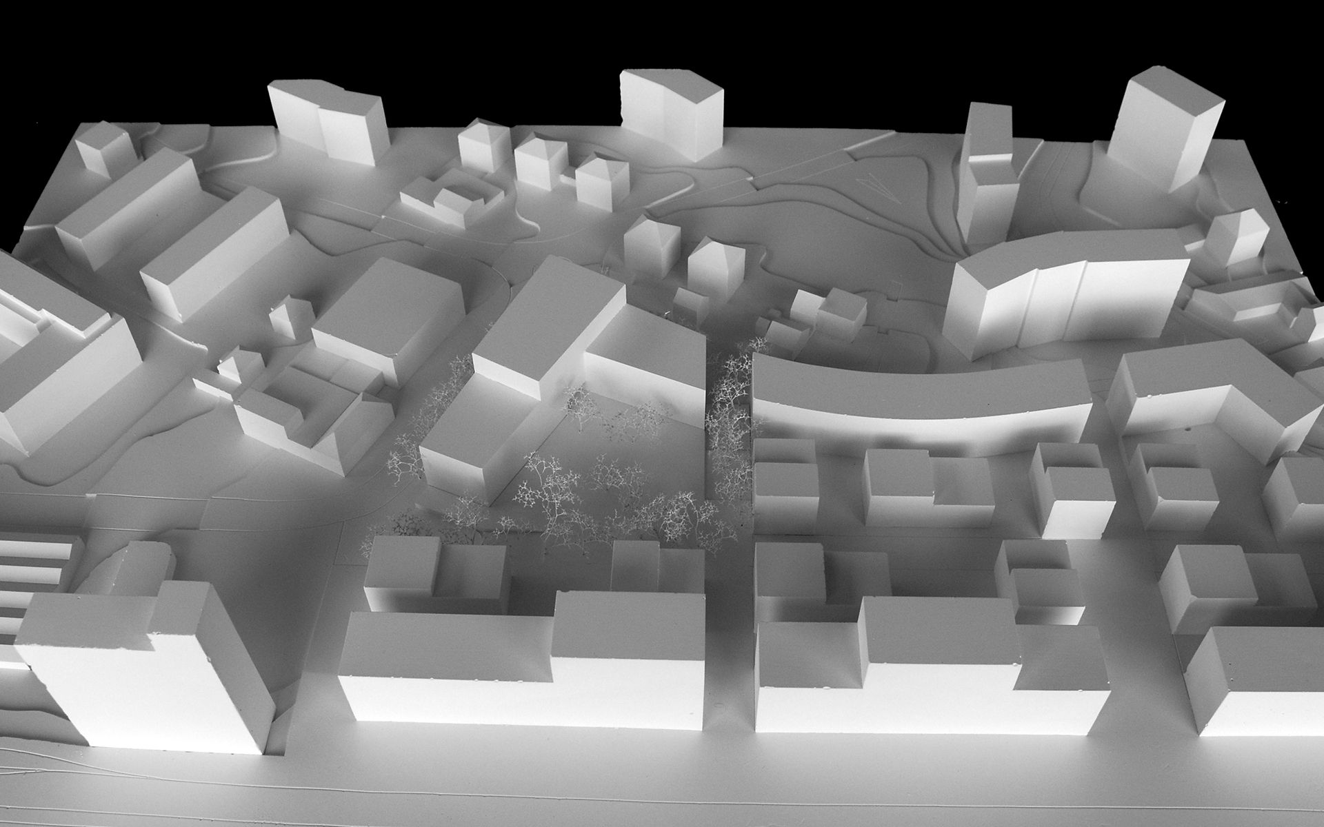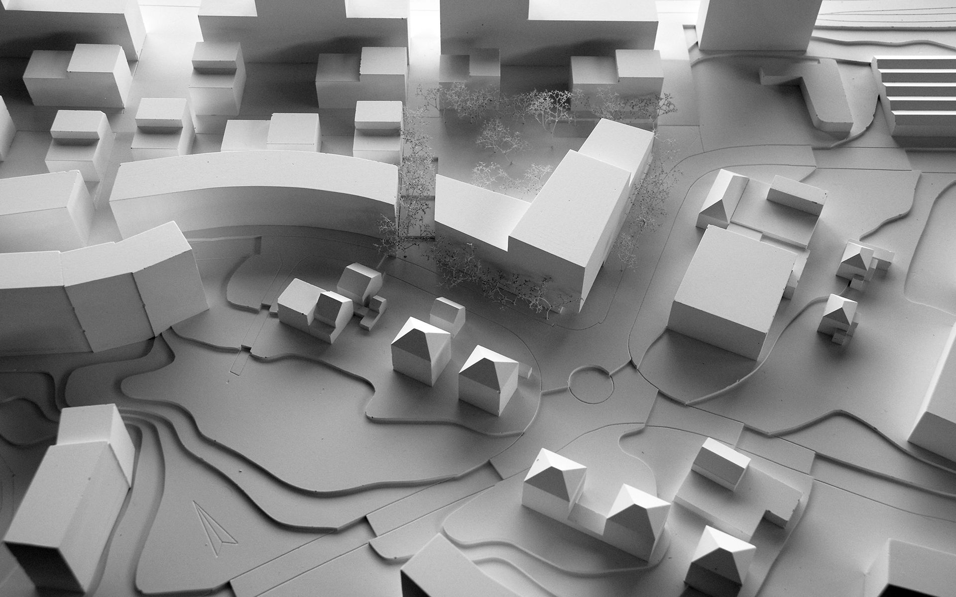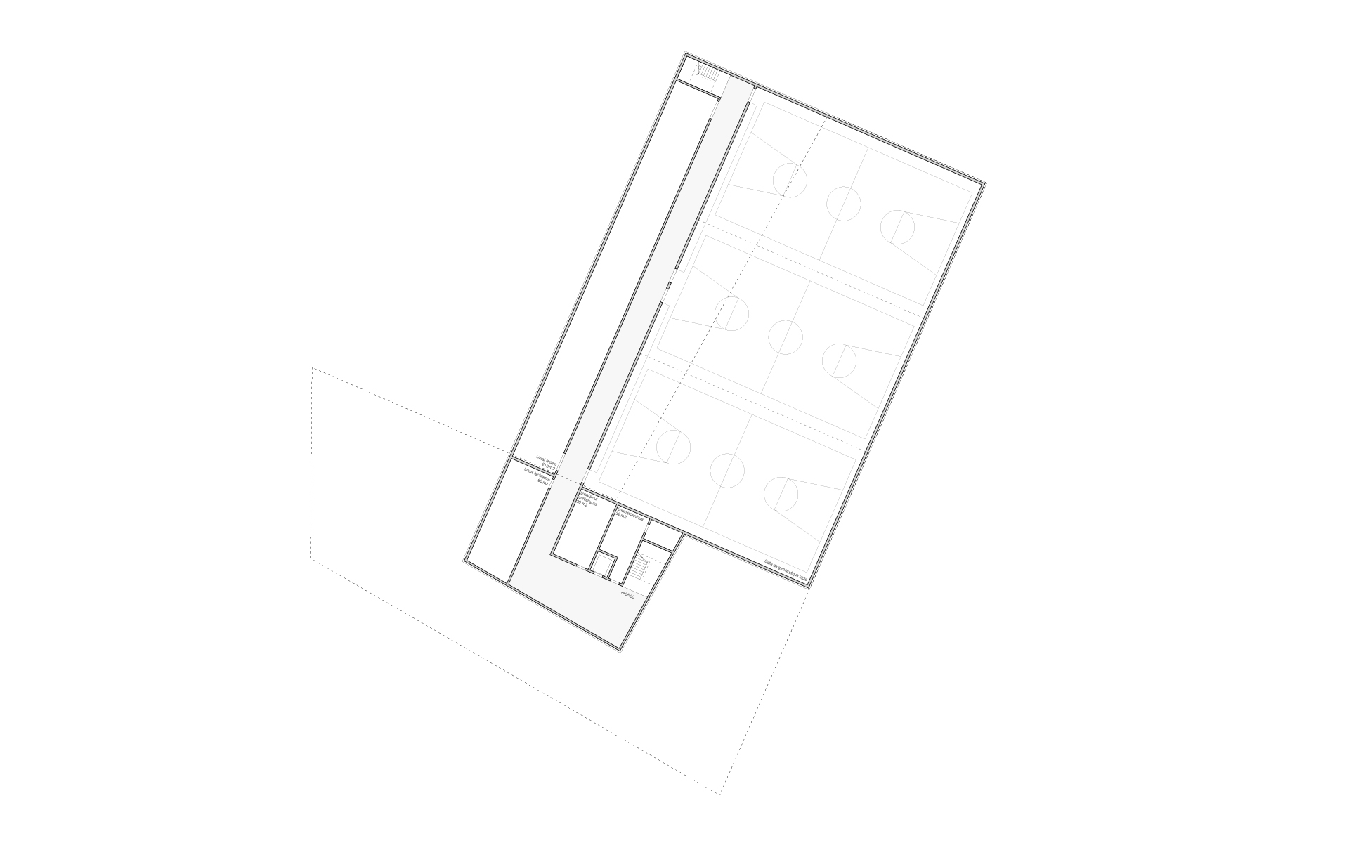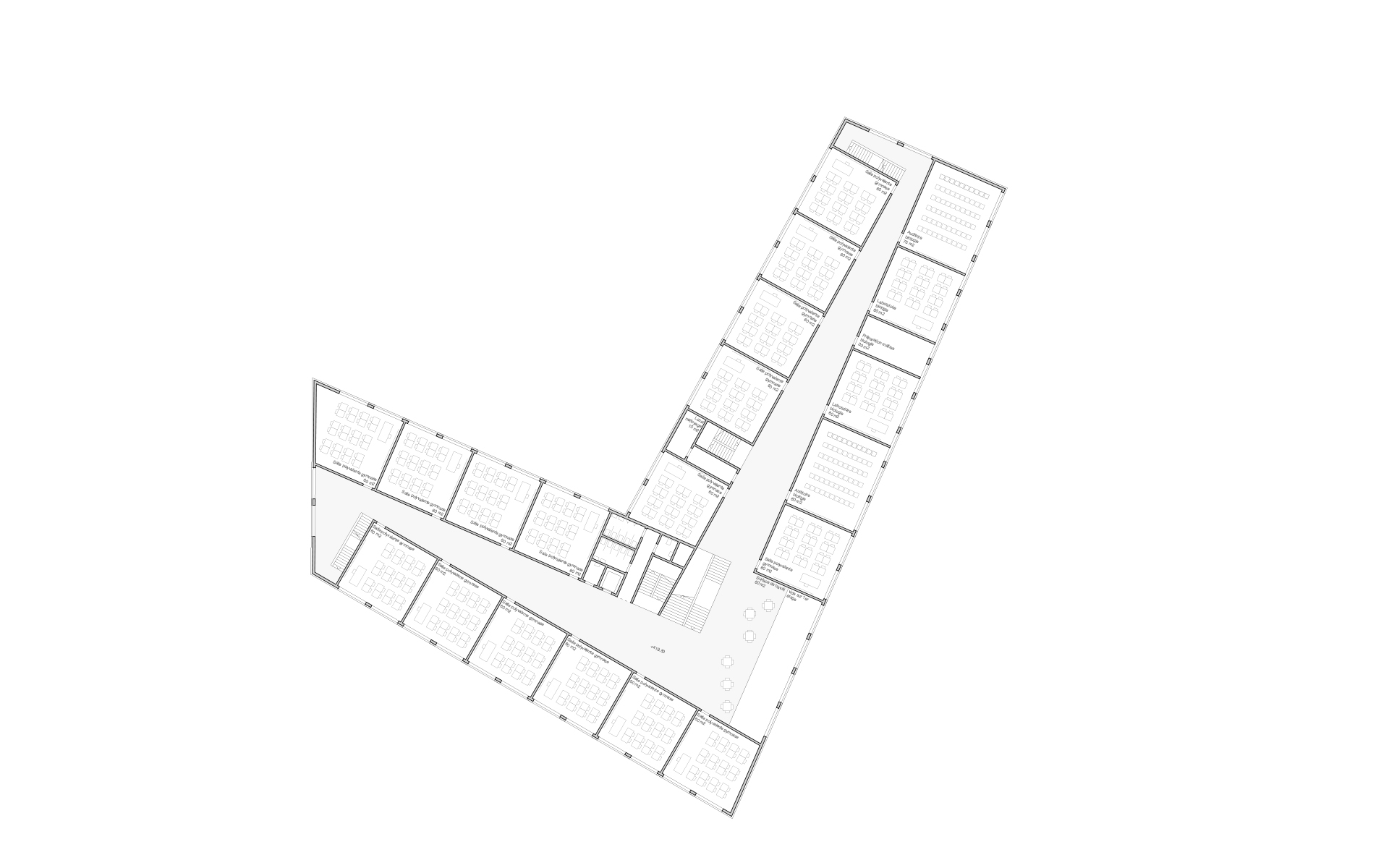 Le projet s’implante dans l’angle est de la parcelle sous la forme d’une figure en forme d’équerre, en respectant les alignements sur rue définis par le plan directeur du quartier. La volumétrie générale reprend les altitudes des volumes environnants. L’angle du volume est rehaussé pour rendre accessible les terrasses situées en toiture. La cour située à l’arrière constitue une partie du préau scolaire, l’autre partie étant située sur les toitures terrasses du bâtiment. On y trouve l’un des accès à l’école, des espaces de récréation et des îlots de parcs à vélos. Les différentes salles du programme se distribuent de part et d’autre d’un couloir central, ponctué ici et là par des espaces de dégagement, de service ou par des cages d’escalier. Ces couloirs sont de dimensions variables, leur largeur diminuant dans les extrémités où le nombre de classes à distribuer diminue.