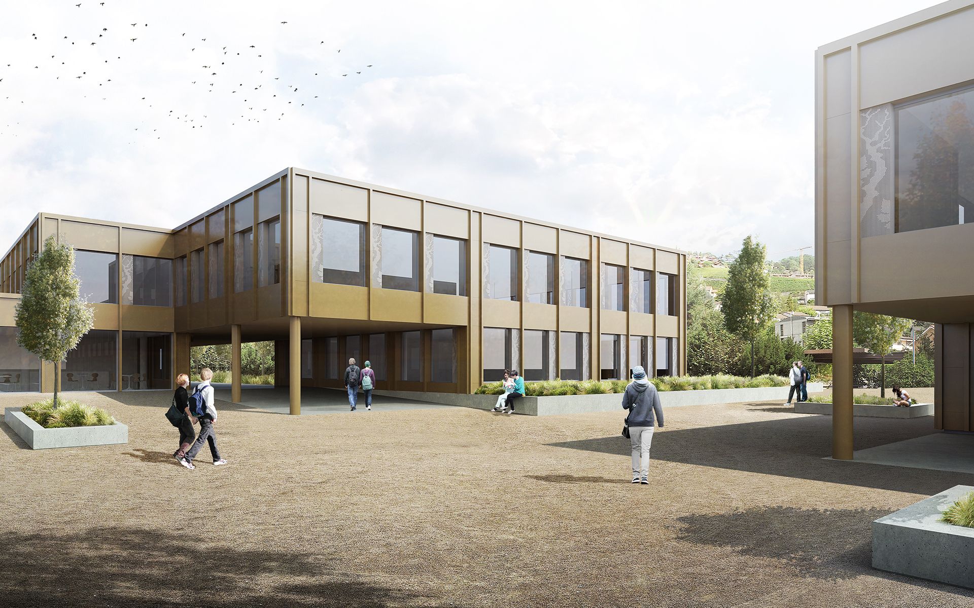 Le projet d’agrandissement consiste à intervenir ponctuellement en quelques endroits stratégiques. Le nouveau réfectoire scolaire est créé dans l’extension du volume existant au sud et profite ainsi du dégagement vers le paysage lémanique. Les autres interventions visent à mettre en conformité parasismique et de protection incendie les bâtiments existants (salle de sport, salles de classe, bureaux administratifs). L’enveloppe des bâtiments répond aux nouveaux standards énergétiques. Le système constructif de type CROCS est conservé dans son essence et sa matérialité. Les aménagements extérieurs sont remaniés pour supprimer les barrières architecturales existantes.