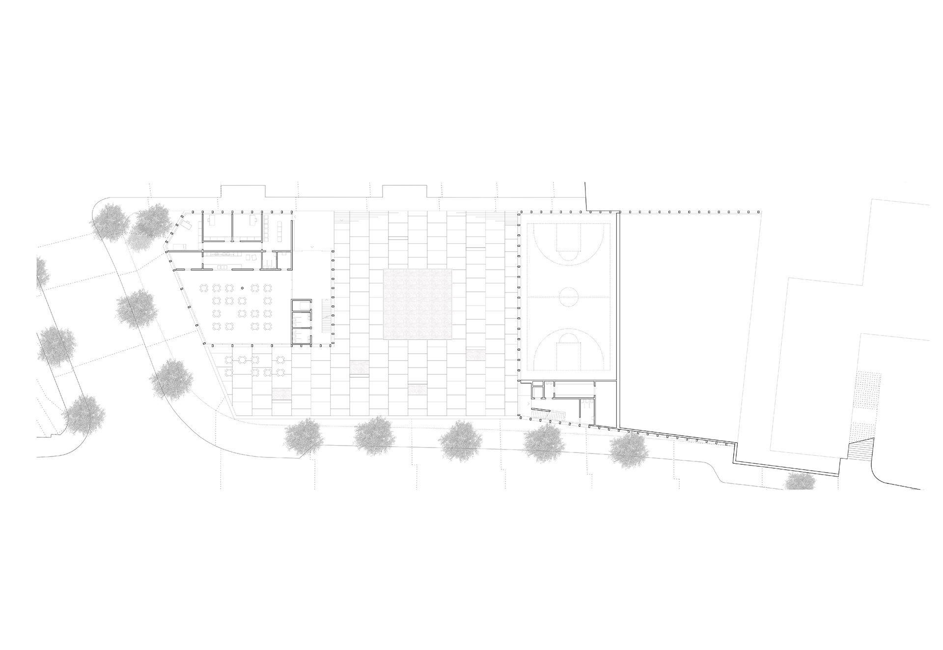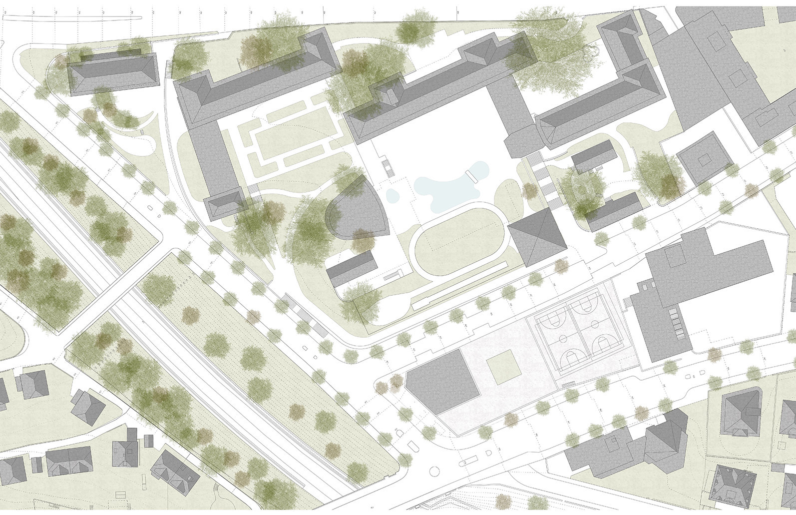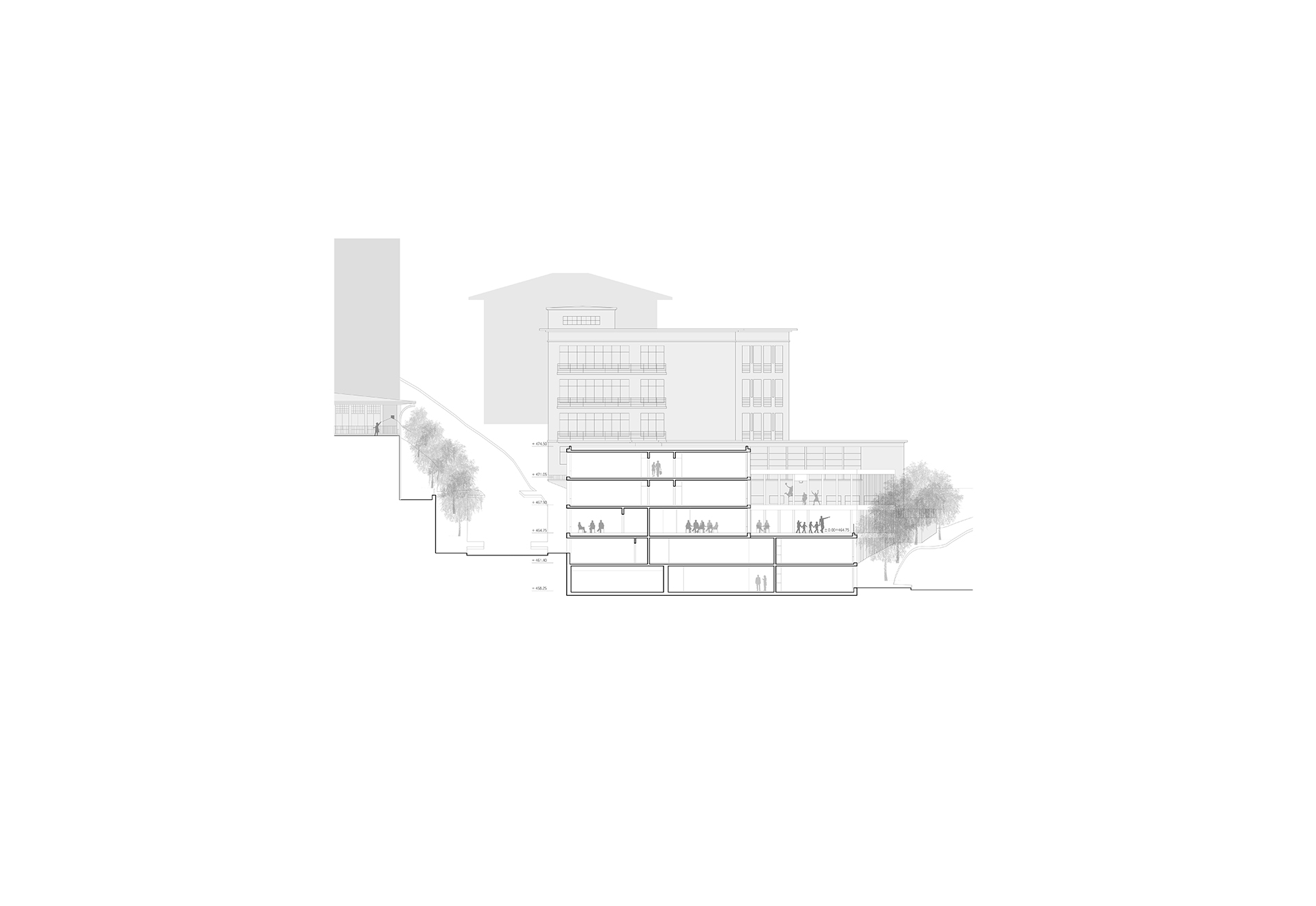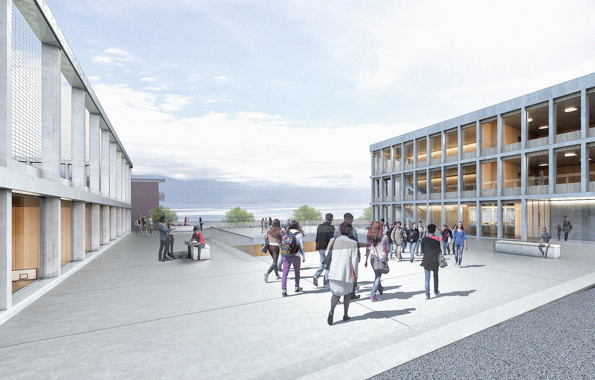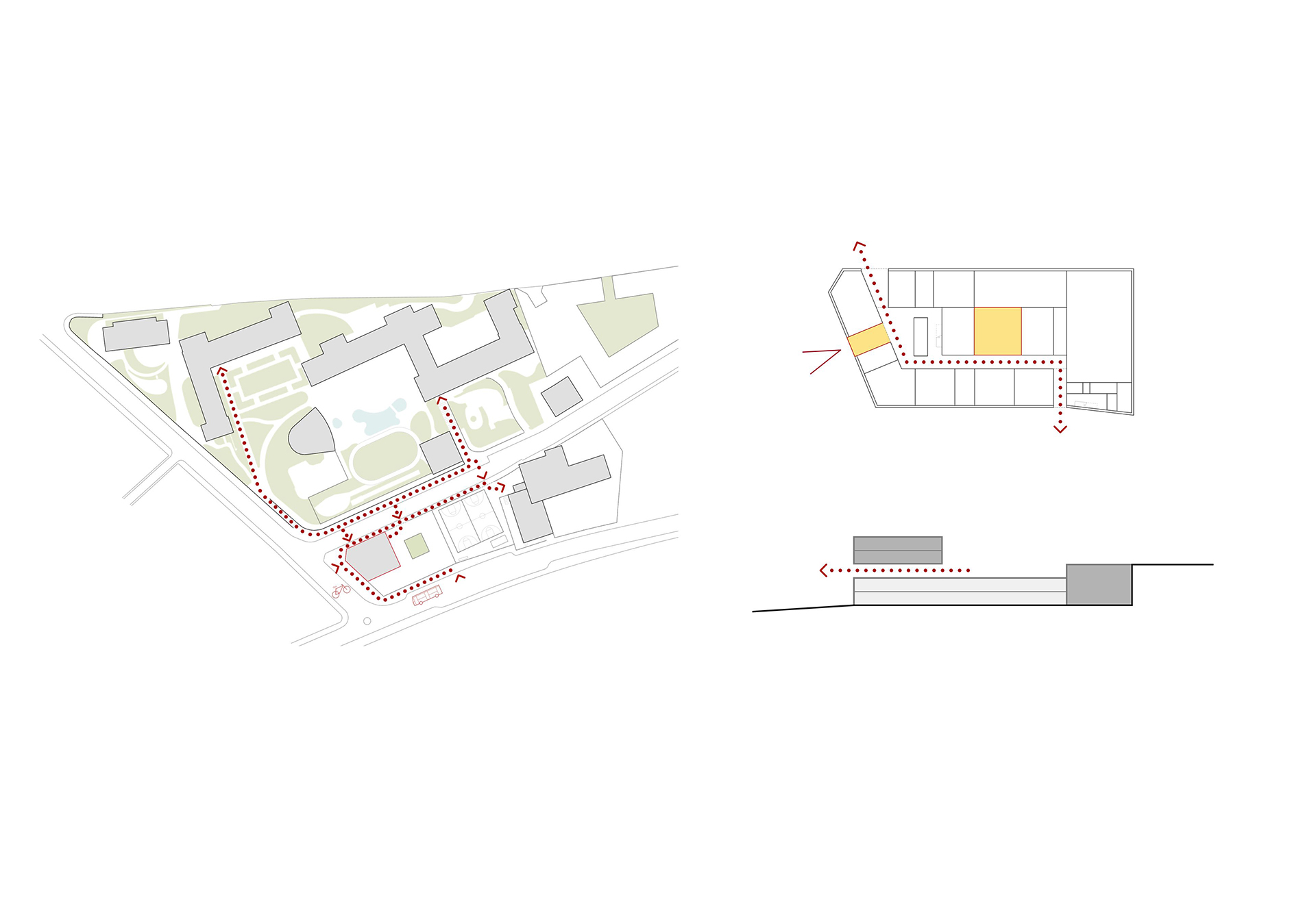Le bâtiment est relié à son environnement par des accès distincts qui suivent la déclivité des trois rues qui le bordent. Ces accès séparés et indépendants répondent à la demande du Maître d’ouvrage de distinguer et répartir le flux des élèves selon les programmes ou l’utilisation des locaux en dehors des horaires scolaires. L’accès principal de l’école se trouve au niveau de l’esplanade et fait « pendant » à l’entrée du collège des Croix-Rouges. La typologie et l’organisation de l’école est relativement simple : elle tire parti du site et des rues en pente qui la bordent, ainsi que des dégagements sur le paysage urbain et lacustre. Les salles de classes spéciales installées dans le socle s’organisent en « couronne » sur le pourtour du bâtiment autour d’un noyau de circulation verticale et d’un patio. Les salles de classe situées dans la tête émergente s’organisent simplement de part et d’autre d’un couloir central. Les circulations sont réduites à l’essentiel et ponctuées de lumière naturelle pour minimiser l’utilisation de l’éclairage artificiel. Elles sont également pourvues de dégagements sur l’extérieur pour faciliter l’orientation dans le bâtiment et offrir des vues sur le paysage. Cette organisation modulaire permet des rocades entre les différents locaux si le MO le souhaite, sans que le concept de base n'en soit modifié.