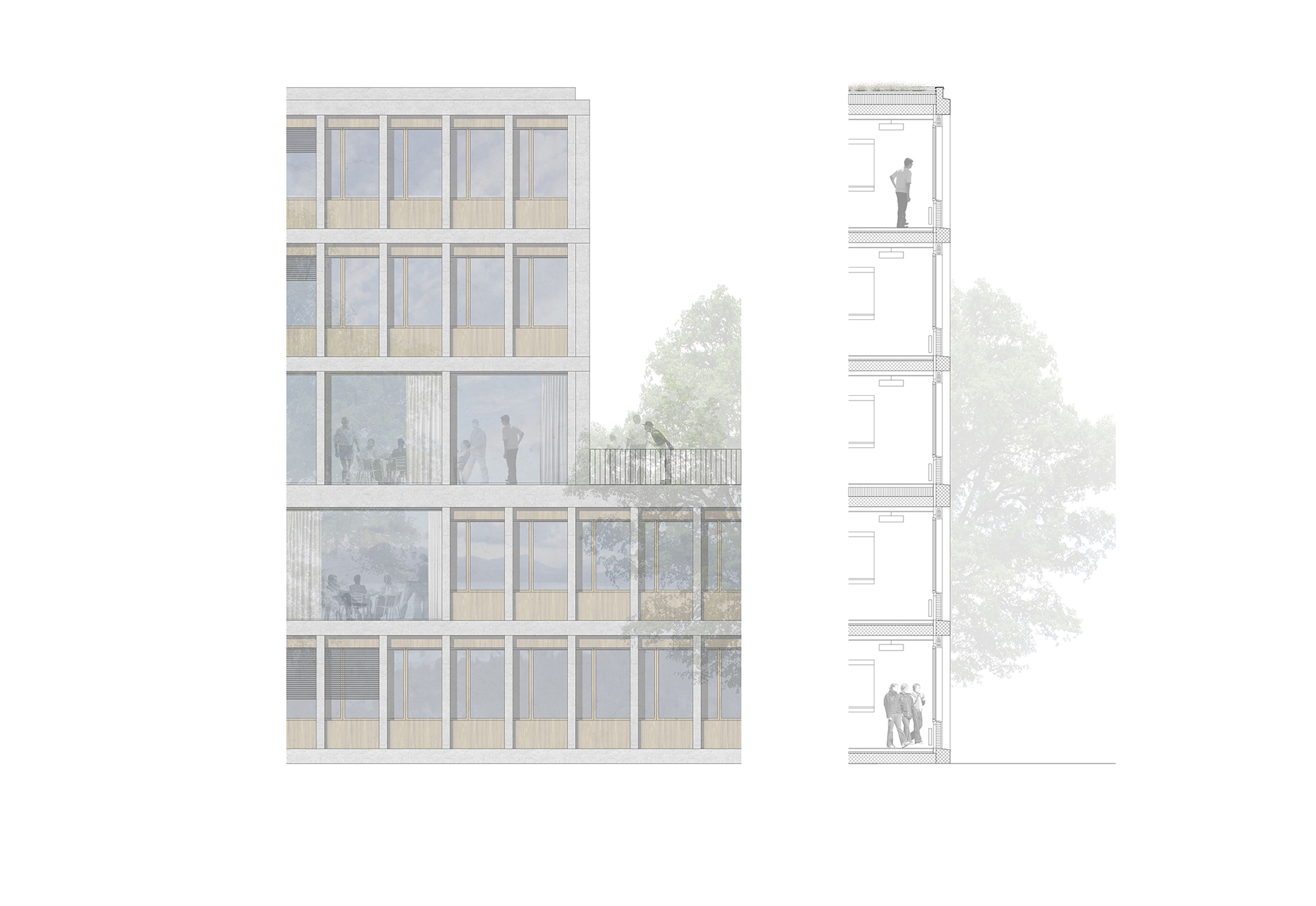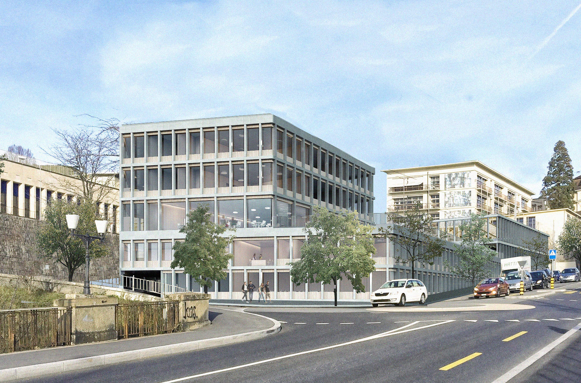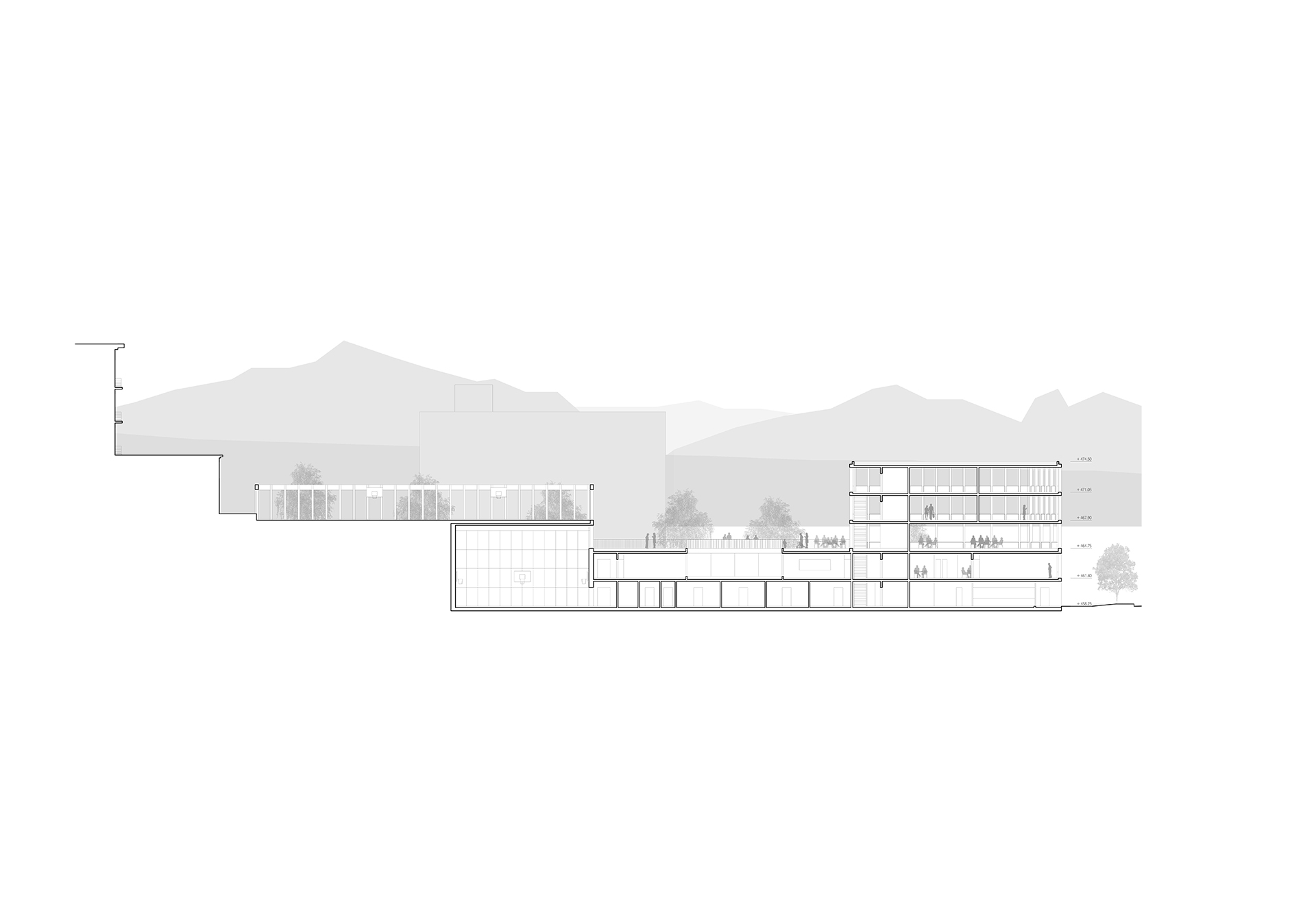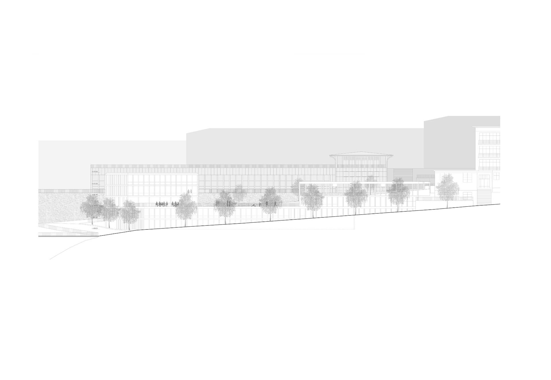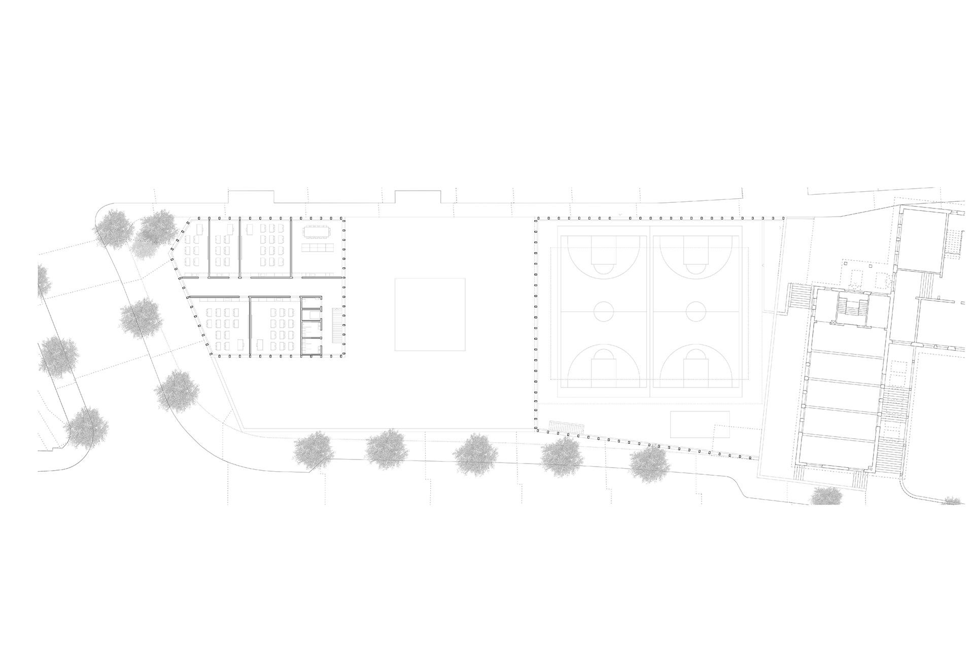 Le bâtiment est relié à son environnement par des accès distincts qui suivent la déclivité des trois rues qui le bordent. Ces accès séparés et indépendants répondent à la demande du Maître d’ouvrage de distinguer et répartir le flux des élèves selon les programmes ou l’utilisation des locaux en dehors des horaires scolaires. L’accès principal de l’école se trouve au niveau de l’esplanade et fait « pendant » à l’entrée du collège des Croix-Rouges. La typologie et l’organisation de l’école est relativement simple : elle tire parti du site et des rues en pente qui la bordent, ainsi que des dégagements sur le paysage urbain et lacustre. Les salles de classes spéciales installées dans le socle s’organisent en « couronne » sur le pourtour du bâtiment autour d’un noyau de circulation verticale et d’un patio. Les salles de classe situées dans la tête émergente s’organisent simplement de part et d’autre d’un couloir central. Les circulations sont réduites à l’essentiel et ponctuées de lumière naturelle pour minimiser l’utilisation de l’éclairage artificiel. Elles sont également pourvues de dégagements sur l’extérieur pour faciliter l’orientation dans le bâtiment et offrir des vues sur le paysage. Cette organisation modulaire permet des rocades entre les différents locaux si le MO le souhaite, sans que le concept de base n'en soit modifié.