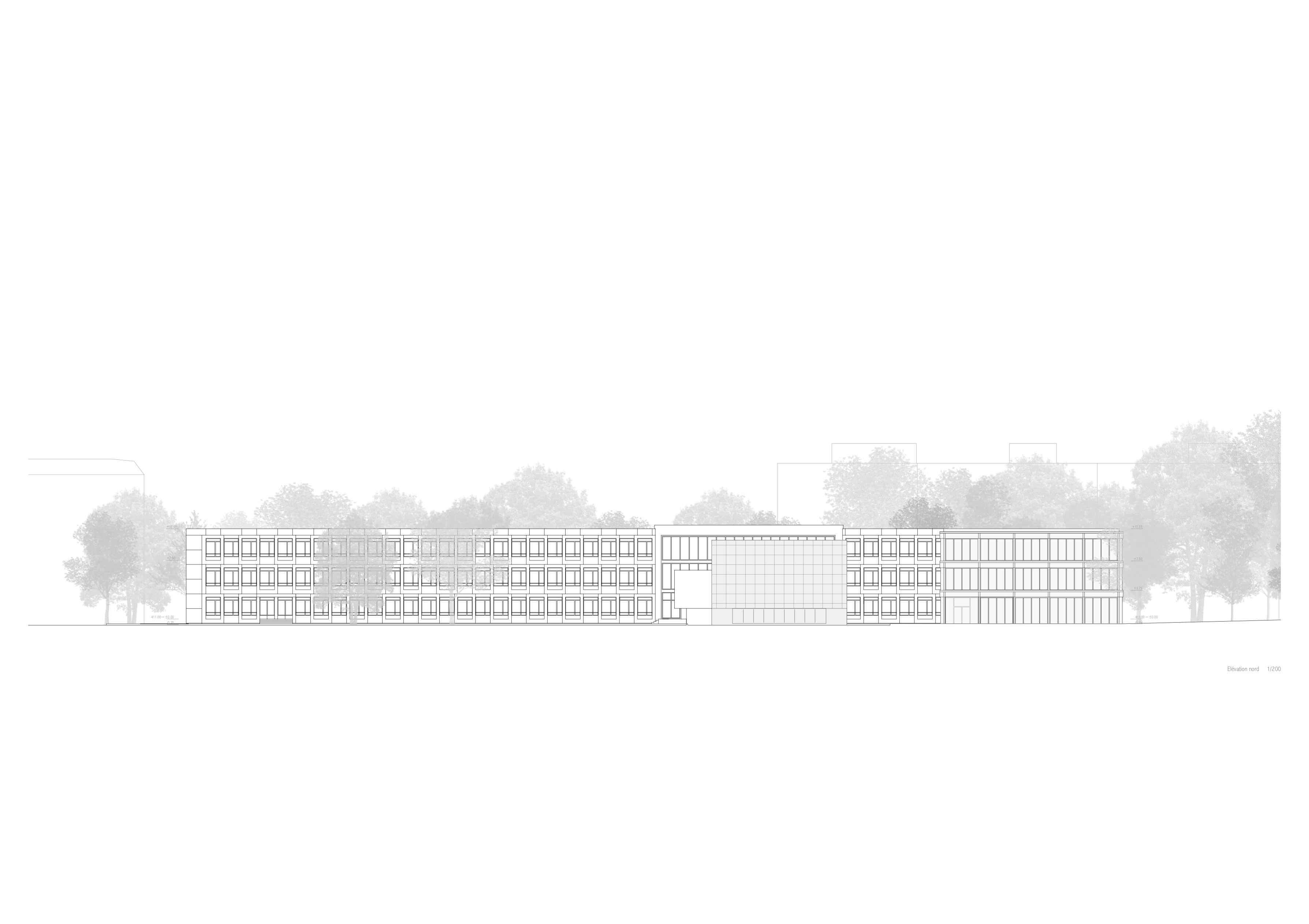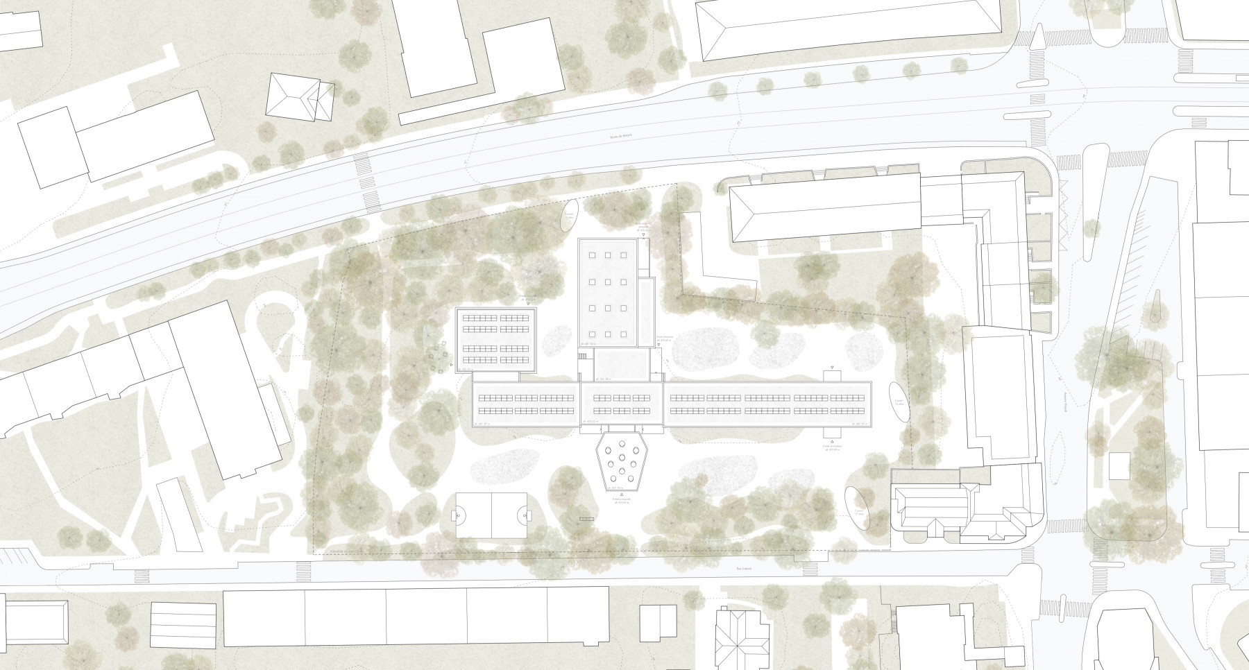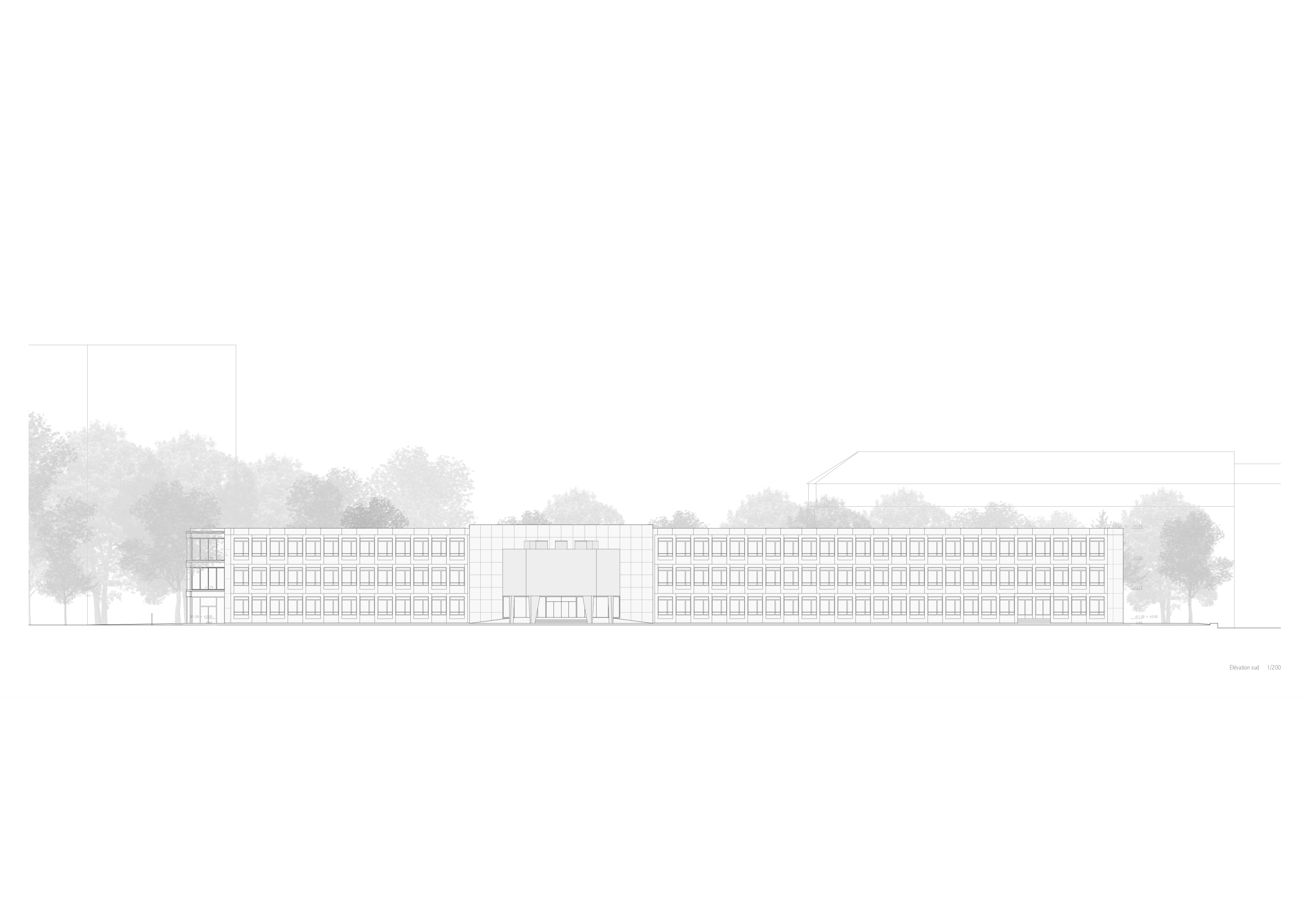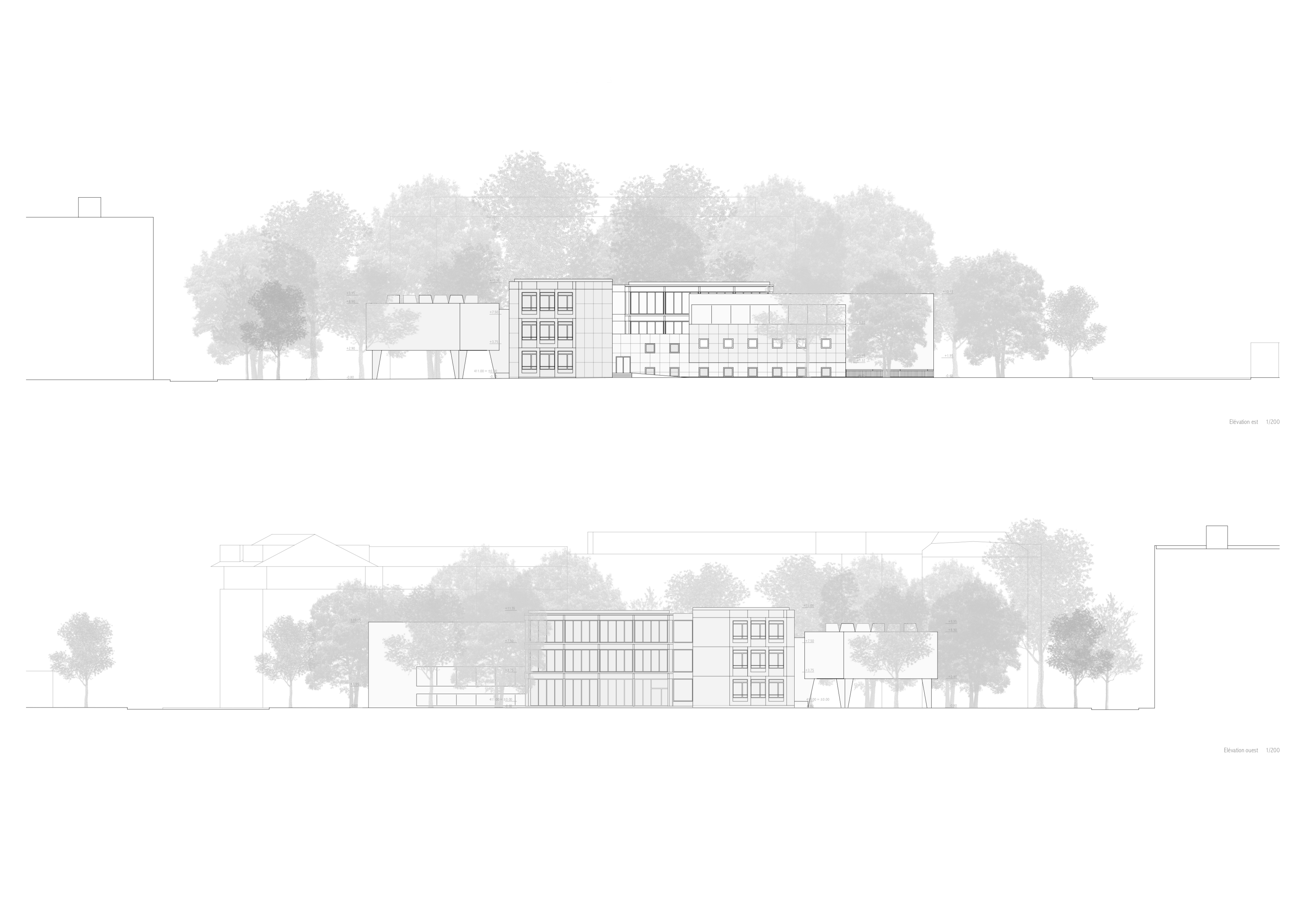 Le volume supplémentaire demandé par le programme s’insère entre la partie scolaire et la zone de verdure publique en relation avec le quartier environnant, renforçant le lien entre l'école et le quartier. Ce volume s’accroche à l’élément linéaire des salles de classe de la même manière que l’aula ou la salle de sport et la piscine. L’agrandissement accueille au rez-de-chaussée le réfectoire scolaire, situé de plain pied avec le niveau des aménagements extérieurs (préaux, jardin public); ce dernier profite ainsi d’une plus grande hauteur d’étage, en adéquation avec sa fonction et sa grande surface. L’élément linéaire principal accueille au rez-de-chaussée la partie administrative (salle des maîtres, secrétariat, direction, infirmerie) et les salles de classe dédiées aux petits degrés, en relation avec leur préau indépendant. Les étages supérieurs accueillent toutes les autres salles de classe du programme. Le traitement paysager du site est renforcé dans la nouvelle intervention. Il s’agit de percevoir une école dans un parc au cœur du quartier et non plus une école à côté du parc. Les préaux sont également intégrés au parc : les grandes surfaces minérales sont réduites pour les rendre plus perméables, en favorisant l’infiltration naturelle, tout en les rendant moins austères et plus accueillantes. Pour ne pas modifier l'aspect d'origine du corps principal, il est prévu de conserver la composition de type "cote de maille" ou "en damier" des façades existantes, tout en apportant les améliorations de rendement énergétique souhaitées.