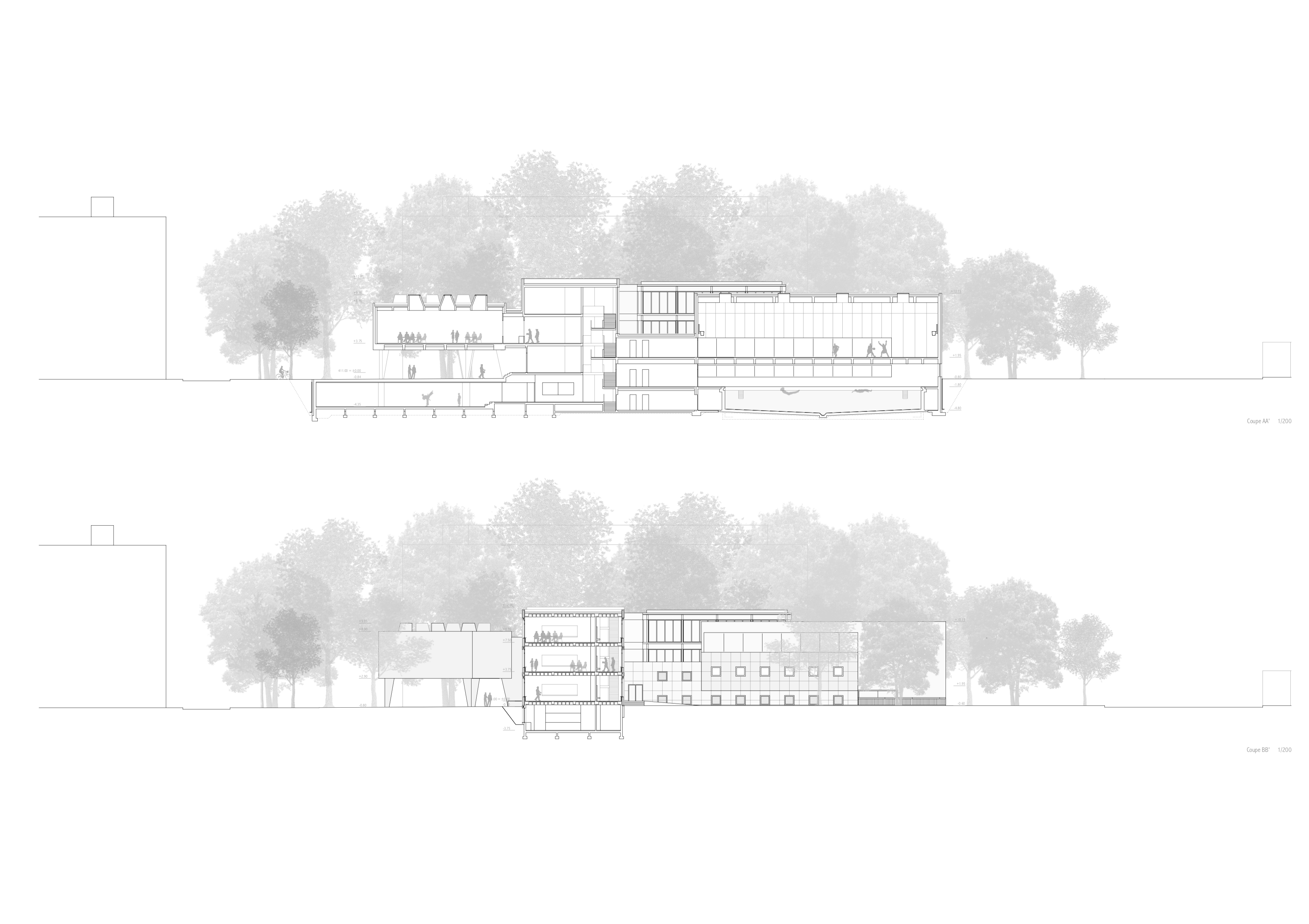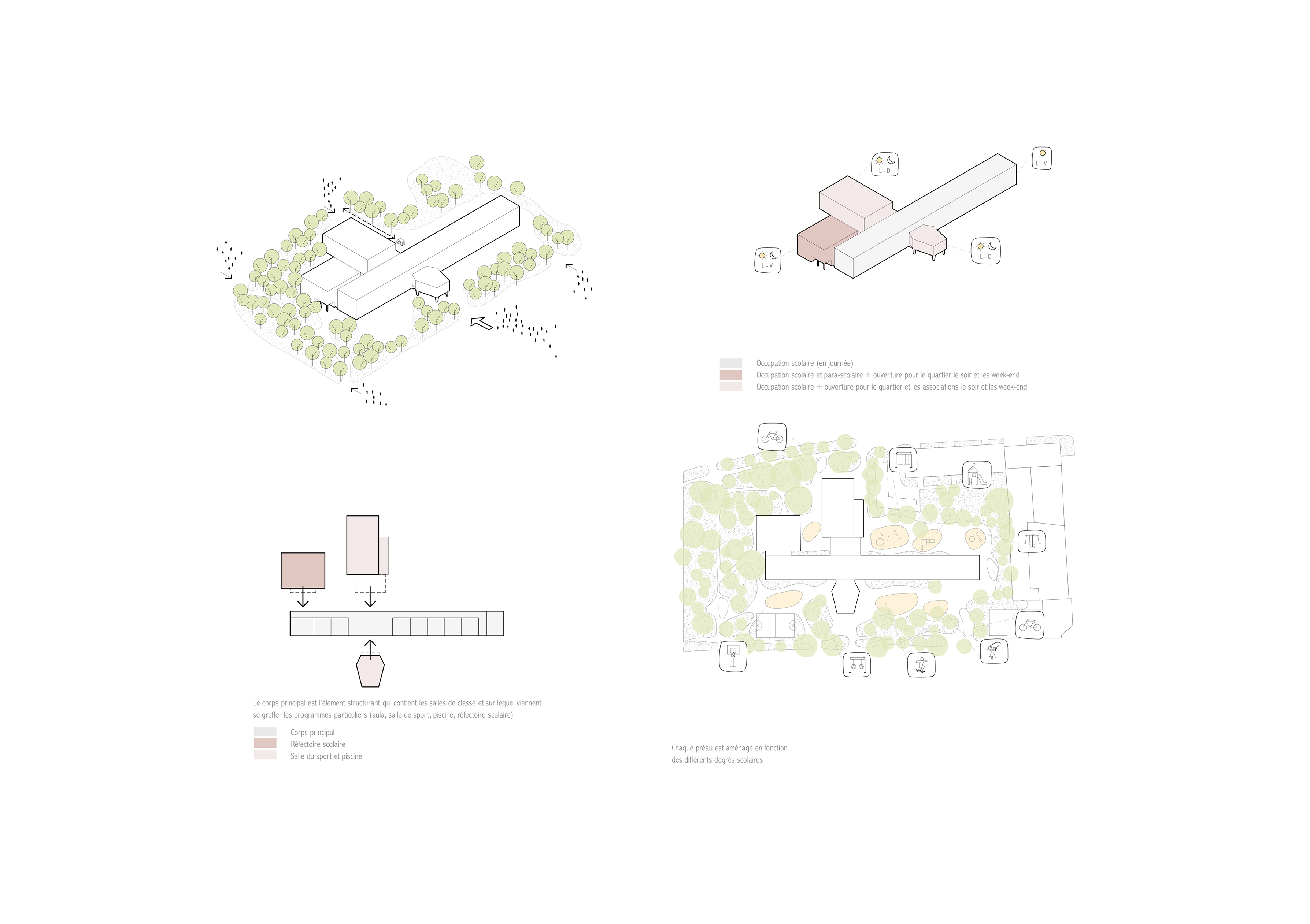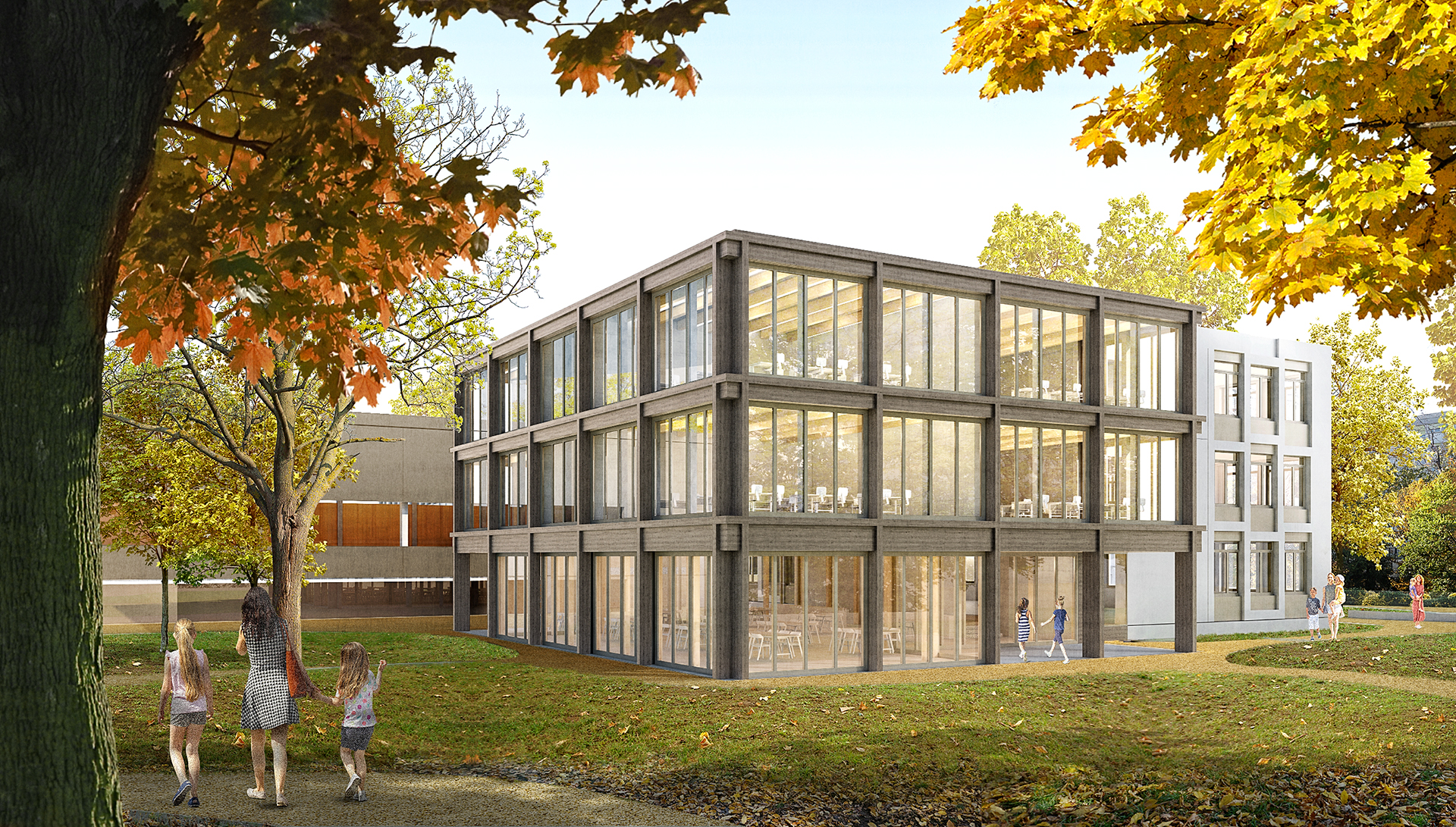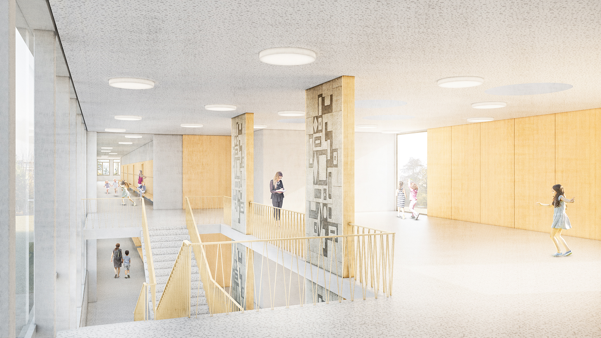 Le volume supplémentaire demandé par le programme s’insère entre la partie scolaire et la zone de verdure publique en relation avec le quartier environnant, renforçant le lien entre l'école et le quartier. Ce volume s’accroche à l’élément linéaire des salles de classe de la même manière que l’aula ou la salle de sport et la piscine. L’agrandissement accueille au rez-de-chaussée le réfectoire scolaire, situé de plain pied avec le niveau des aménagements extérieurs (préaux, jardin public); ce dernier profite ainsi d’une plus grande hauteur d’étage, en adéquation avec sa fonction et sa grande surface. L’élément linéaire principal accueille au rez-de-chaussée la partie administrative (salle des maîtres, secrétariat, direction, infirmerie) et les salles de classe dédiées aux petits degrés, en relation avec leur préau indépendant. Les étages supérieurs accueillent toutes les autres salles de classe du programme. Le traitement paysager du site est renforcé dans la nouvelle intervention. Il s’agit de percevoir une école dans un parc au cœur du quartier et non plus une école à côté du parc. Les préaux sont également intégrés au parc : les grandes surfaces minérales sont réduites pour les rendre plus perméables, en favorisant l’infiltration naturelle, tout en les rendant moins austères et plus accueillantes. Pour ne pas modifier l'aspect d'origine du corps principal, il est prévu de conserver la composition de type "cote de maille" ou "en damier" des façades existantes, tout en apportant les améliorations de rendement énergétique souhaitées.