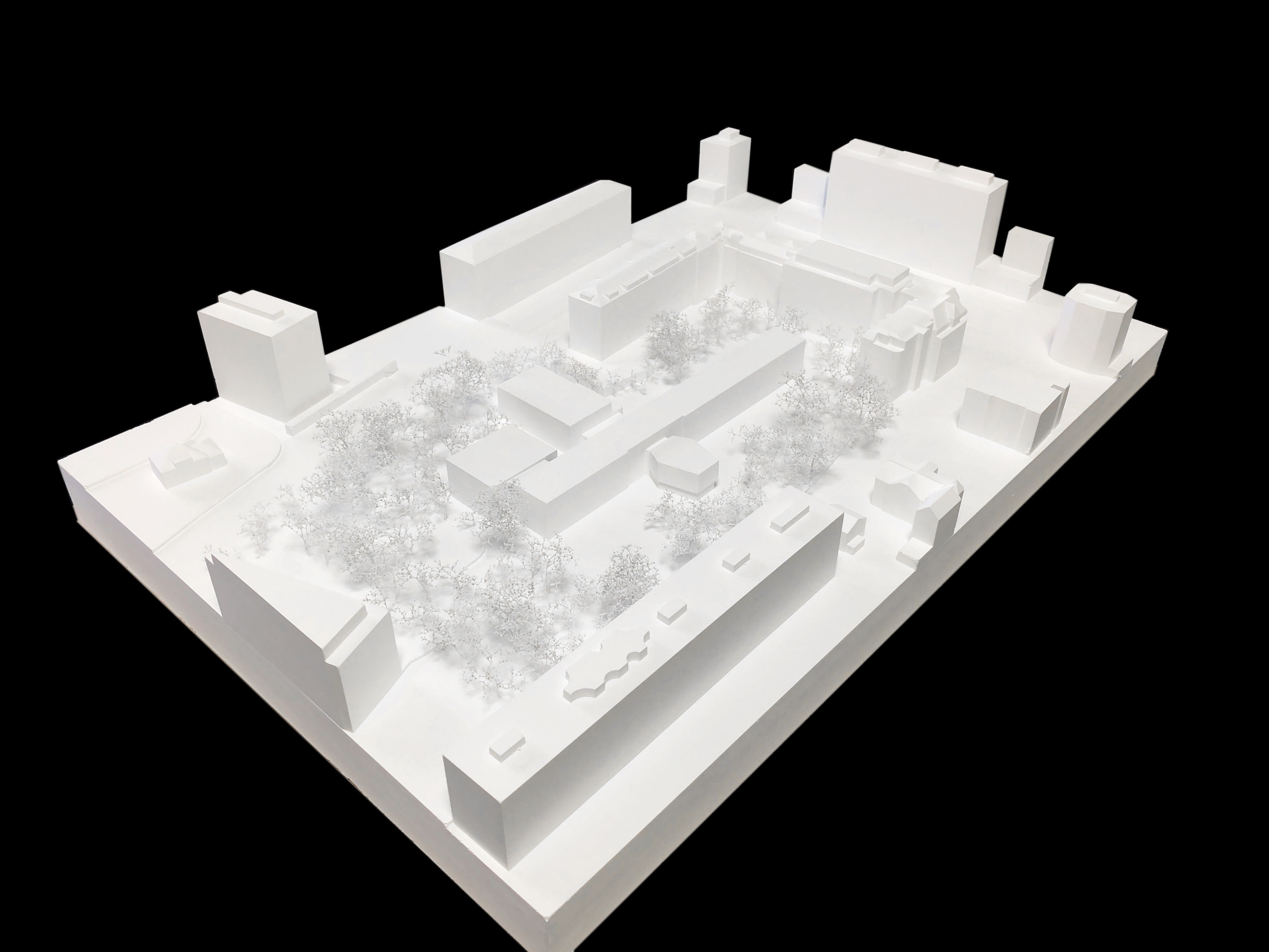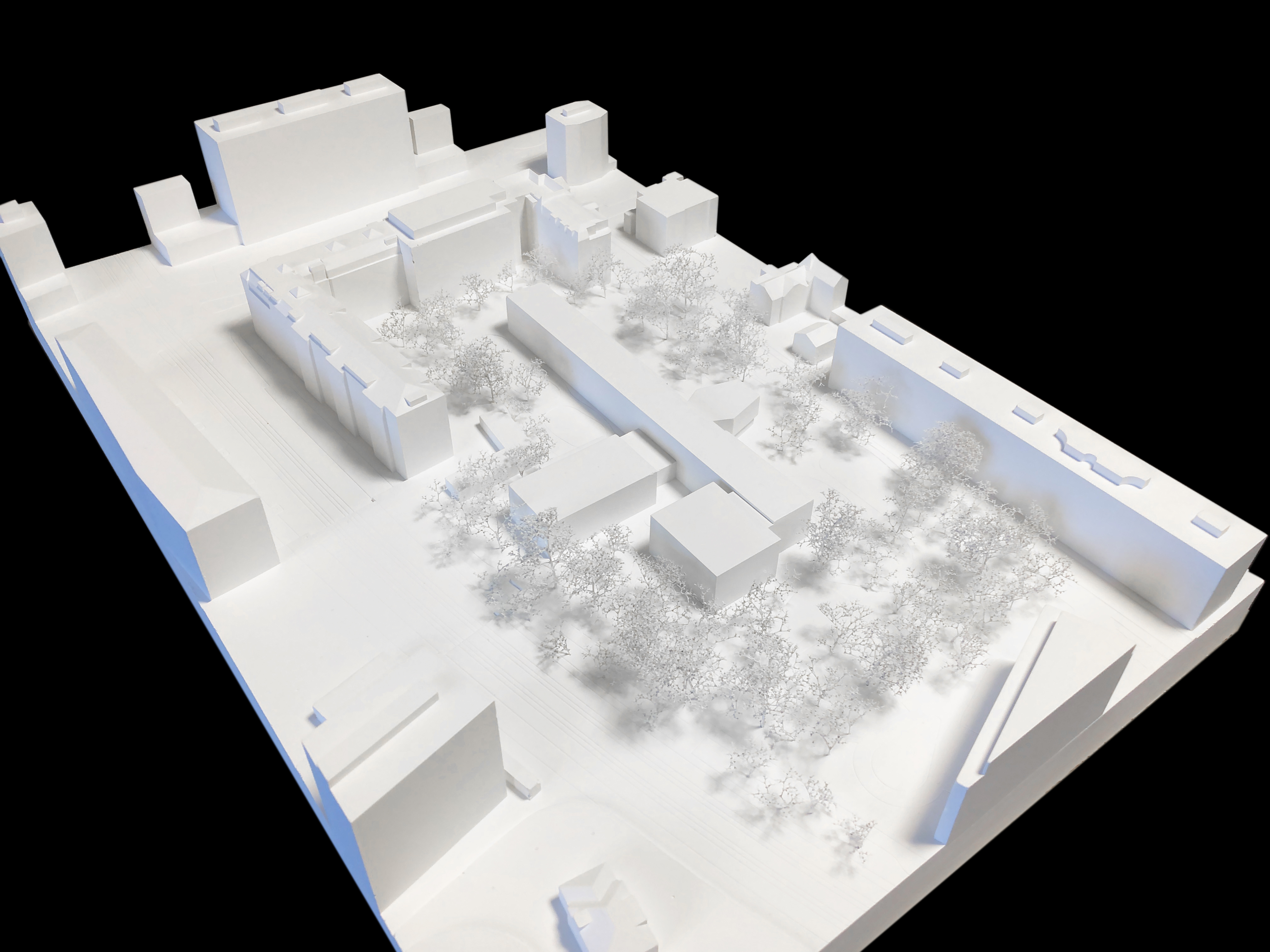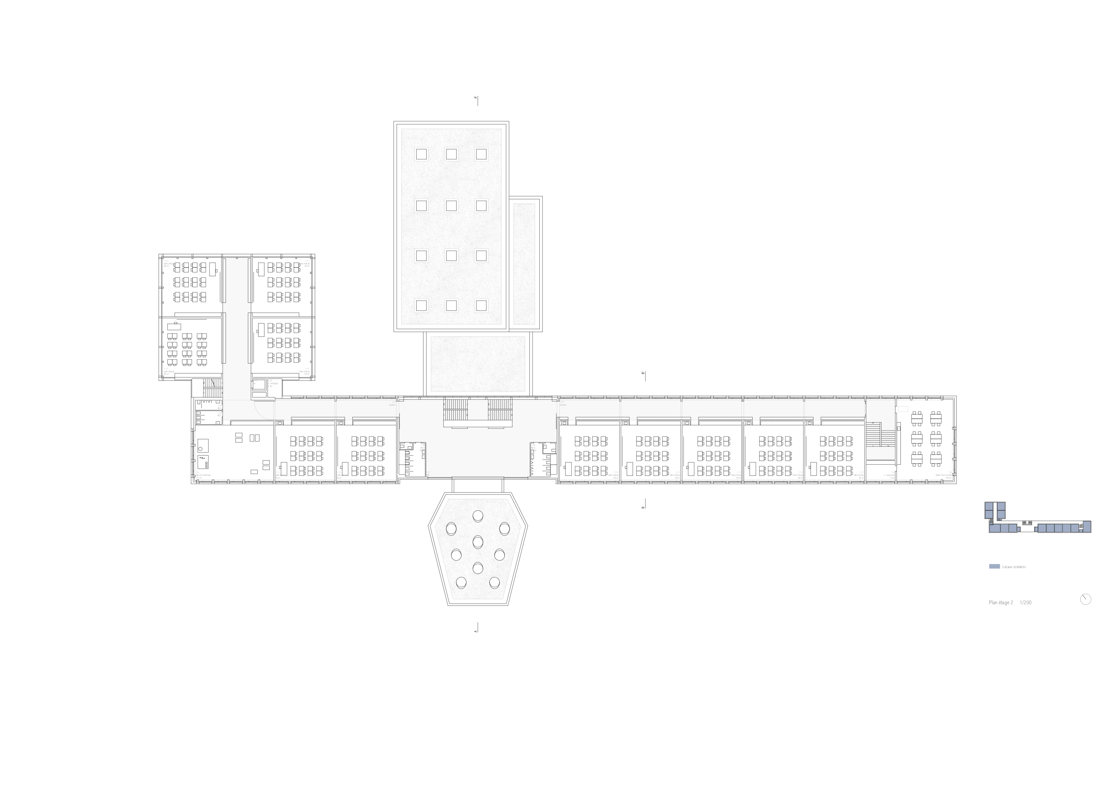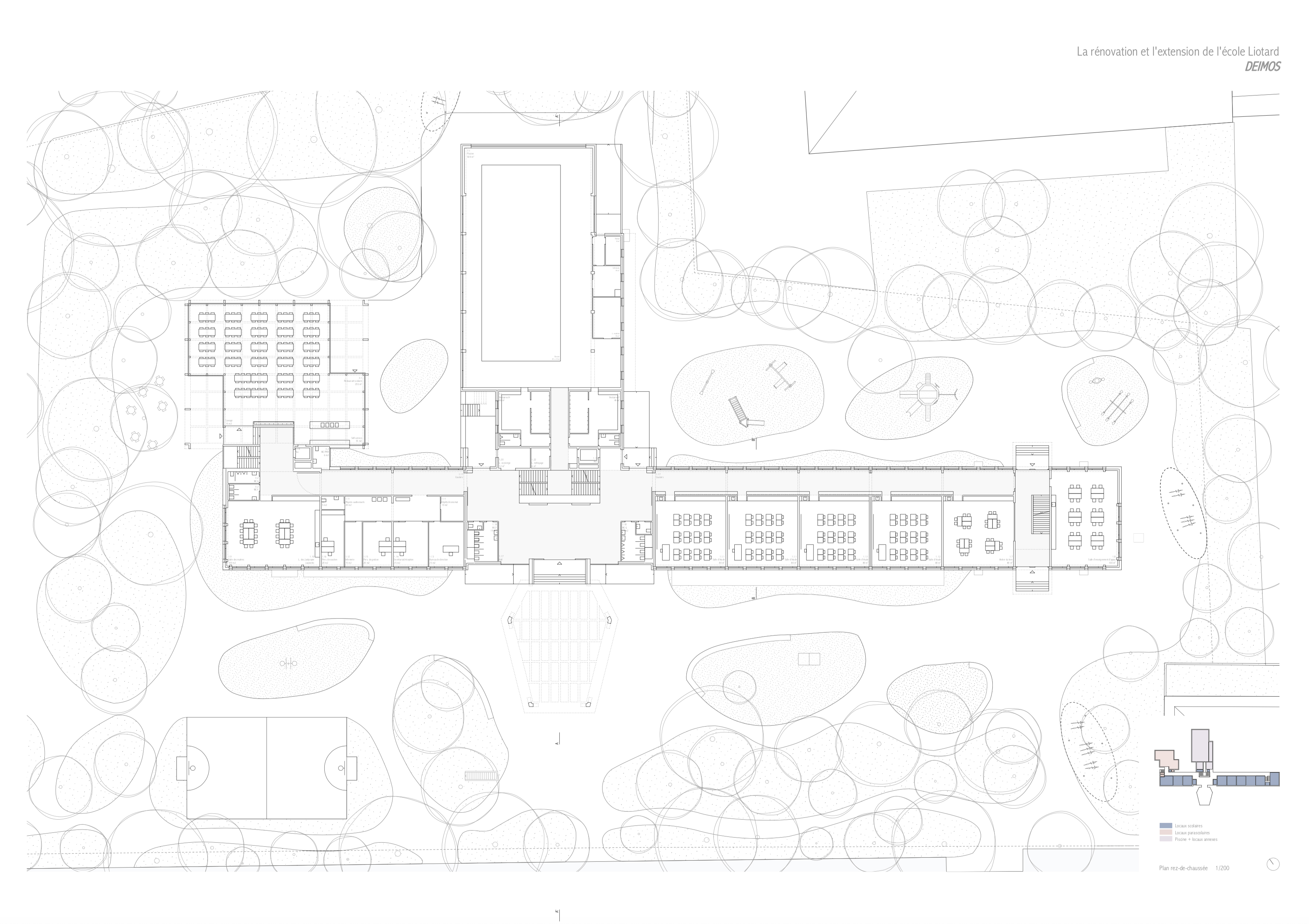 Le volume supplémentaire demandé par le programme s’insère entre la partie scolaire et la zone de verdure publique en relation avec le quartier environnant, renforçant le lien entre l'école et le quartier. Ce volume s’accroche à l’élément linéaire des salles de classe de la même manière que l’aula ou la salle de sport et la piscine. L’agrandissement accueille au rez-de-chaussée le réfectoire scolaire, situé de plain pied avec le niveau des aménagements extérieurs (préaux, jardin public); ce dernier profite ainsi d’une plus grande hauteur d’étage, en adéquation avec sa fonction et sa grande surface. L’élément linéaire principal accueille au rez-de-chaussée la partie administrative (salle des maîtres, secrétariat, direction, infirmerie) et les salles de classe dédiées aux petits degrés, en relation avec leur préau indépendant. Les étages supérieurs accueillent toutes les autres salles de classe du programme. Le traitement paysager du site est renforcé dans la nouvelle intervention. Il s’agit de percevoir une école dans un parc au cœur du quartier et non plus une école à côté du parc. Les préaux sont également intégrés au parc : les grandes surfaces minérales sont réduites pour les rendre plus perméables, en favorisant l’infiltration naturelle, tout en les rendant moins austères et plus accueillantes. Pour ne pas modifier l'aspect d'origine du corps principal, il est prévu de conserver la composition de type "cote de maille" ou "en damier" des façades existantes, tout en apportant les améliorations de rendement énergétique souhaitées.