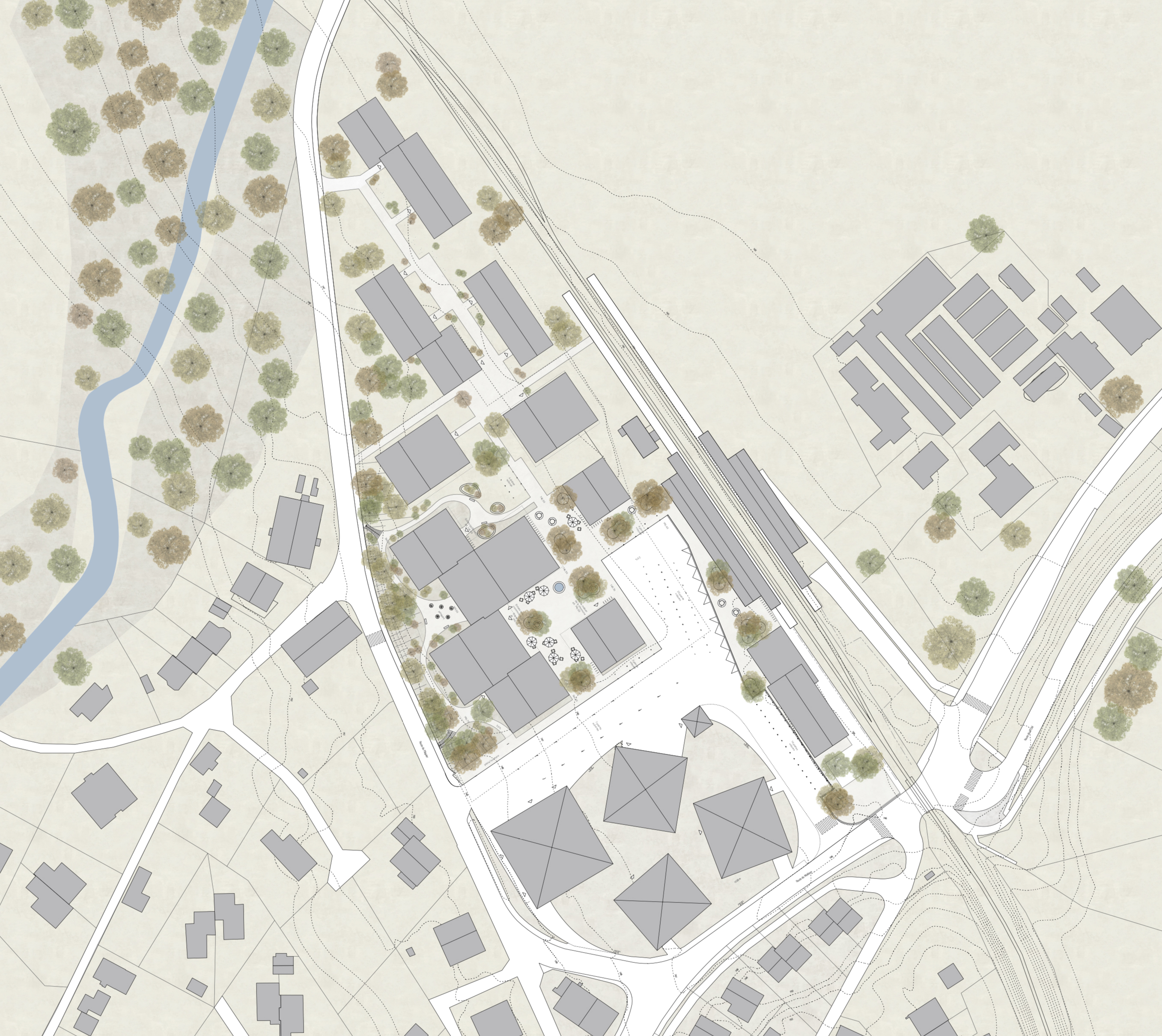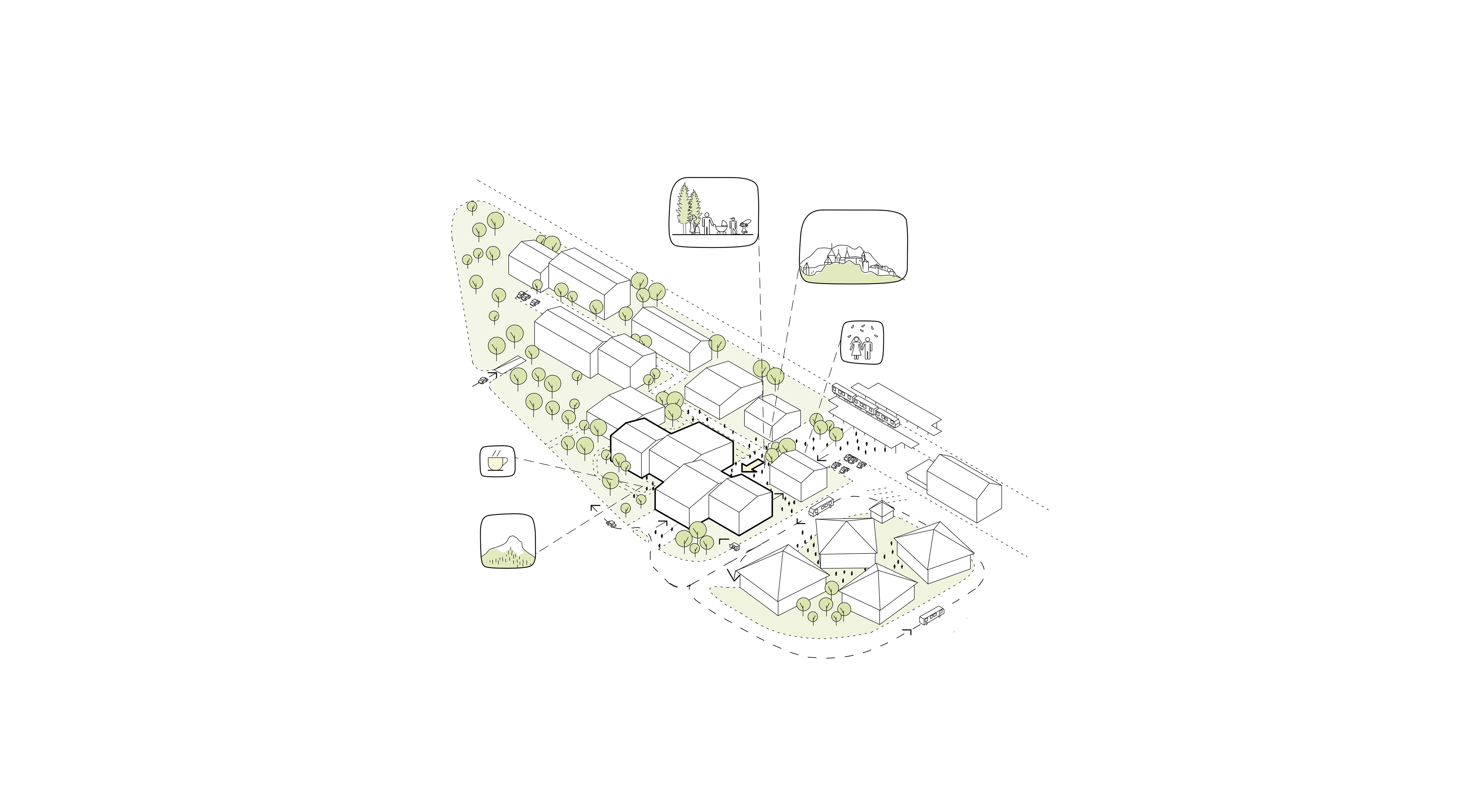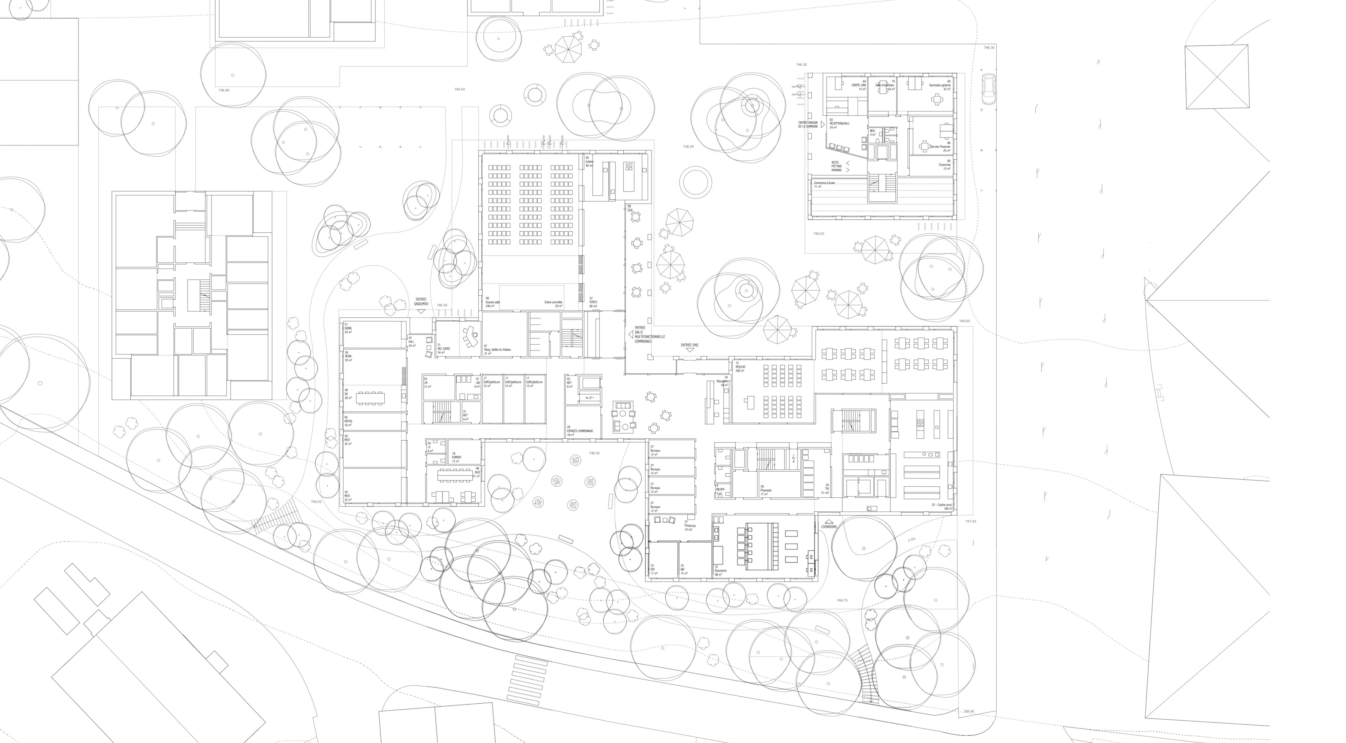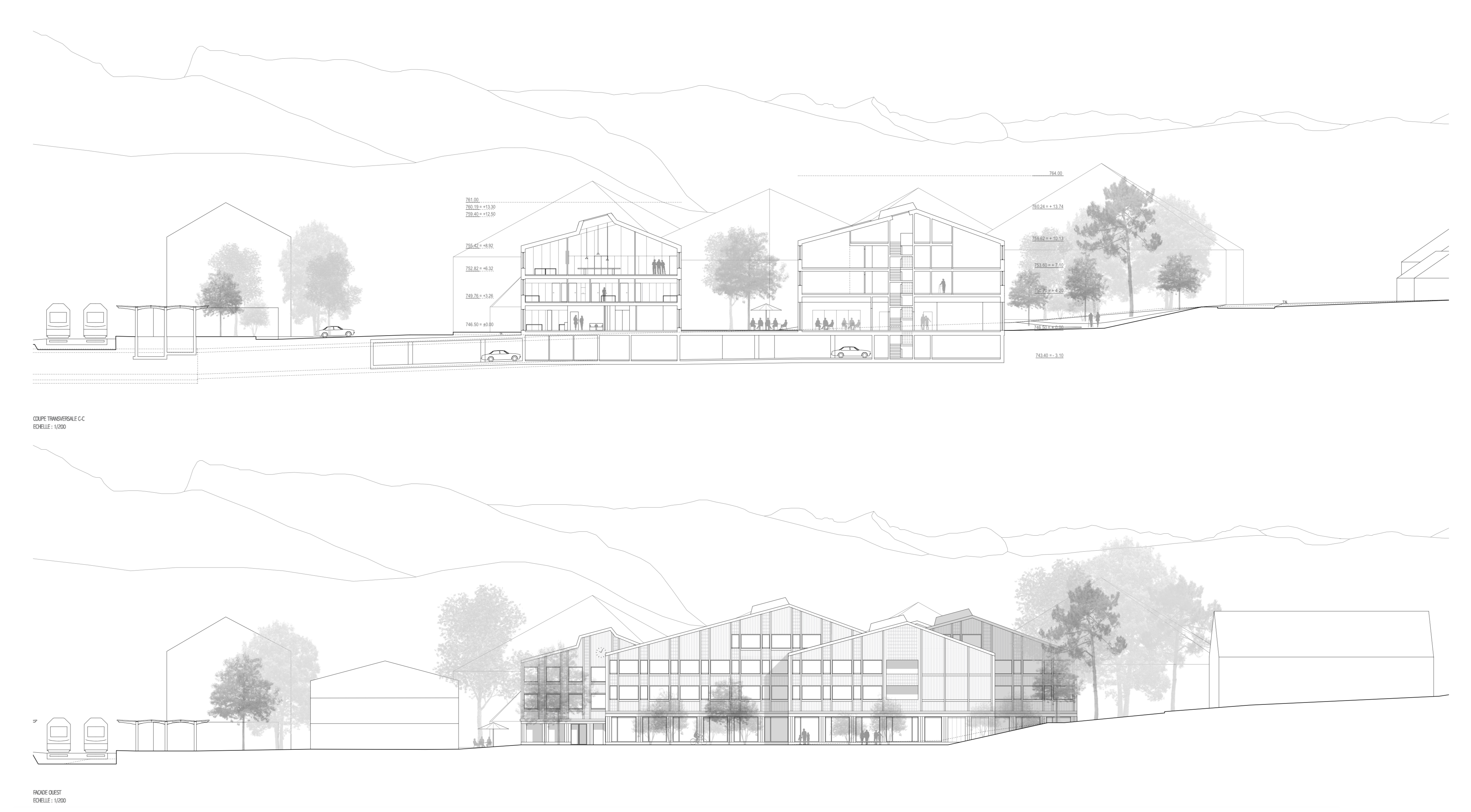 Le EMS est conçu comme un hameau regroupant des « maisonnées », qui, par un jeu de coulisses, crée des espaces extérieurs aux caractères bien différenciés. L’entrée principale de l’EMS est accessible à l’extrêmité sud de la nouvelle place du village arborisée. Le rez-de-chaussée accueille toutes les fonctions publiques et semi-publiques.La mixité de toutes les fonctions, réunies entre elles au rez-de-chaussée, en relation directe avec la place et les jardins, crée cet esprit de place de village où les échanges-rencontres sont riches et nombreux. Les unités de vie sont réparties sur deux niveaux, 2x 20 chambres par niveau. Les circulations horizontales se veulent fluides et bénéficient de tous côtés de vues sur l’extérieur et de lumière naturelle. En leur extrêmité, de petits séjours accompagnés de balcons, agrémentés de quelques fauteuils permettent une halte ouverte sur le jardin. Le bâtiment communal est au niveau urbain un bâtiment d’articulation entre les deux sous-espaces de la place publique de la gare et l’espace public plus protégé au sud où se trouvent les entrées au bâtiment communal, au parking souterrain, à l’EMS et à la salle communale. Le bâtiment est organisé sur trois niveaux : le rez-de-chaussée avec les bureaux de l’administration publique et un commerce à louer (ex : boulangerie, tea-room, autre), le premier étage avec le solde des bureaux de l’administration et des surfaces à louer, et le deuxième étage, dans un espace de combles accueillant les salles représentatives de la commune. La structure porteuse prévue, tout en étant en bois, rend possible les adaptations, les rocades selon l’évolution des besoins.