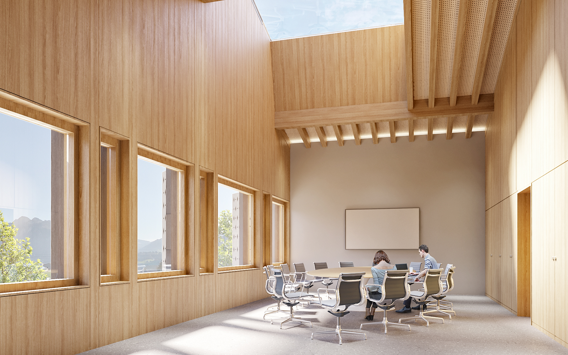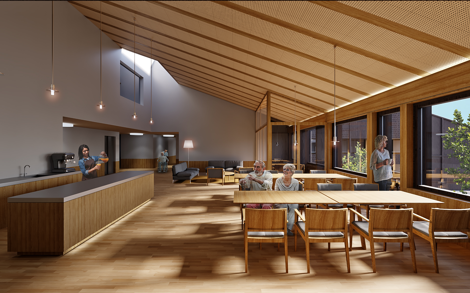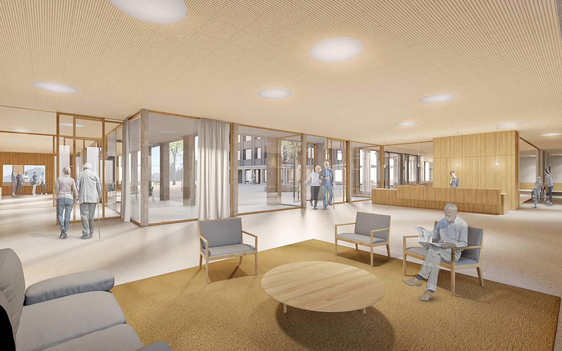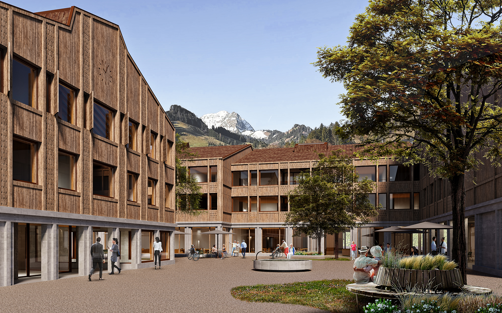Le EMS est conçu comme un hameau regroupant des « maisonnées », qui, par un jeu de coulisses, crée des espaces extérieurs aux caractères bien différenciés. L’entrée principale de l’EMS est accessible à l’extrêmité sud de la nouvelle place du village arborisée. Le rez-de-chaussée accueille toutes les fonctions publiques et semi-publiques.La mixité de toutes les fonctions, réunies entre elles au rez-de-chaussée, en relation directe avec la place et les jardins, crée cet esprit de place de village où les échanges-rencontres sont riches et nombreux. Les unités de vie sont réparties sur deux niveaux, 2x 20 chambres par niveau. Les circulations horizontales se veulent fluides et bénéficient de tous côtés de vues sur l’extérieur et de lumière naturelle. En leur extrêmité, de petits séjours accompagnés de balcons, agrémentés de quelques fauteuils permettent une halte ouverte sur le jardin. Le bâtiment communal est au niveau urbain un bâtiment d’articulation entre les deux sous-espaces de la place publique de la gare et l’espace public plus protégé au sud où se trouvent les entrées au bâtiment communal, au parking souterrain, à l’EMS et à la salle communale. Le bâtiment est organisé sur trois niveaux : le rez-de-chaussée avec les bureaux de l’administration publique et un commerce à louer (ex : boulangerie, tea-room, autre), le premier étage avec le solde des bureaux de l’administration et des surfaces à louer, et le deuxième étage, dans un espace de combles accueillant les salles représentatives de la commune. La structure porteuse prévue, tout en étant en bois, rend possible les adaptations, les rocades selon l’évolution des besoins.