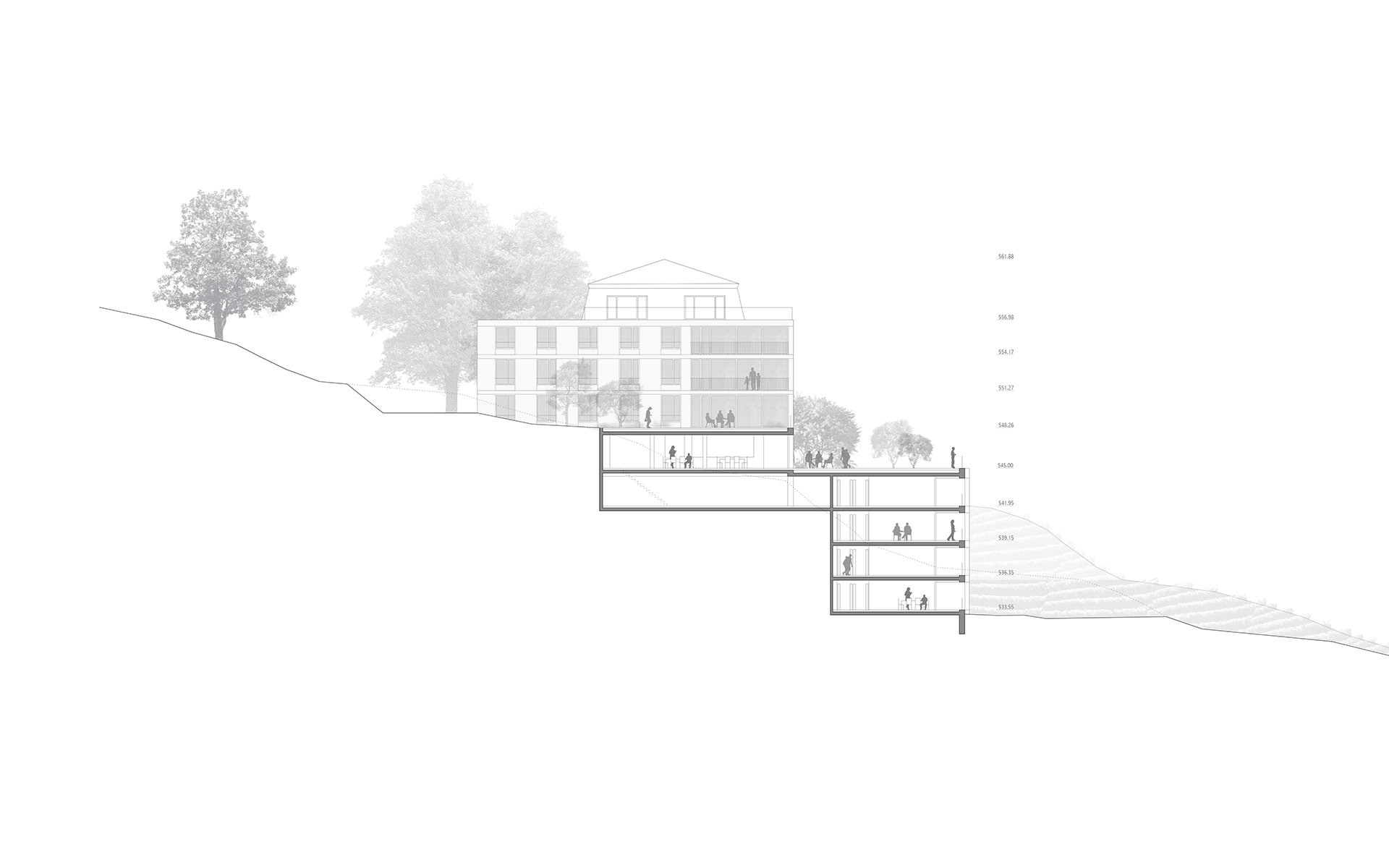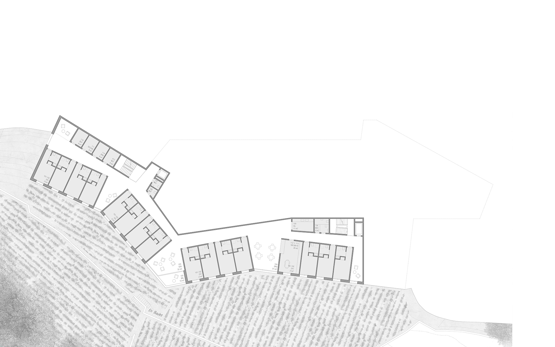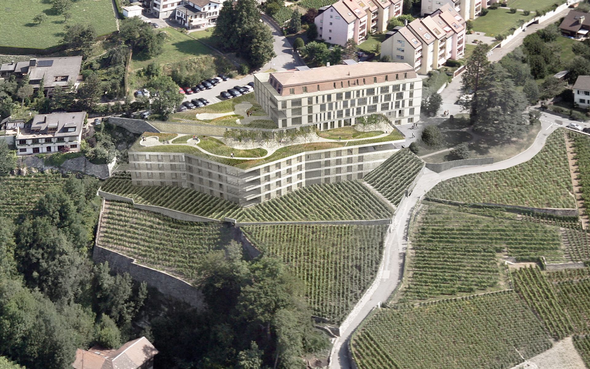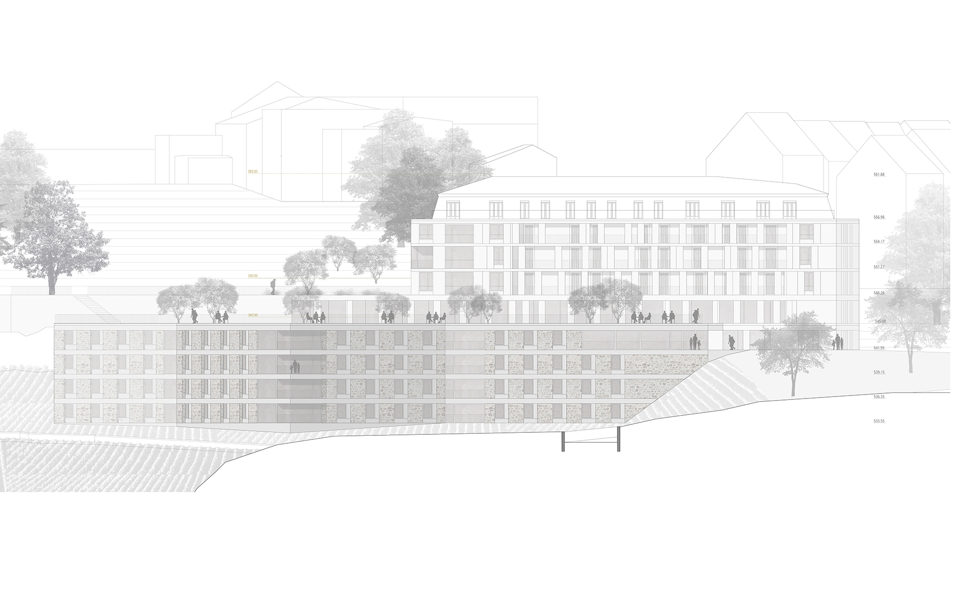 L’EMS de la Colline se situe au sud du village de Chexbres, en bordure d’un coteau de vignes dominant avantageusement le lac et le panorama des Alpes françaises. Le projet prévoit de déplacer en contrebas l’entrée actuelle, accessible depuis une nouvelle esplanade ouverte sur le paysage. Les 60 chambres des nouvelles unités de vie se situent à l’emplacement de l’ancien mur de soutènement au sud-ouest, au droit de la rupture de pente entre le complexe bâti et le vignoble situé en contrebas. L’implantation et le dessin des façades de cette extension reprennent le dessin en lignes brisées et la matérialité des murs de vignes qui construisent les pentes du vignoble de Lavaux. L’organisation intérieure du bâtiment existant est remaniée et simplifiée, notamment les espaces de circulations qui proposent des espaces de dégagement devant les ascenseurs, les escaliers ou le long des couloirs de distribution des chambres. Le hall d’entrée met en relation toutes les parties du programme au travers d’espaces différenciés ouverts à la vue ou en communication visuelle avec la salle commune à l’étage. Cette salle à manger jouit d’une vaste terrasse extérieure ouverte sur le paysage du Léman et du vignoble.