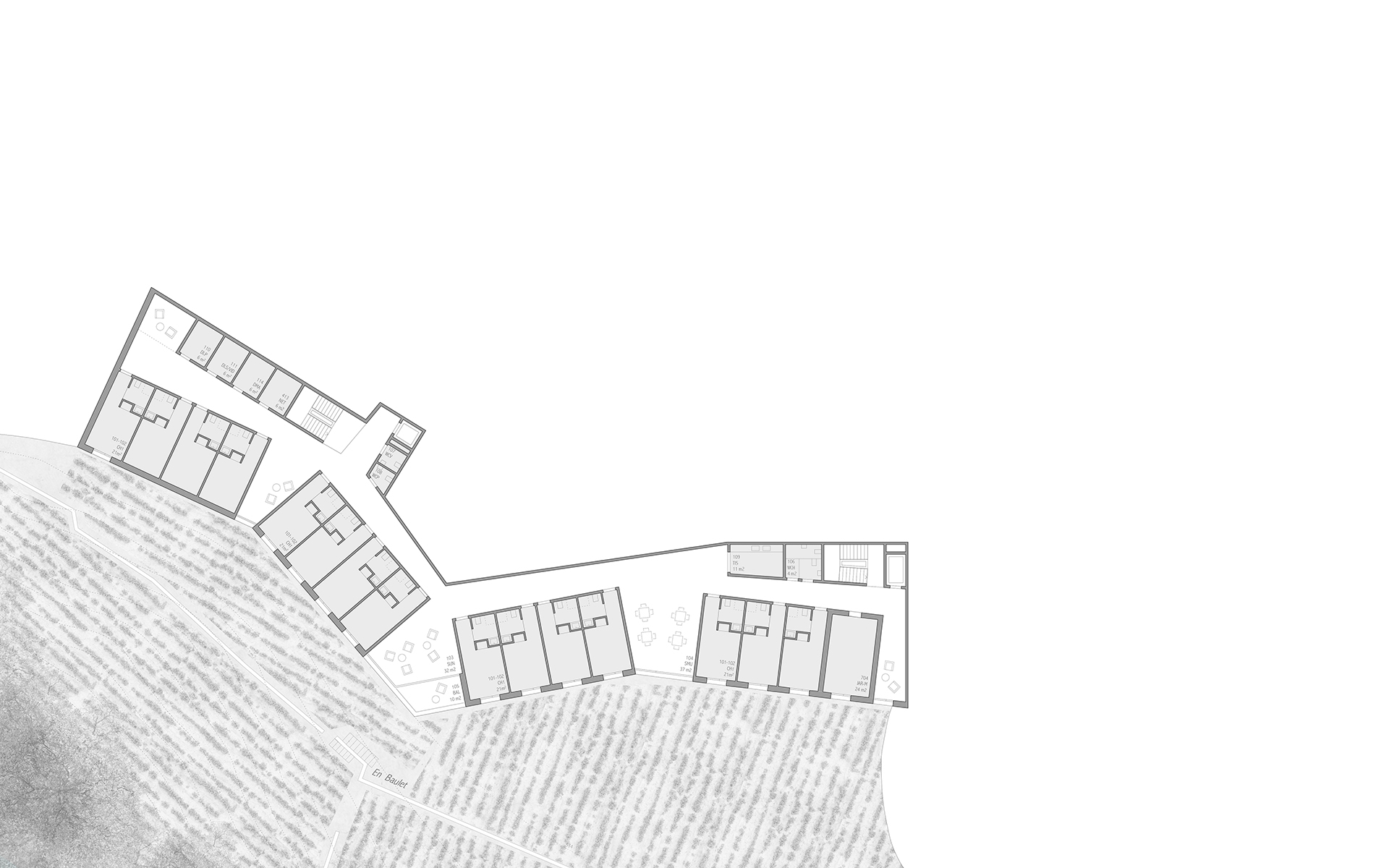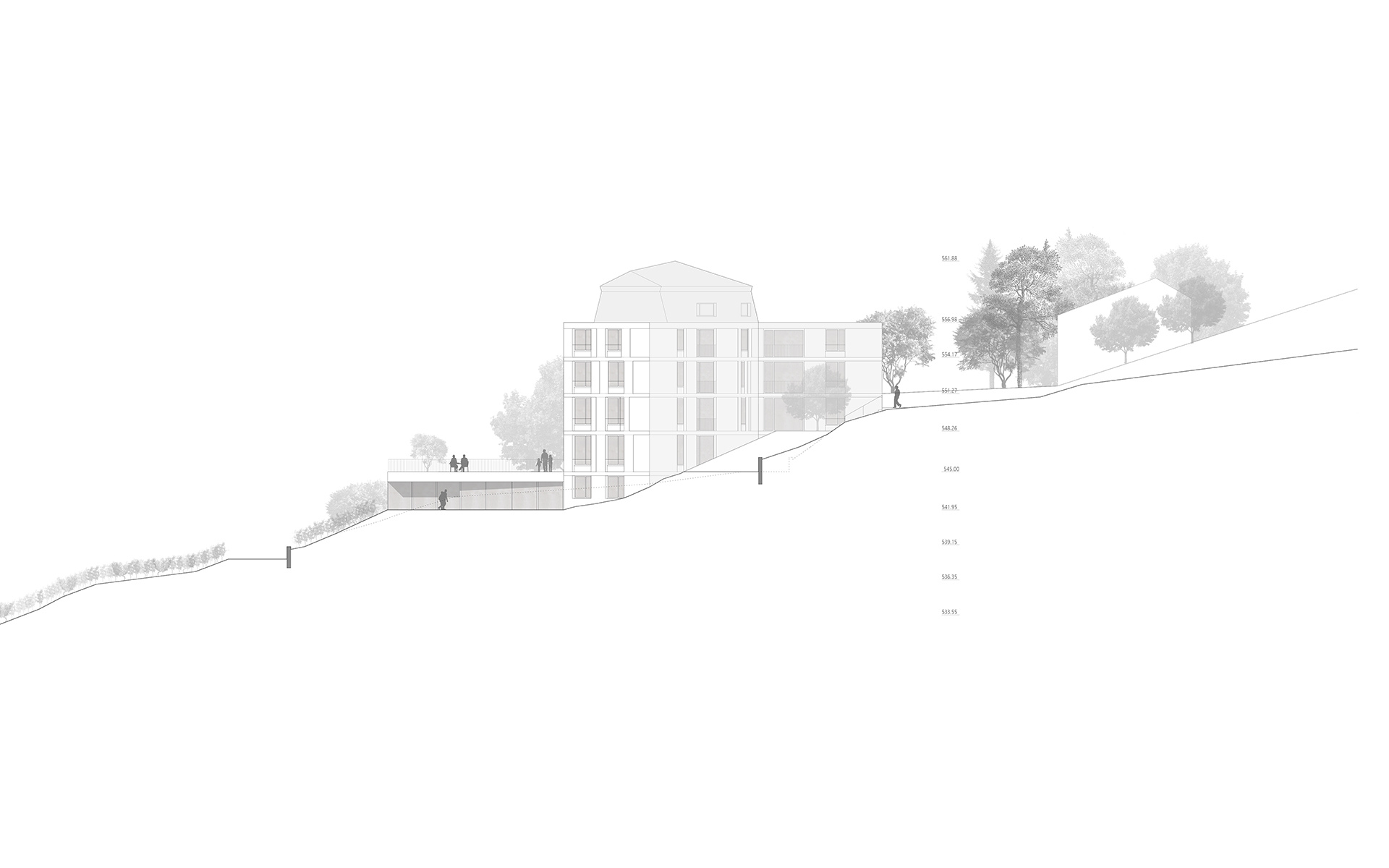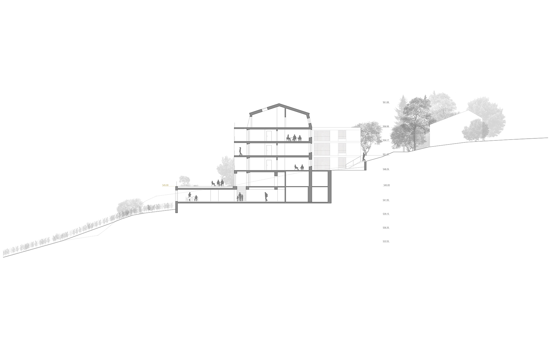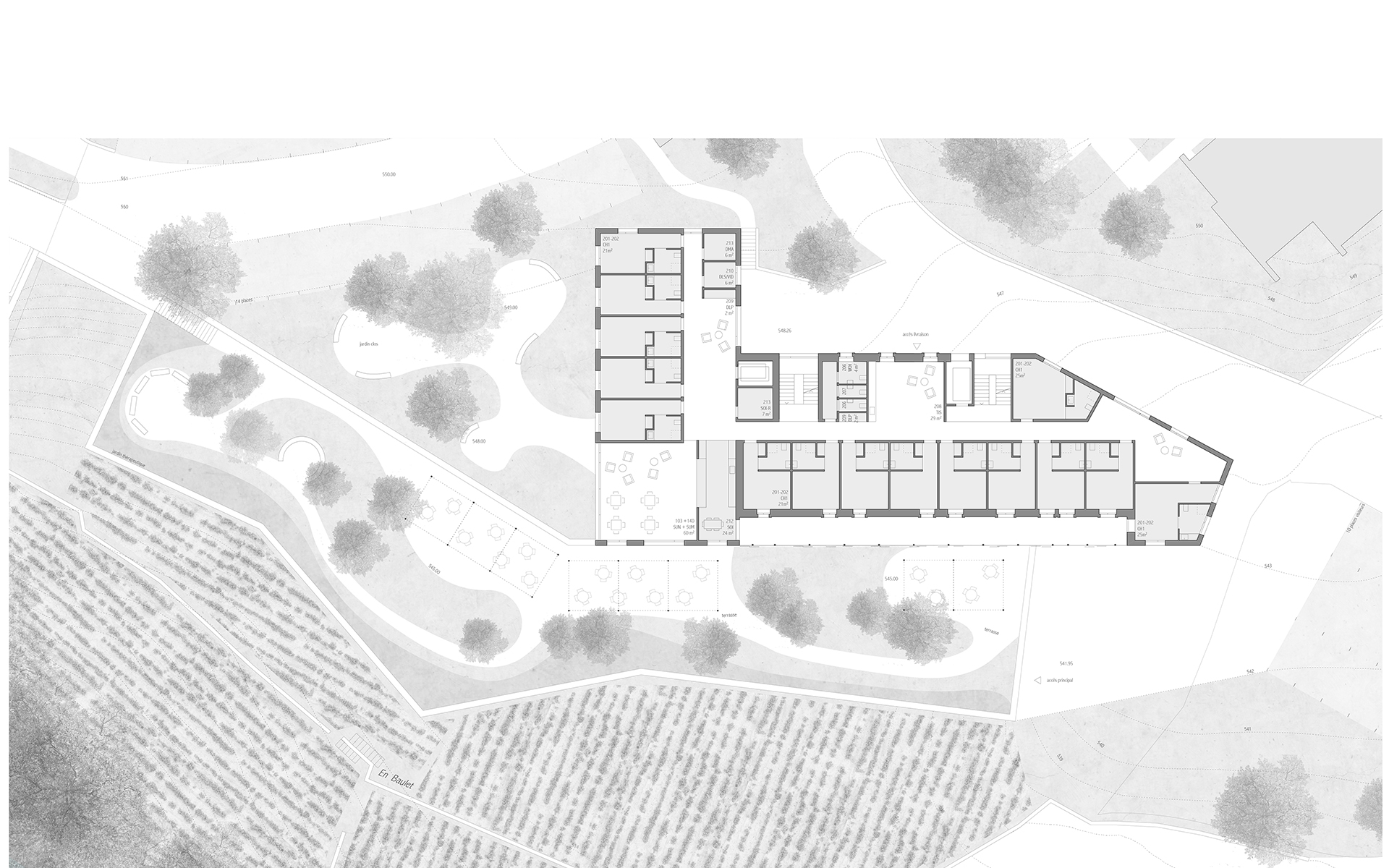 L’EMS de la Colline se situe au sud du village de Chexbres, en bordure d’un coteau de vignes dominant avantageusement le lac et le panorama des Alpes françaises. Le projet prévoit de déplacer en contrebas l’entrée actuelle, accessible depuis une nouvelle esplanade ouverte sur le paysage. Les 60 chambres des nouvelles unités de vie se situent à l’emplacement de l’ancien mur de soutènement au sud-ouest, au droit de la rupture de pente entre le complexe bâti et le vignoble situé en contrebas. L’implantation et le dessin des façades de cette extension reprennent le dessin en lignes brisées et la matérialité des murs de vignes qui construisent les pentes du vignoble de Lavaux. L’organisation intérieure du bâtiment existant est remaniée et simplifiée, notamment les espaces de circulations qui proposent des espaces de dégagement devant les ascenseurs, les escaliers ou le long des couloirs de distribution des chambres. Le hall d’entrée met en relation toutes les parties du programme au travers d’espaces différenciés ouverts à la vue ou en communication visuelle avec la salle commune à l’étage. Cette salle à manger jouit d’une vaste terrasse extérieure ouverte sur le paysage du Léman et du vignoble.