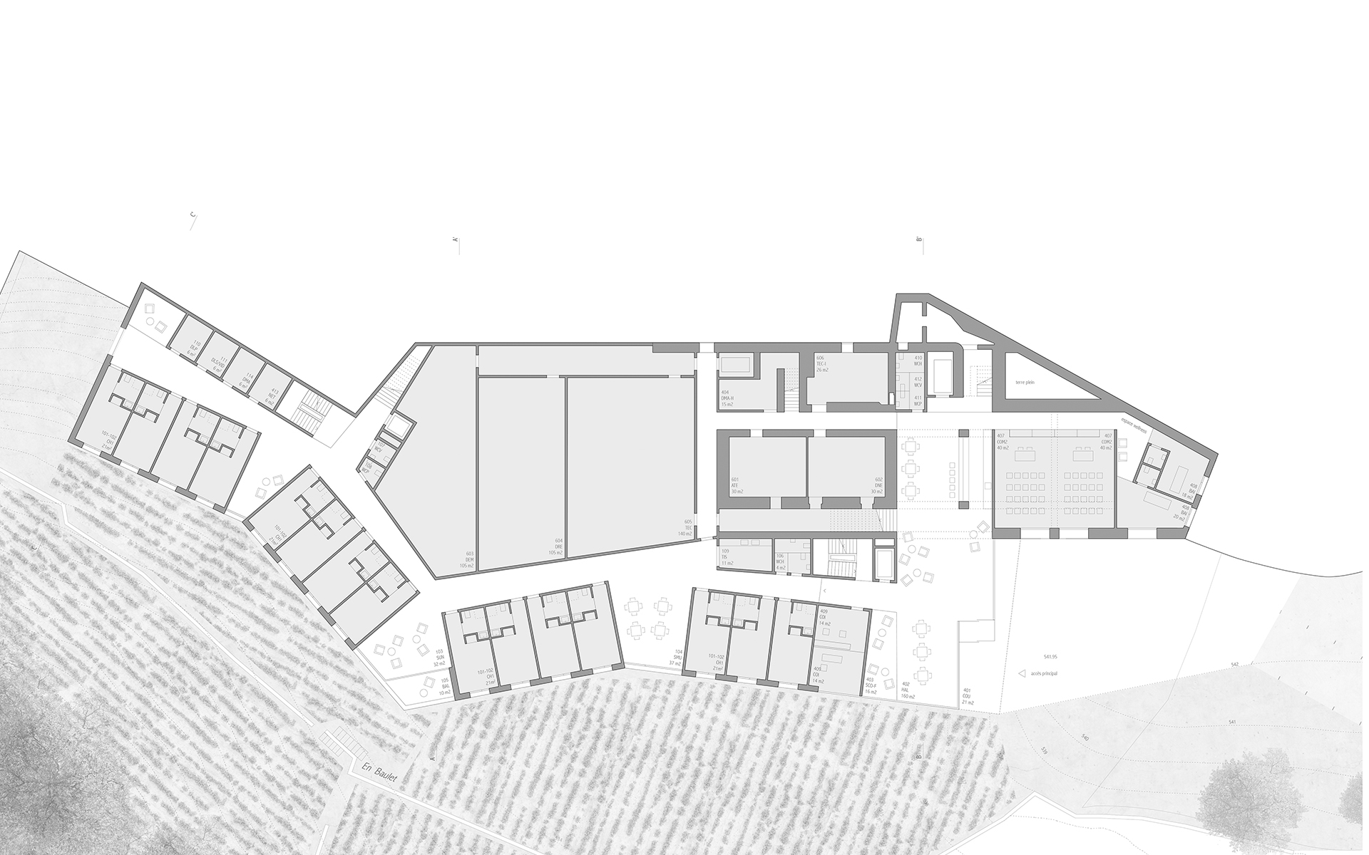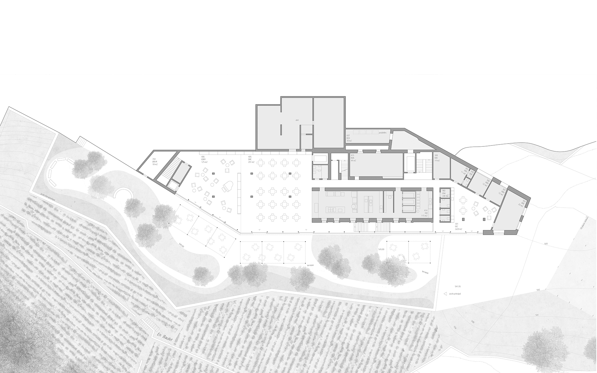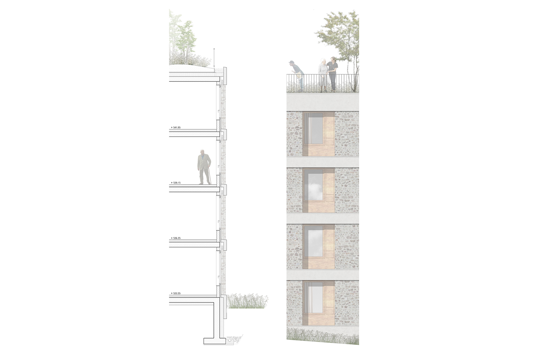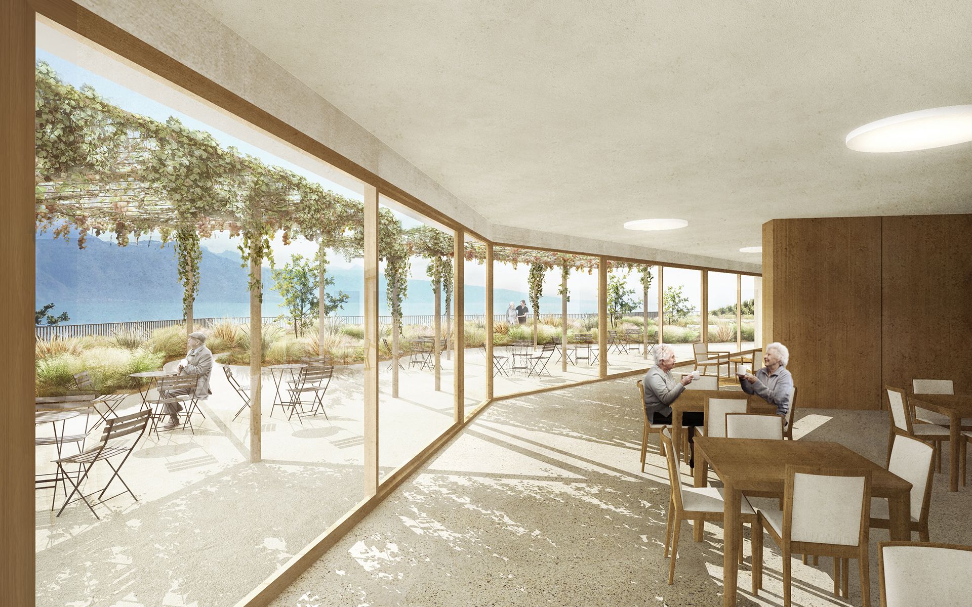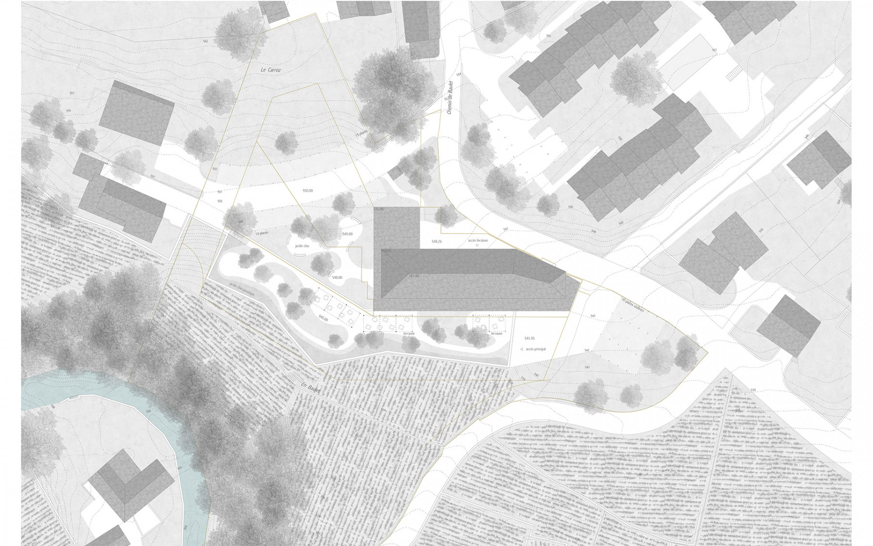 L’EMS de la Colline se situe au sud du village de Chexbres, en bordure d’un coteau de vignes dominant avantageusement le lac et le panorama des Alpes françaises. Le projet prévoit de déplacer en contrebas l’entrée actuelle, accessible depuis une nouvelle esplanade ouverte sur le paysage. Les 60 chambres des nouvelles unités de vie se situent à l’emplacement de l’ancien mur de soutènement au sud-ouest, au droit de la rupture de pente entre le complexe bâti et le vignoble situé en contrebas. L’implantation et le dessin des façades de cette extension reprennent le dessin en lignes brisées et la matérialité des murs de vignes qui construisent les pentes du vignoble de Lavaux. L’organisation intérieure du bâtiment existant est remaniée et simplifiée, notamment les espaces de circulations qui proposent des espaces de dégagement devant les ascenseurs, les escaliers ou le long des couloirs de distribution des chambres. Le hall d’entrée met en relation toutes les parties du programme au travers d’espaces différenciés ouverts à la vue ou en communication visuelle avec la salle commune à l’étage. Cette salle à manger jouit d’une vaste terrasse extérieure ouverte sur le paysage du Léman et du vignoble.