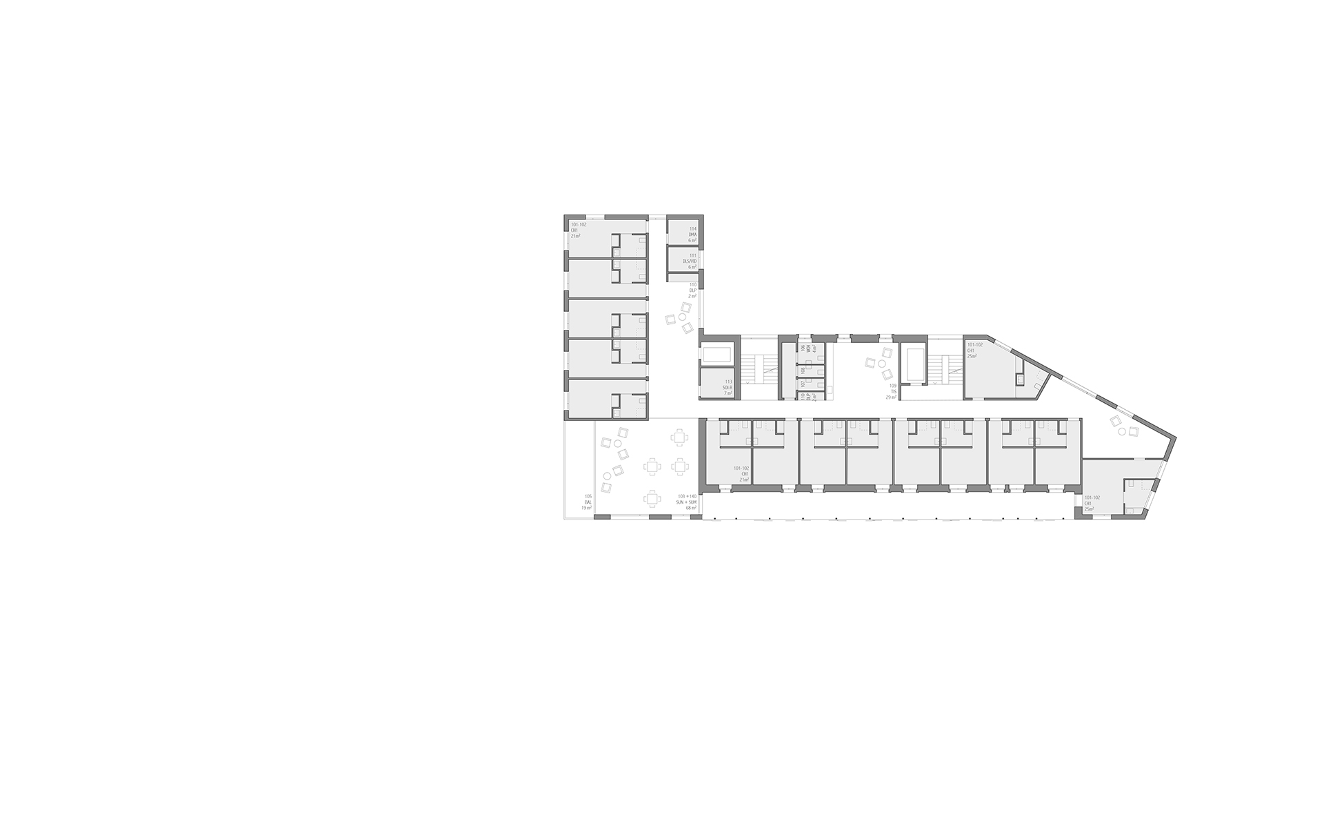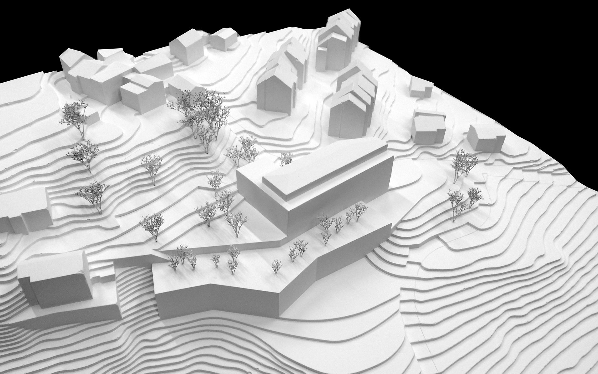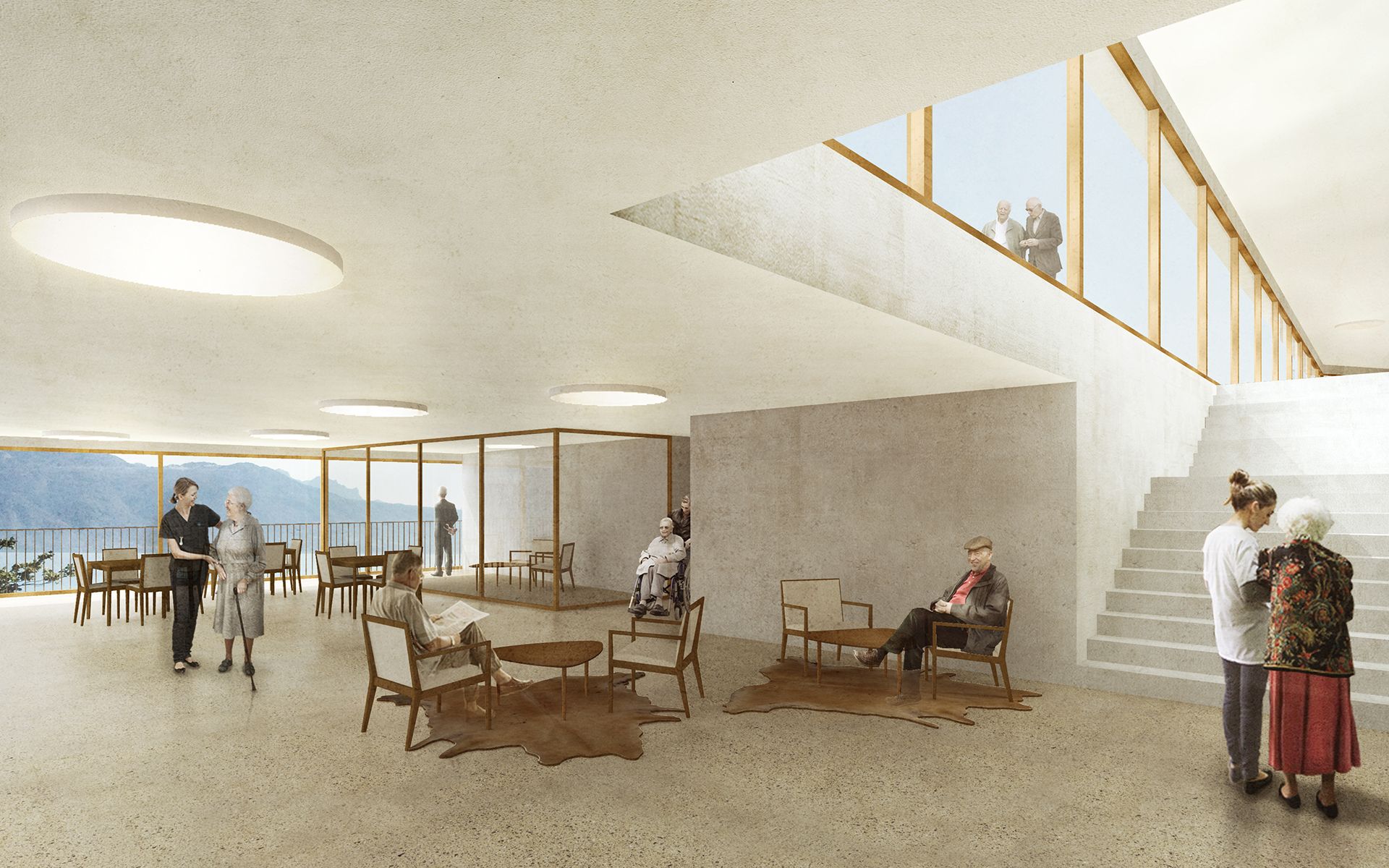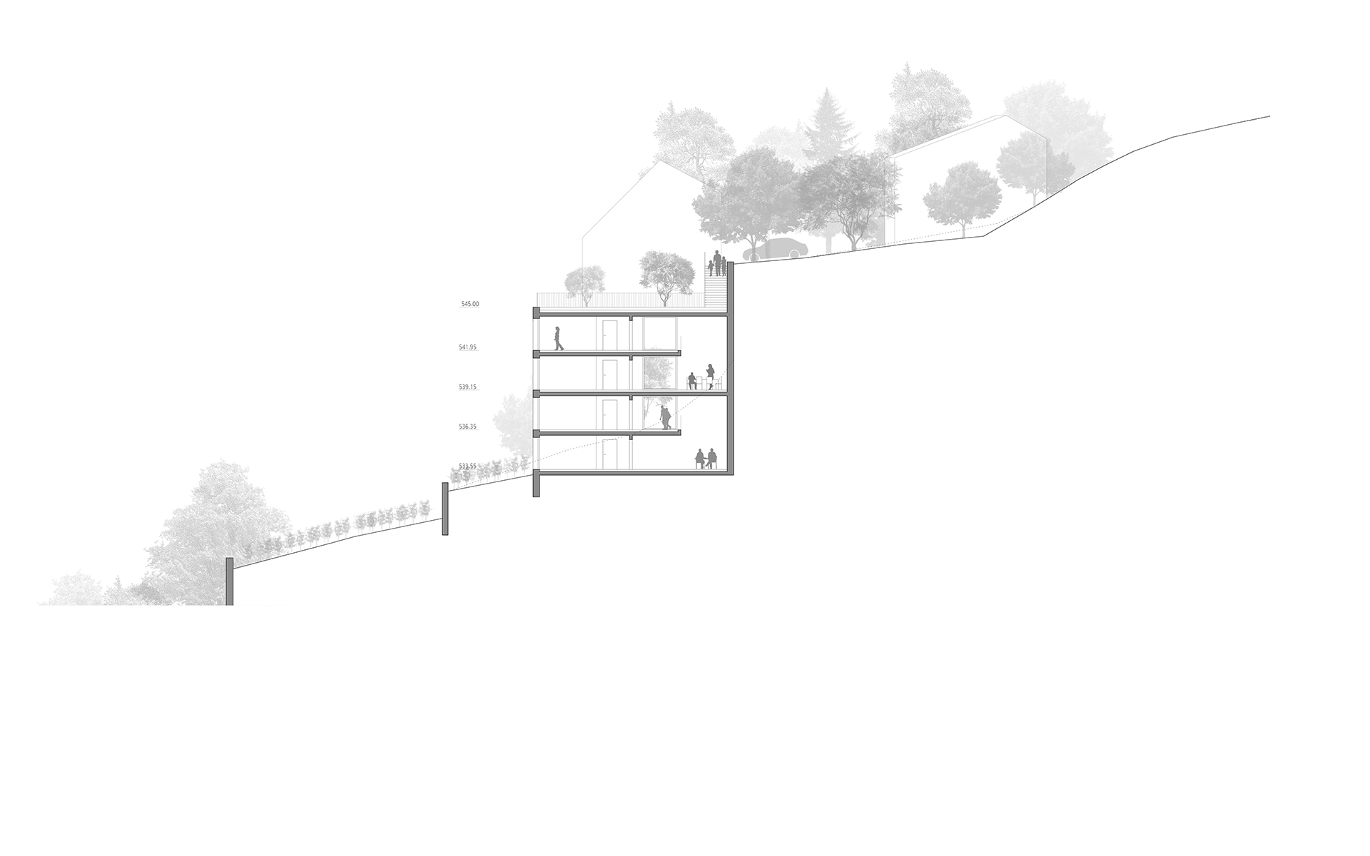 L’EMS de la Colline se situe au sud du village de Chexbres, en bordure d’un coteau de vignes dominant avantageusement le lac et le panorama des Alpes françaises. Le projet prévoit de déplacer en contrebas l’entrée actuelle, accessible depuis une nouvelle esplanade ouverte sur le paysage. Les 60 chambres des nouvelles unités de vie se situent à l’emplacement de l’ancien mur de soutènement au sud-ouest, au droit de la rupture de pente entre le complexe bâti et le vignoble situé en contrebas. L’implantation et le dessin des façades de cette extension reprennent le dessin en lignes brisées et la matérialité des murs de vignes qui construisent les pentes du vignoble de Lavaux. L’organisation intérieure du bâtiment existant est remaniée et simplifiée, notamment les espaces de circulations qui proposent des espaces de dégagement devant les ascenseurs, les escaliers ou le long des couloirs de distribution des chambres. Le hall d’entrée met en relation toutes les parties du programme au travers d’espaces différenciés ouverts à la vue ou en communication visuelle avec la salle commune à l’étage. Cette salle à manger jouit d’une vaste terrasse extérieure ouverte sur le paysage du Léman et du vignoble.