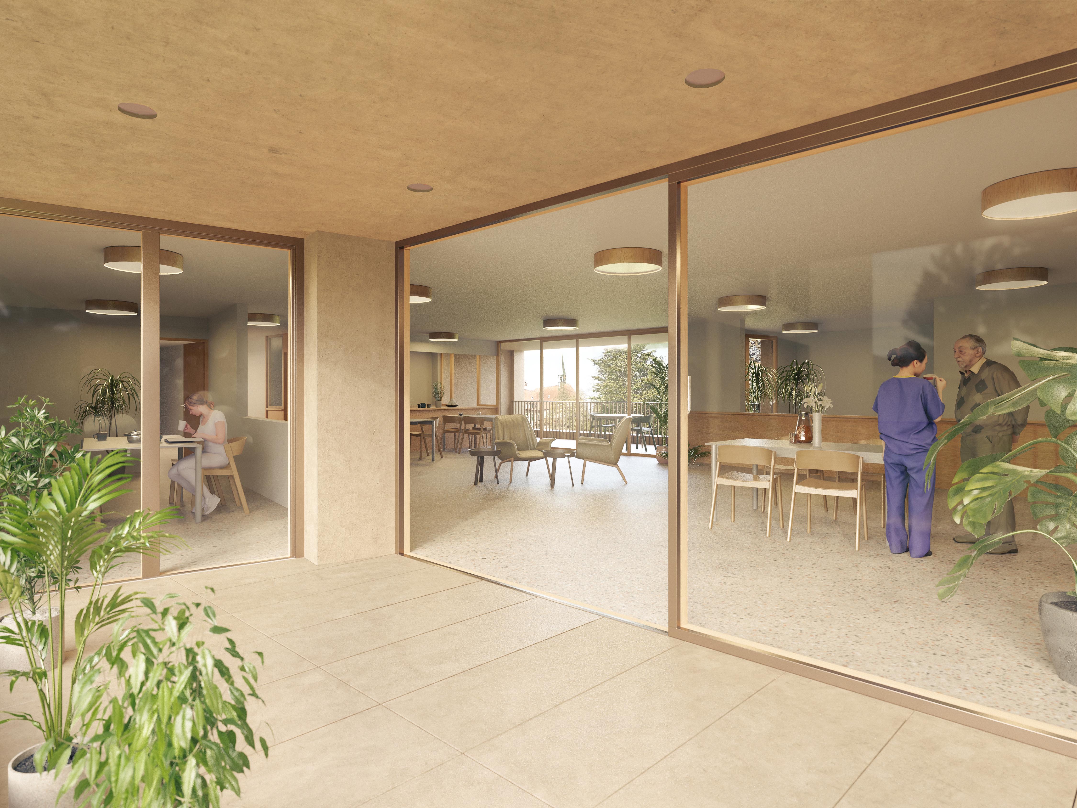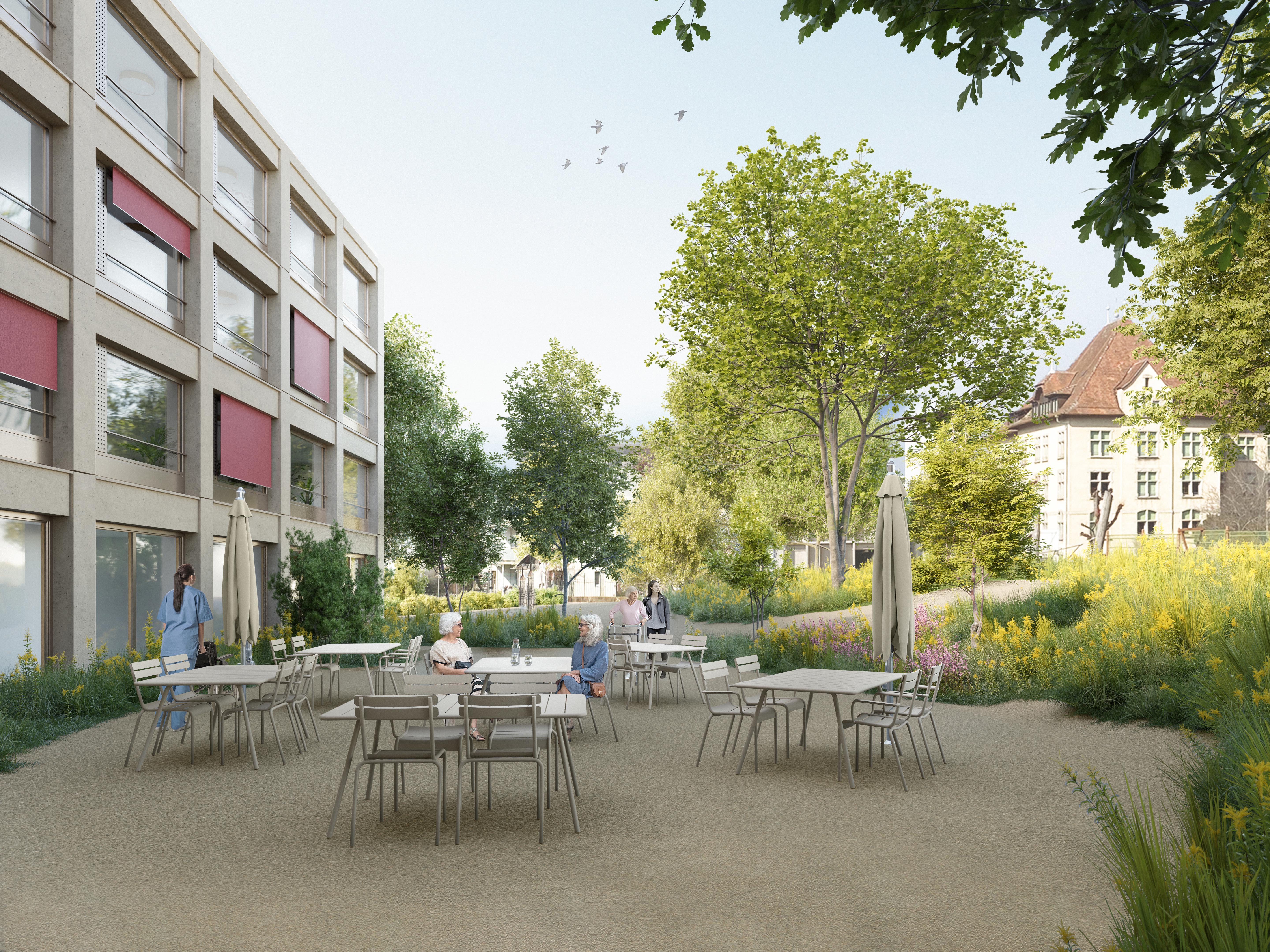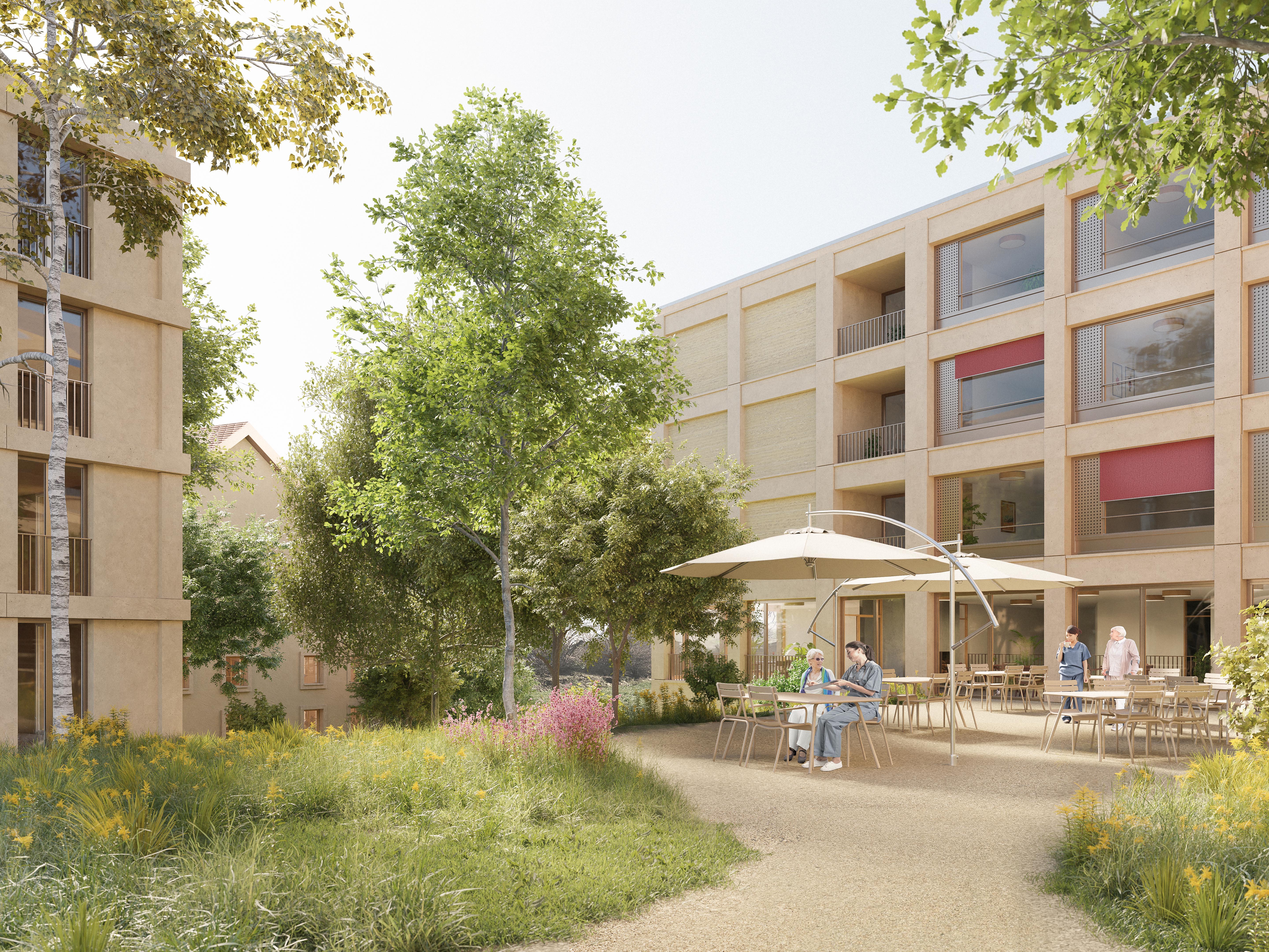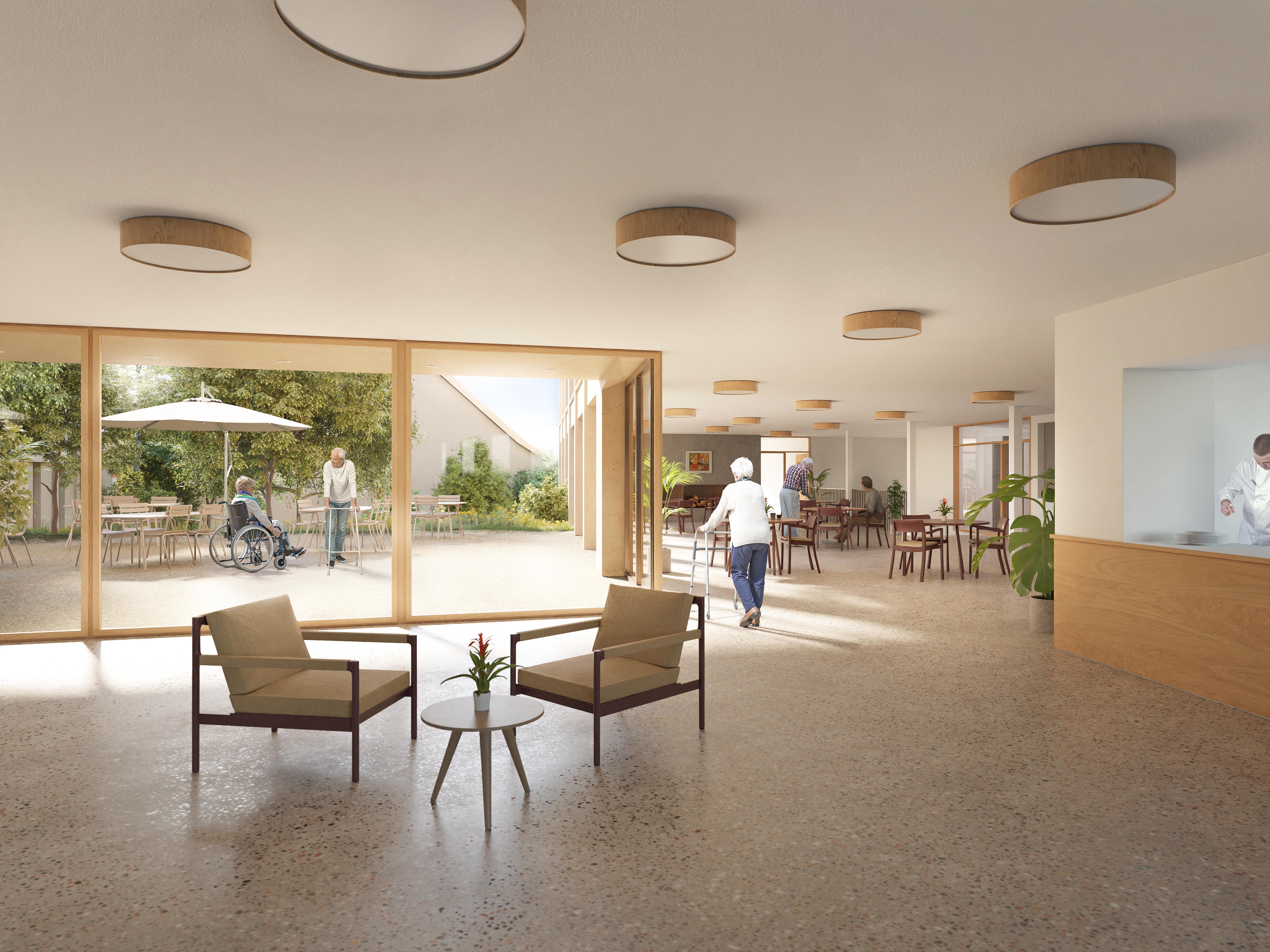 Le bâtiment de l’EMS définit un espace représentatif et doit, par conséquent, être ouvert et assurer le lien entre le quartier de la gare et l’école du Sacré-Coeur ainsi que la cité historique, tout en respectant l’intimité de sa fonction de résidence médicalisée pour anciens, immergée dans un grand parc nouvellement créé. La morphologie proposée, de forme compacte et réduite à l’essentiel, permet de dégager de part et d’autre du site de généreux espaces de jardin et des terrasses qui prolongent les différentes activités des parties communes. L’insertion naturelle dans le terrain en pente permet de dégager un niveau d’entrée situé de plain-pied et un niveau de jardin à l’étage supérieur sur lequel s’ouvrent les locaux les plus publics (restaurant, cafeteria, salle polyvalente, foyer de jour, etc.). Les unités de vie de 30 chambres chacune sont ensuite réparties sur les 3 étages restants. La forme de « 8 » qui résulte de la morphologie proposée permet de réduire l’impact du volume et ses longueurs de façades, tout en gardant à l’intérieur des parcours en boucles pour les résidents.