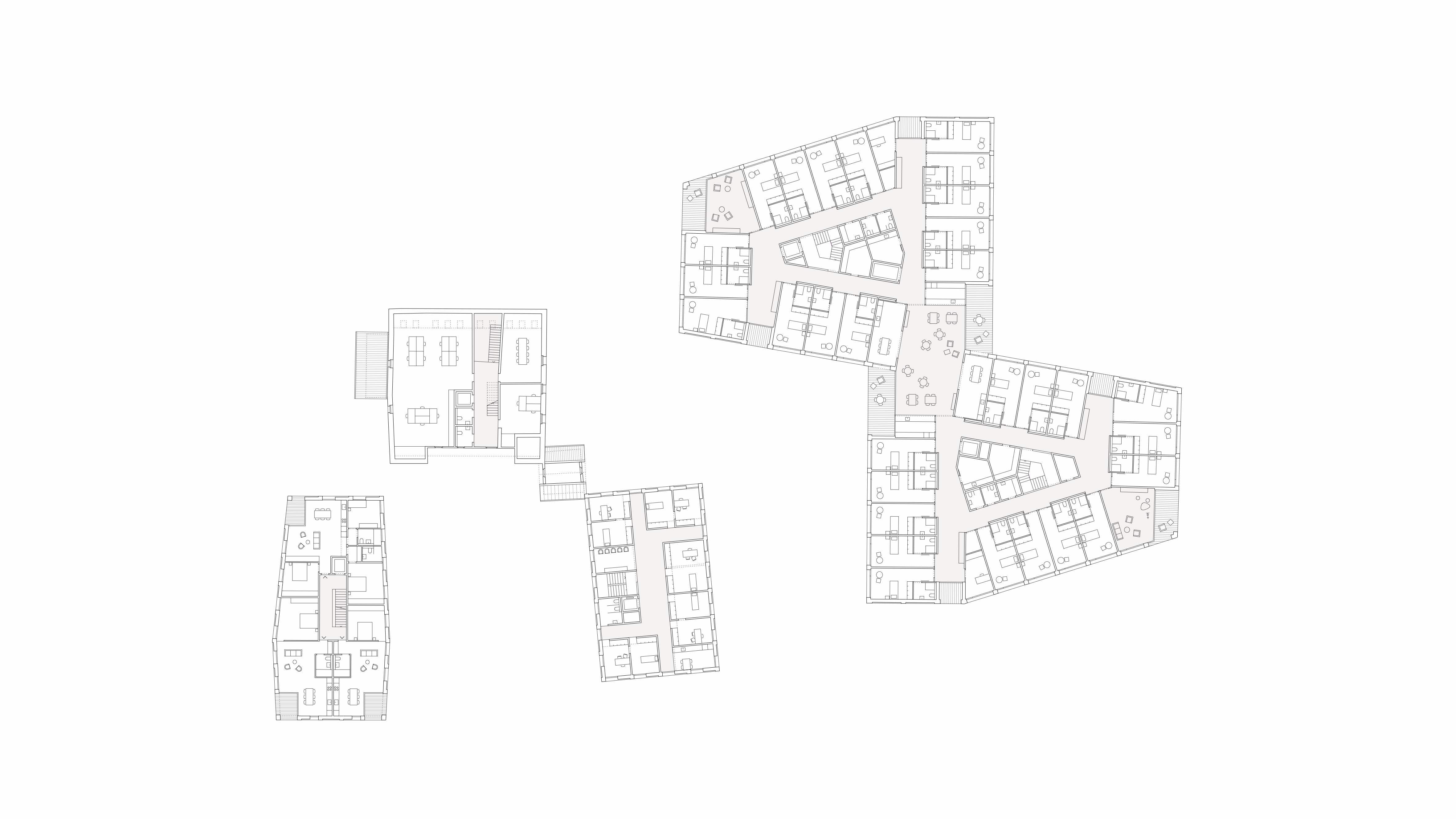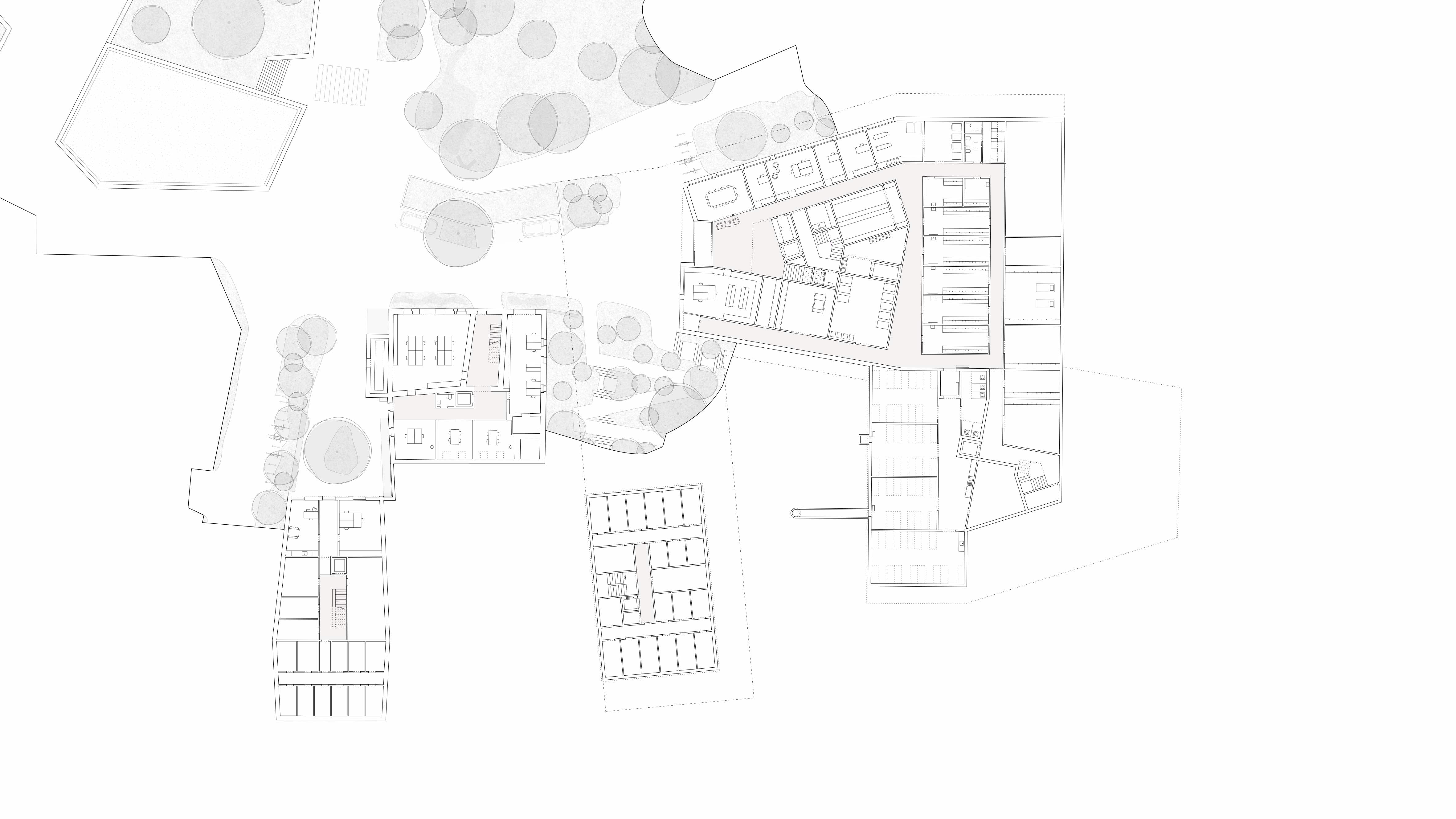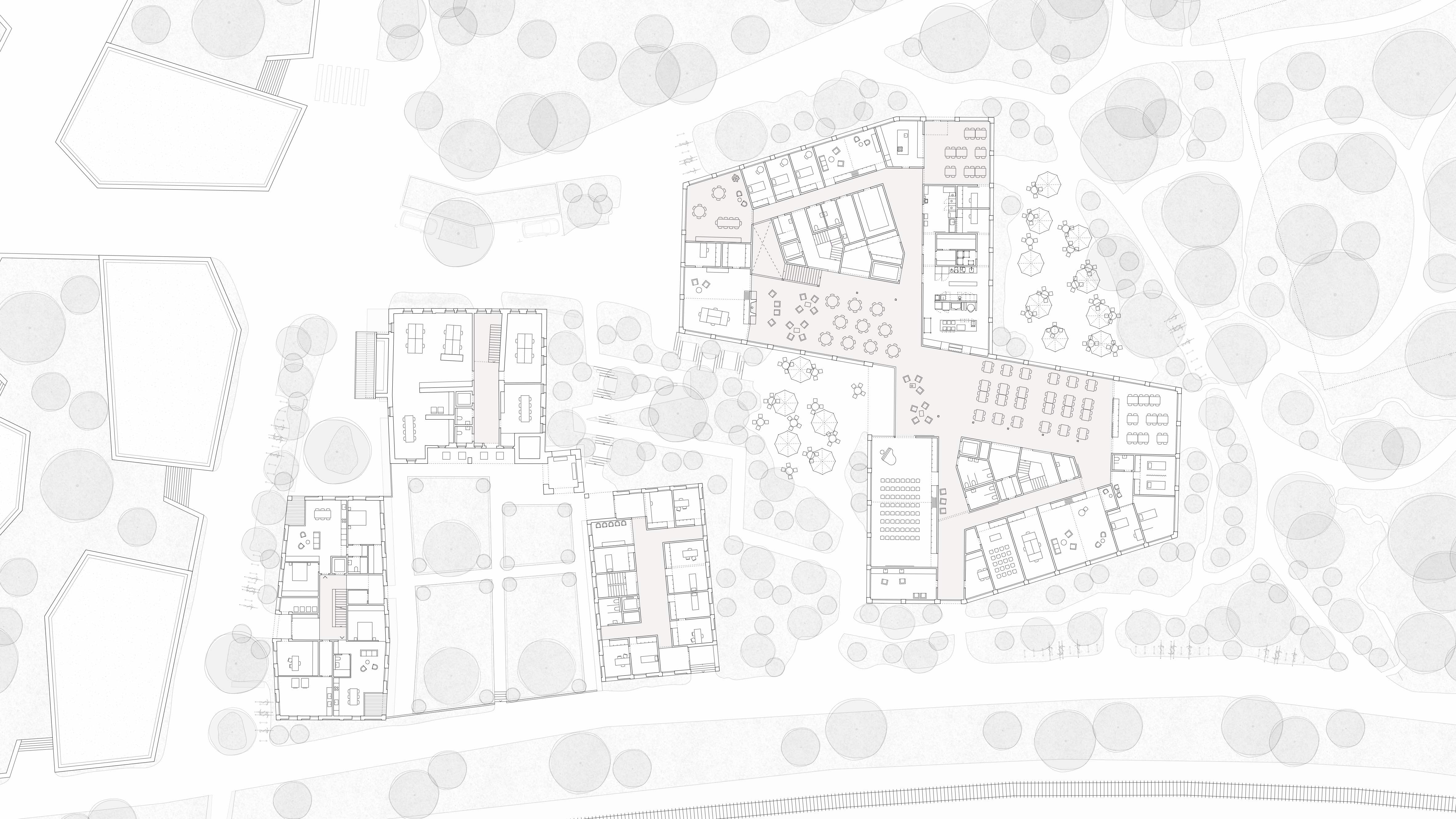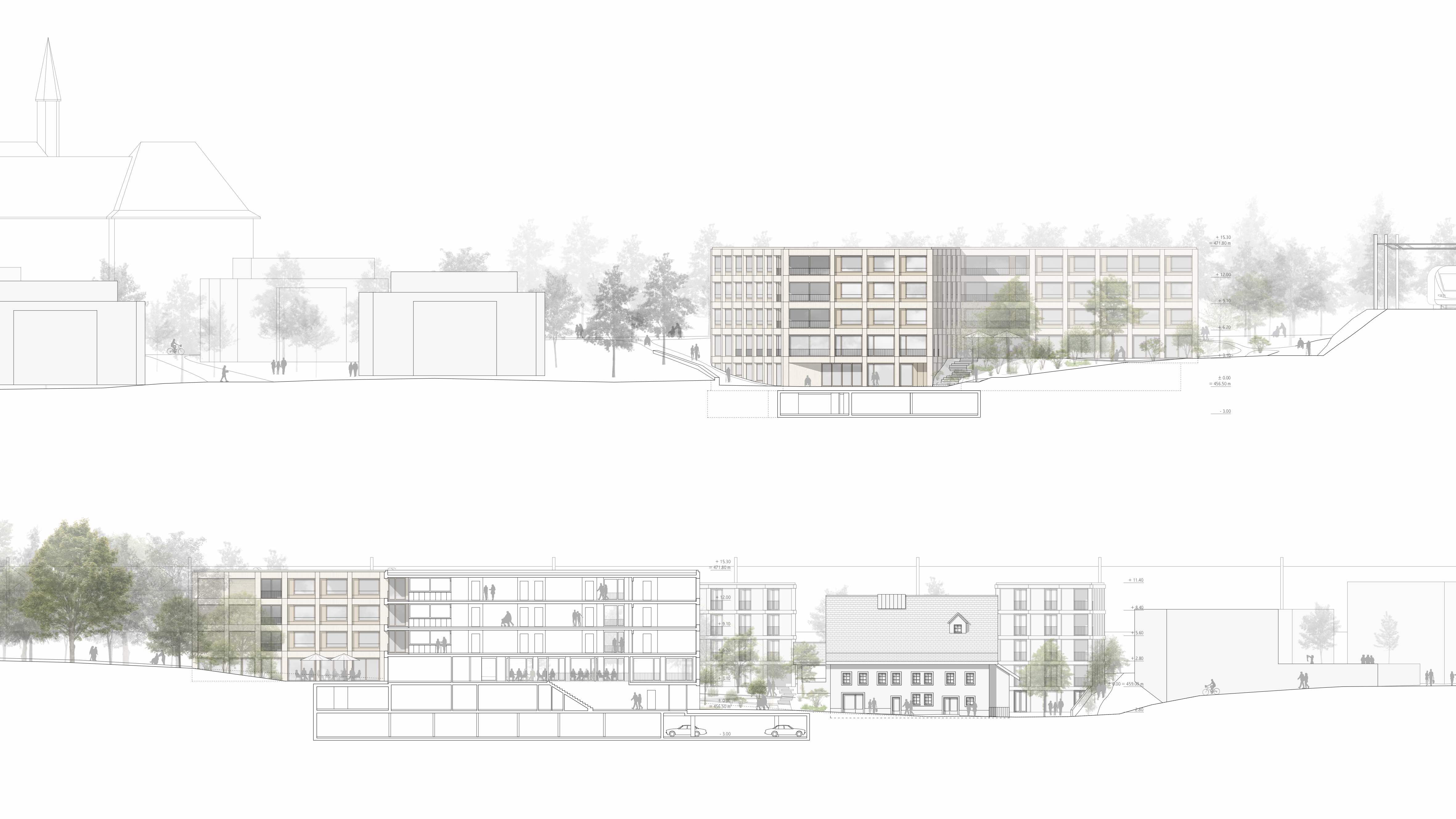 Situé à l’articulation d’un quartier en développement et du parc du site scolaire du Sacré Cœur, le projet fait office de trait d’union entre ces différentes parties, ce qui explique la forme en Z particulière de sa volumétrie, qui dégage de part et d’autre des lieux de détente ouverts sur le contexte immédiat. La qualité paysagère du lieu est un atout à préserver, de manière à respecter l’essence du site: géographique, topographique, écologique, historique, patrimoniale, architecturale et sociale.
