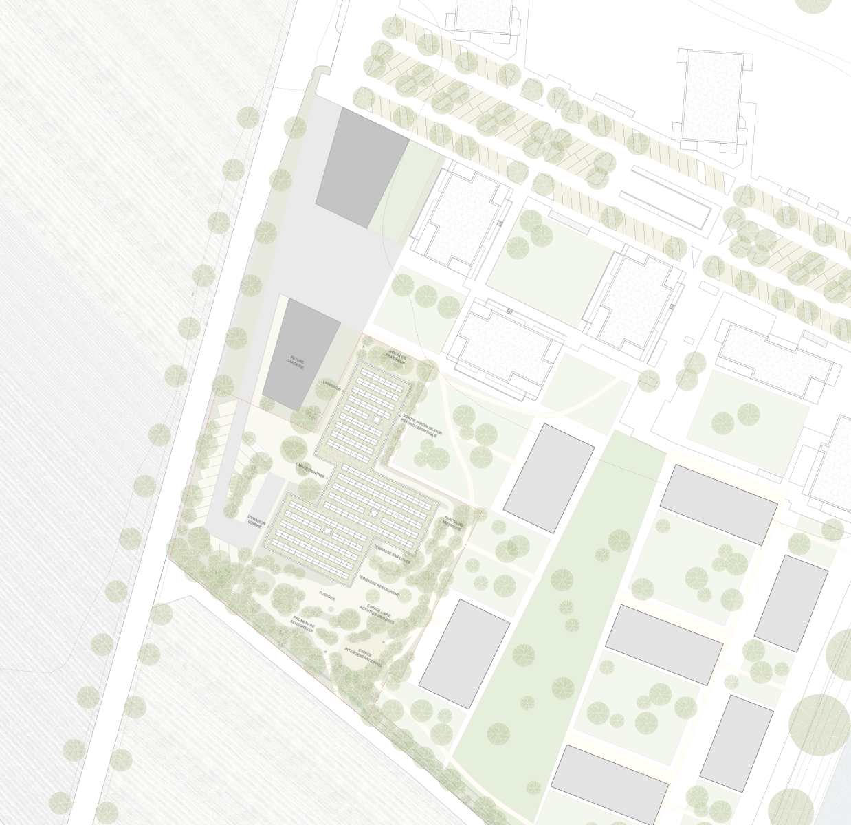 La figure d’implantation proposée permet d’accueillir le programme particulier de l’EMS, une sorte de petit bourg habité avec ses places et ses accès différenciés depuis le réseau viaire existant, tout en se calquant sur les périmètres et les bandes d’implantation fixées.