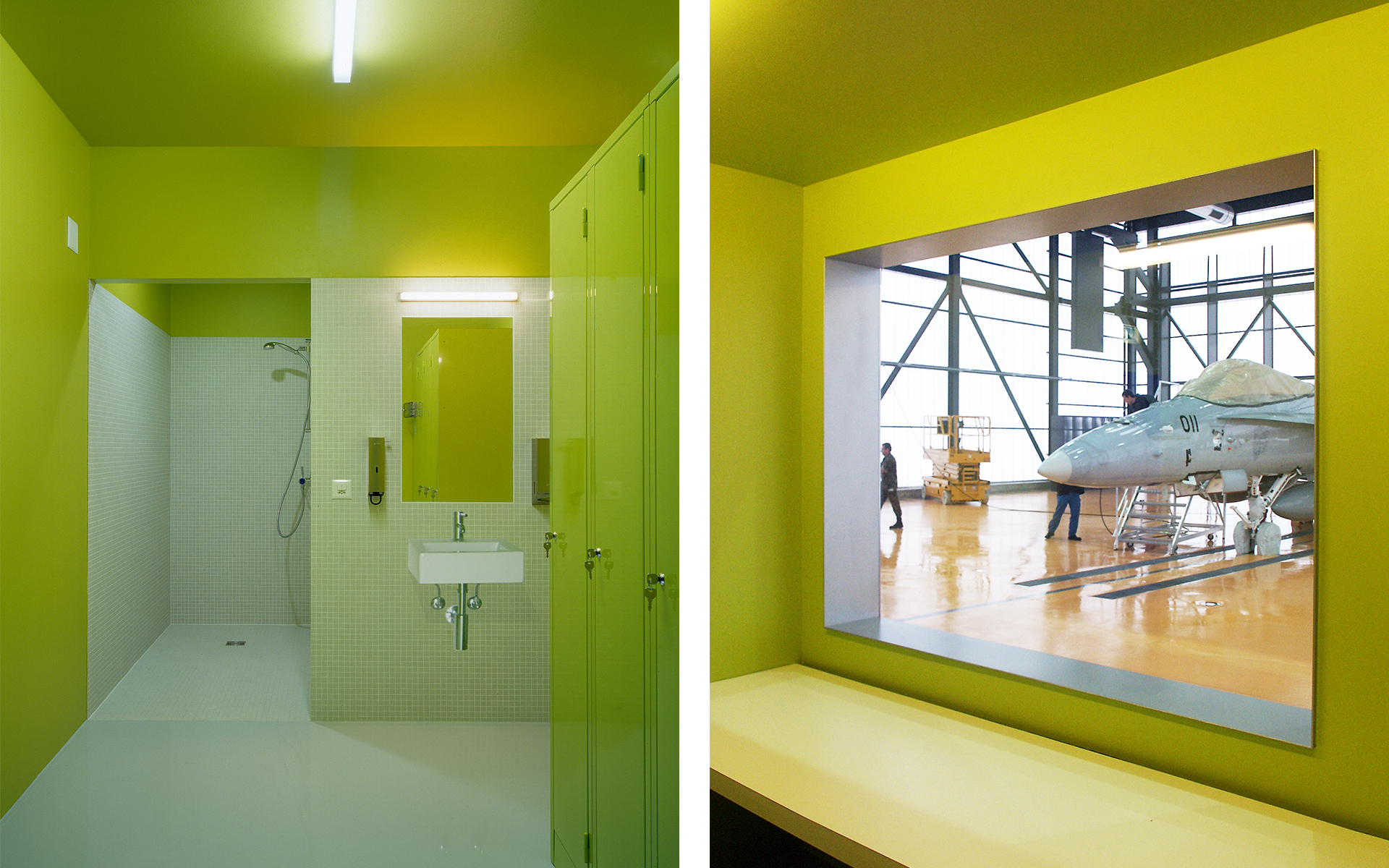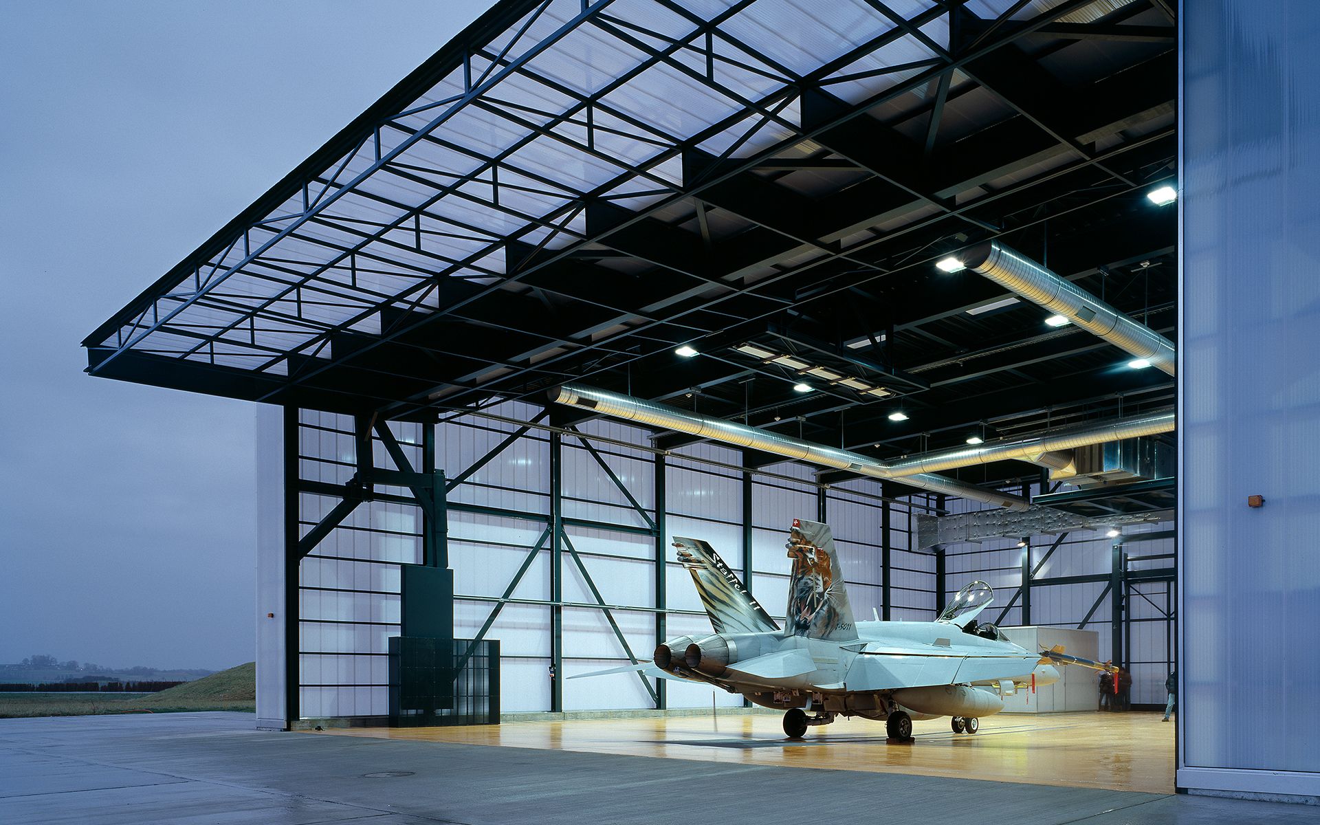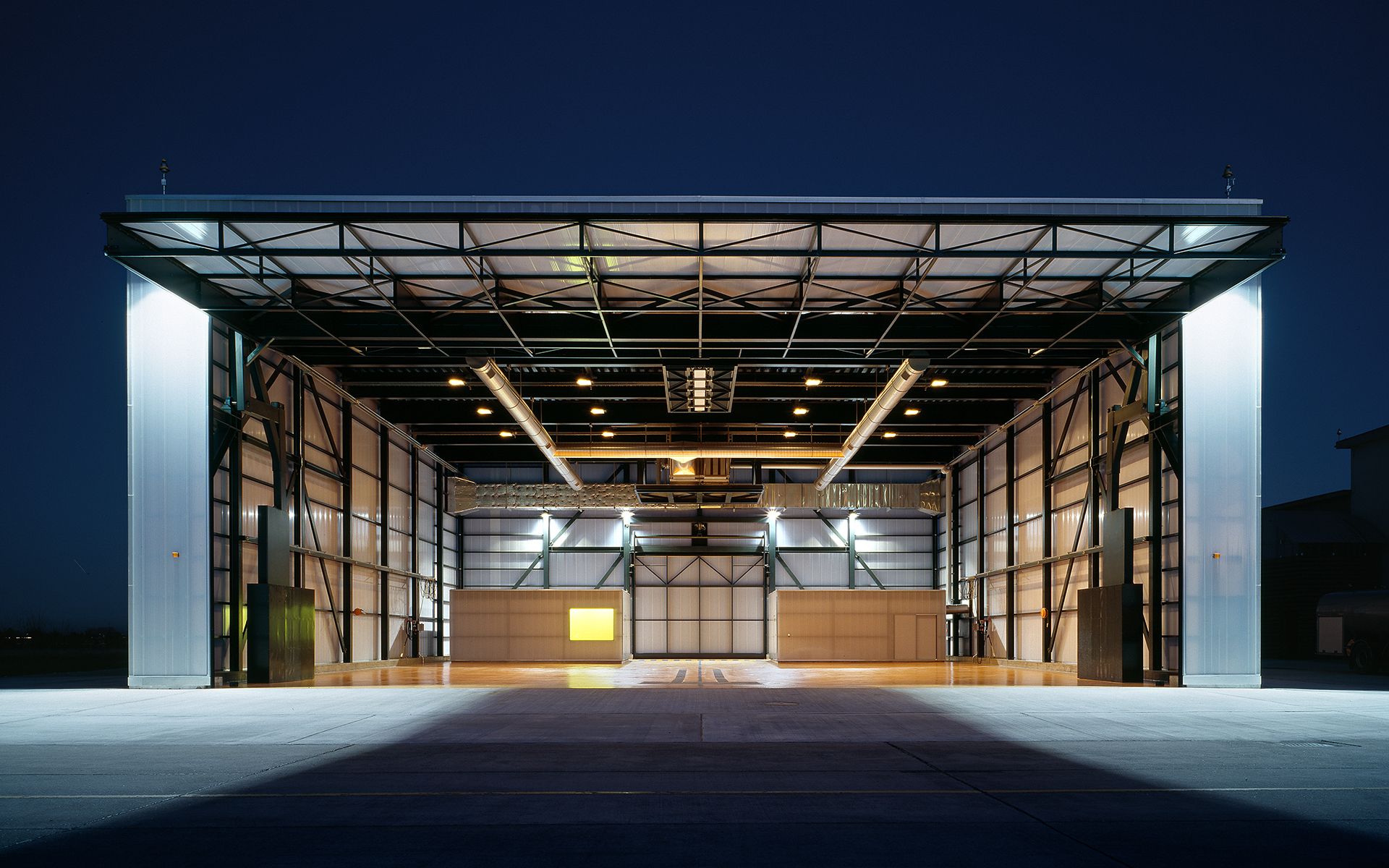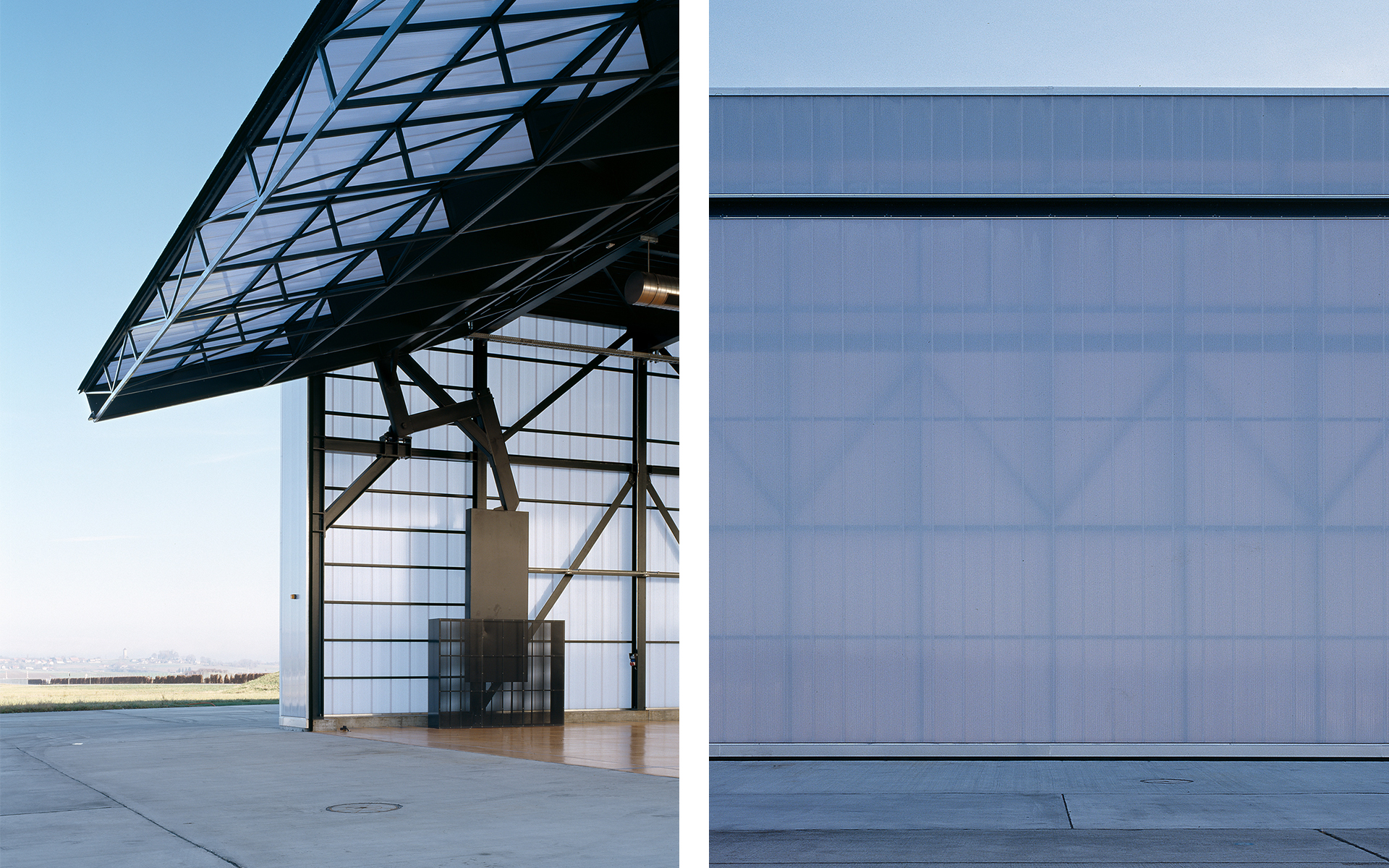 Située en limite sud de l’aérodrome de Payerne, cette halle est destinée au lavage des avions et des véhicules spéciaux de l’aérodrome. Le volume est simple, en adéquation avec le programme: une structure métallique habillée de panneaux en polycarbonate résistant à l’eau pour les façades et des plaques de tôle ondulée Montana pour la toiture. De grandes portes basculantes permettent l’accès et la sortie des engins. A l’intérieur, les locaux annexes (vestiaires, dépôts, locaux techniques) sont insérés dans deux volumes plus petits, également habillés en polycarbonate. Le choix de ce matériau a été dicté à l’usage de la halle (le lavage des engins), pour ses bonnes qualités thermiques et pour son aspect translucide, transformant cette halle en boîte lumineuse dans la plaine de la Broye, particulièrement visible depuis l’autoroute proche. Un système innovant de traitement des eaux de lavage a été réalisé à l’extérieur du bâtiment.