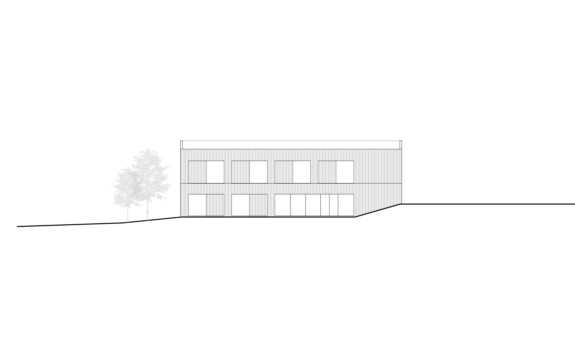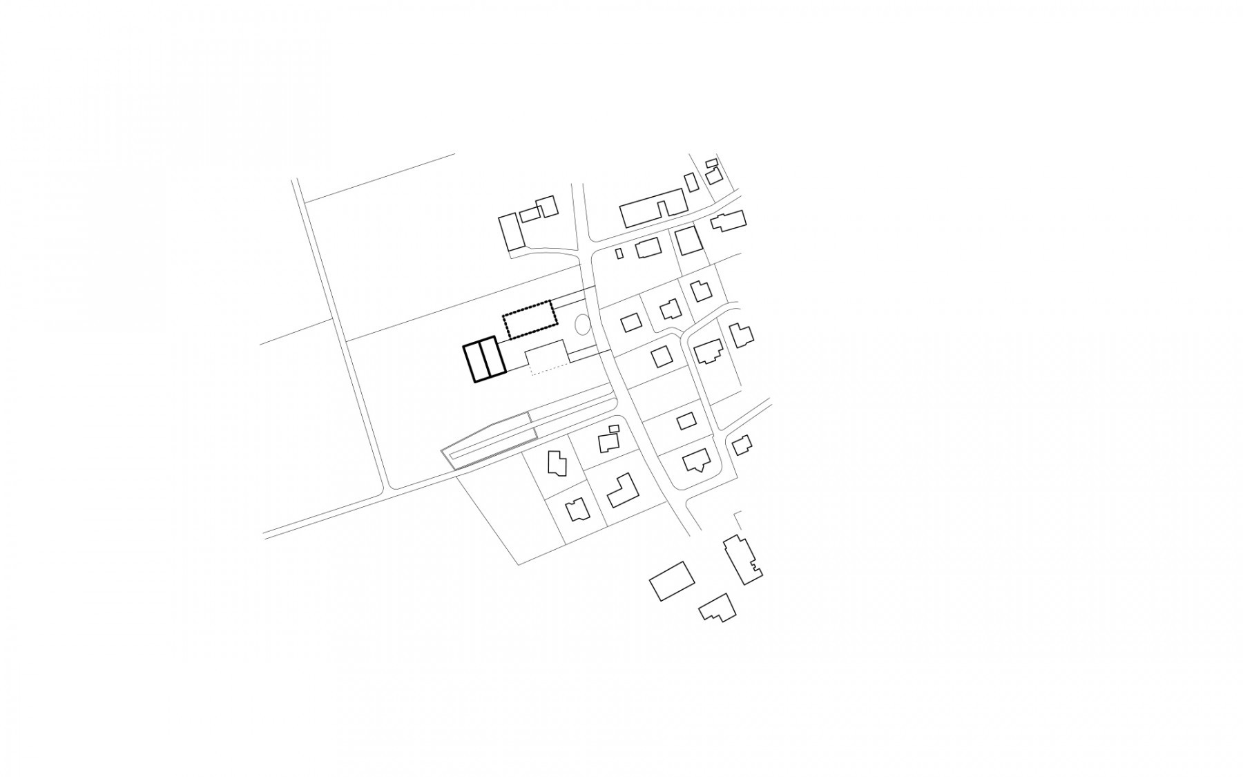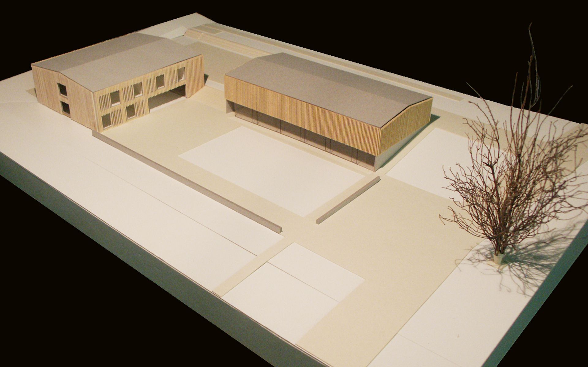 Le programme du concours d’architecture prévoyait la réalisation d’une salle de sport et d’une école de 6 salles de classe avec ses locaux annexes (bibliothèque, salle des maîtres, infirmerie). Seul le bâtiment de l’école à été réalisé à ce jour. Implanté dans la partie la plus plate du terrain, il délimite à l’ouest le préau de l’école, trait d’union avec la route traversant le village. La salle de sport adossée à la pente du terrain délimitait et accompagnait le préau au nord, en profitant de la déclivité du terrain pour enterrer une partie de son programme et réduire sa volumétrie dans le site.