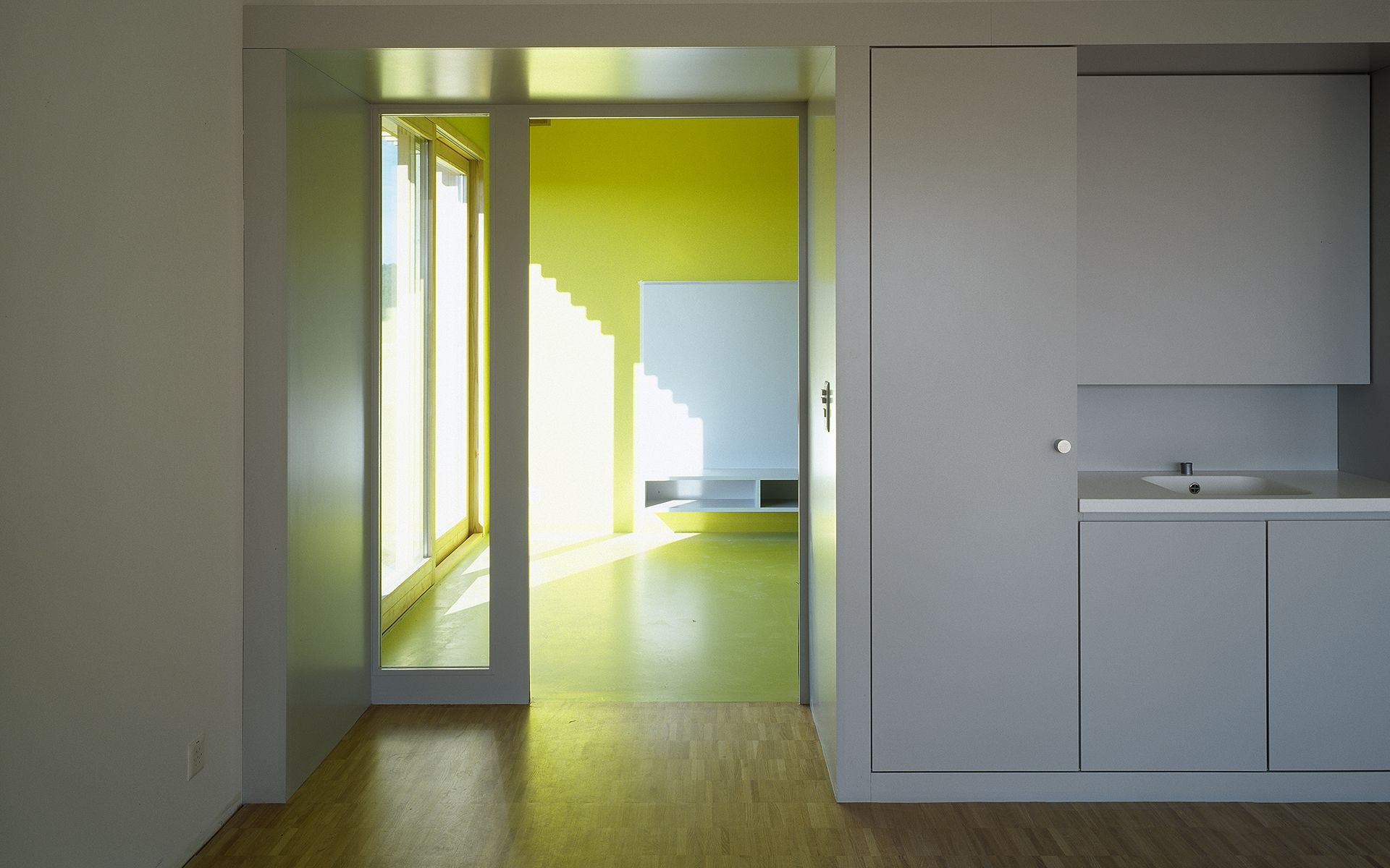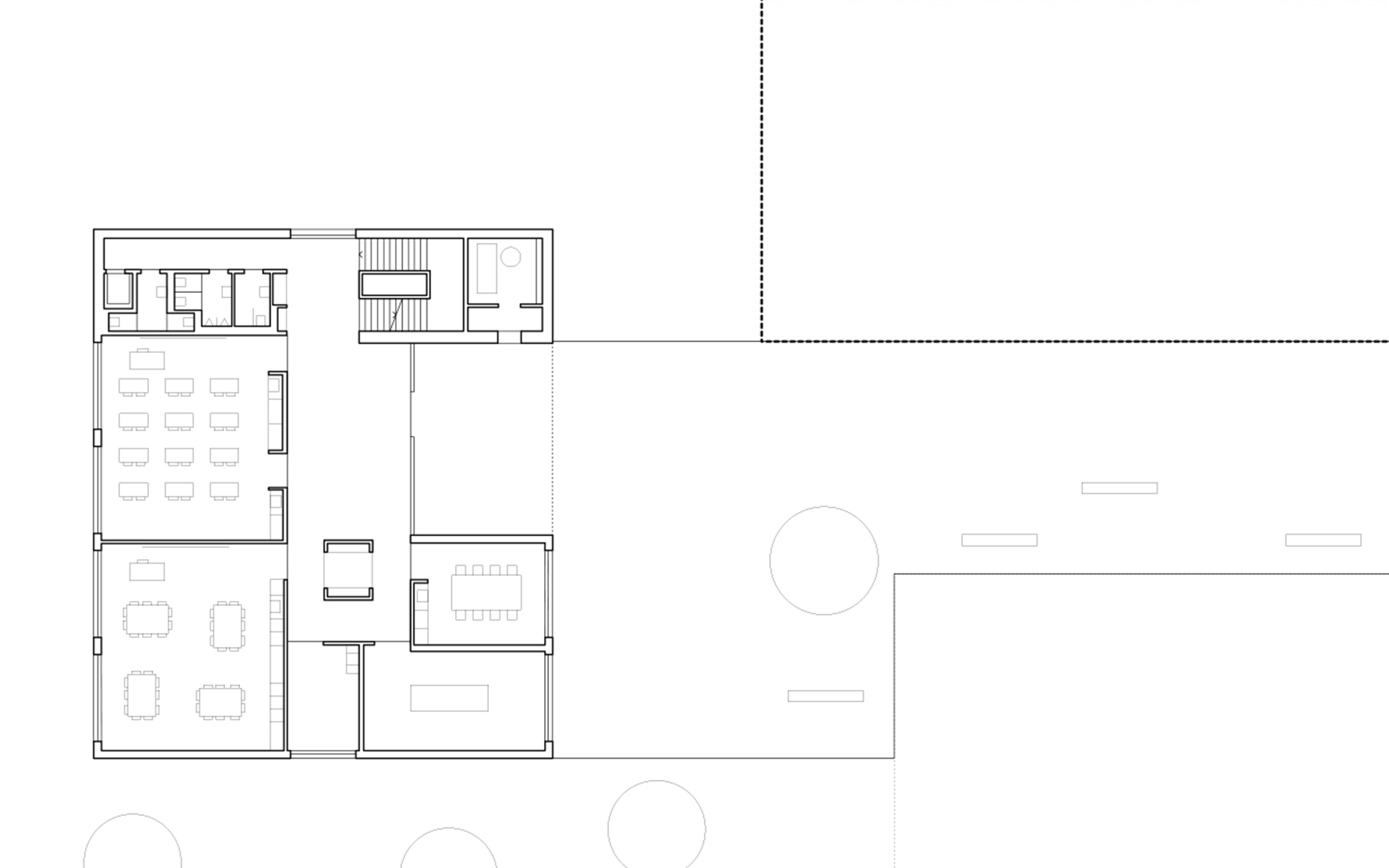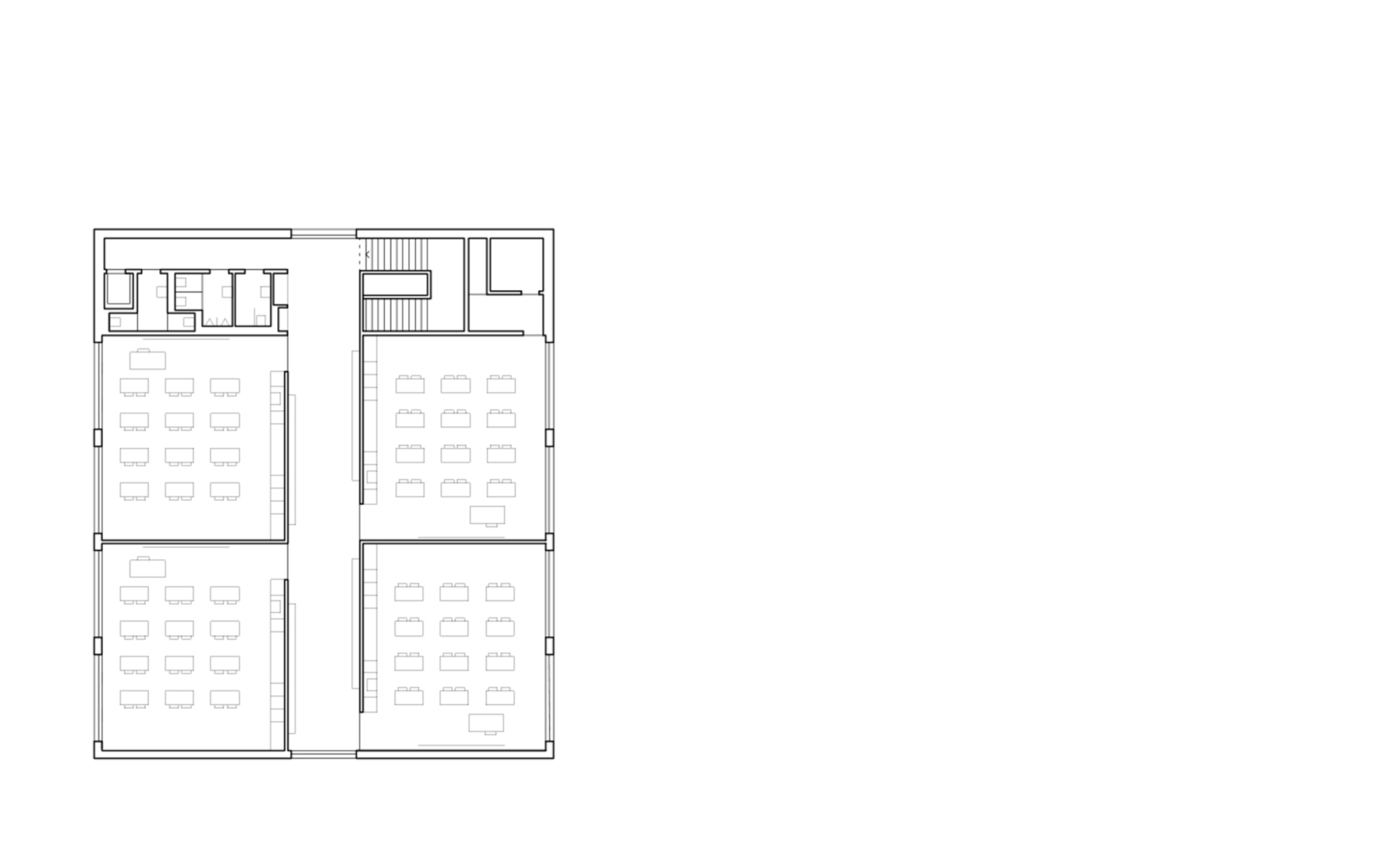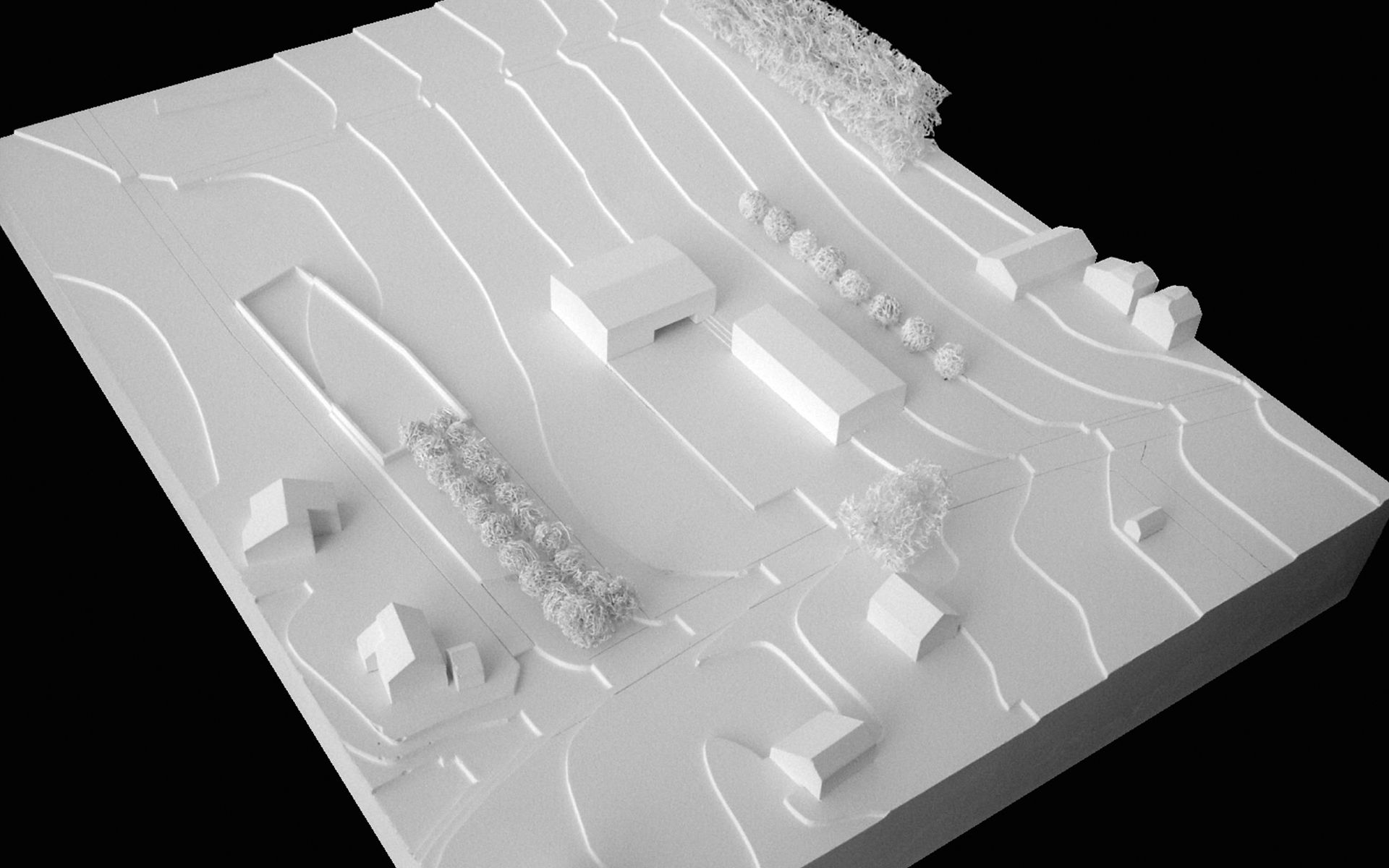 Le programme du concours d’architecture prévoyait la réalisation d’une salle de sport et d’une école de 6 salles de classe avec ses locaux annexes (bibliothèque, salle des maîtres, infirmerie). Seul le bâtiment de l’école à été réalisé à ce jour. Implanté dans la partie la plus plate du terrain, il délimite à l’ouest le préau de l’école, trait d’union avec la route traversant le village. La salle de sport adossée à la pente du terrain délimitait et accompagnait le préau au nord, en profitant de la déclivité du terrain pour enterrer une partie de son programme et réduire sa volumétrie dans le site.