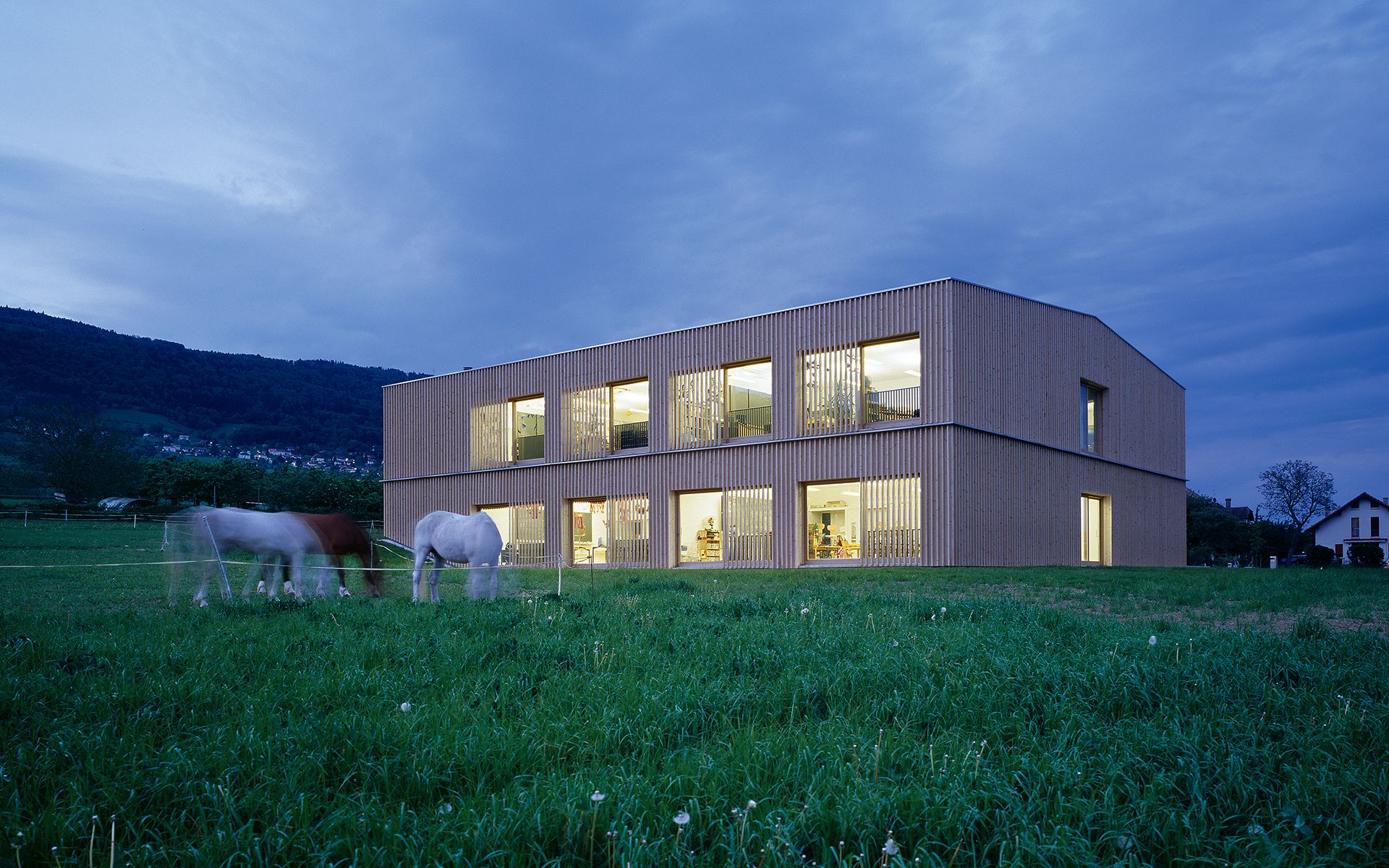 La réalisation de cette école en bois se veut simple et modeste, à la manière des granges et des constructions agricoles environnantes. Les couvres-joints fixés entre les lames en bois du bardage de façade créent un jeu d’ombre et de lumière qui donne une texture particulière et une épaisseur à la façade, se transformant en claires-voie devant les baies vitrées des salles de classe.