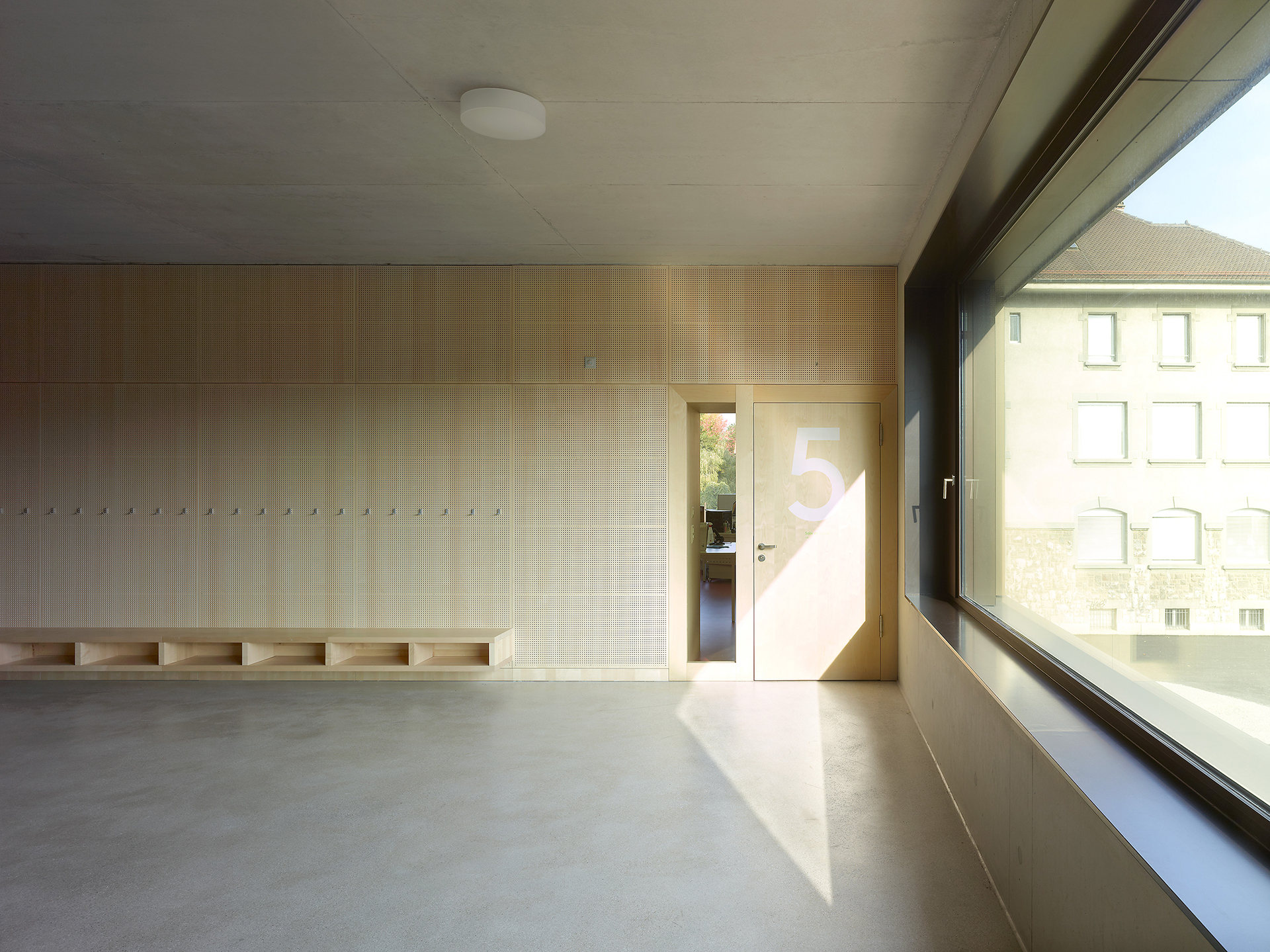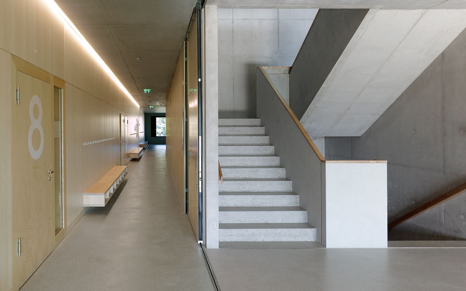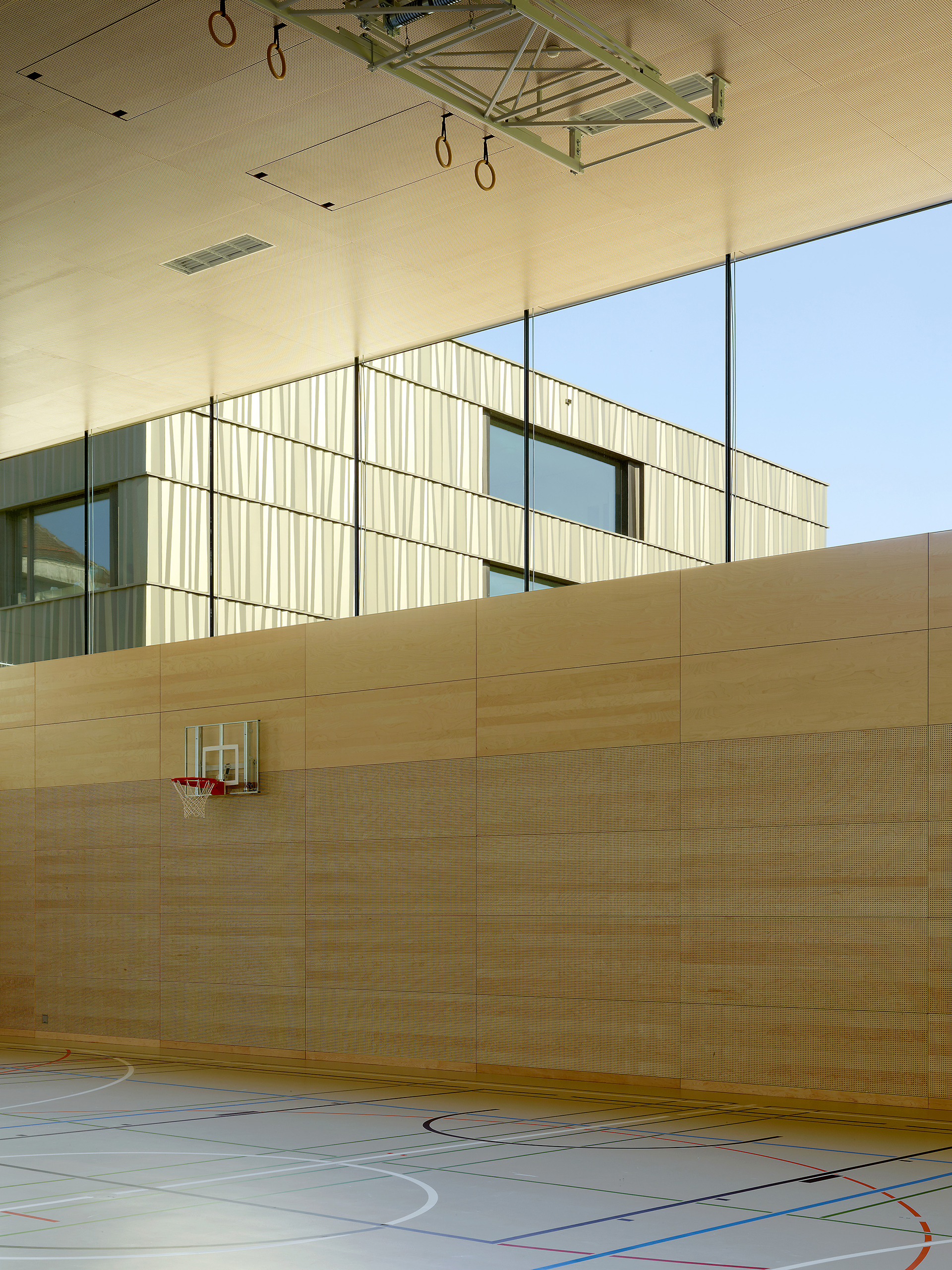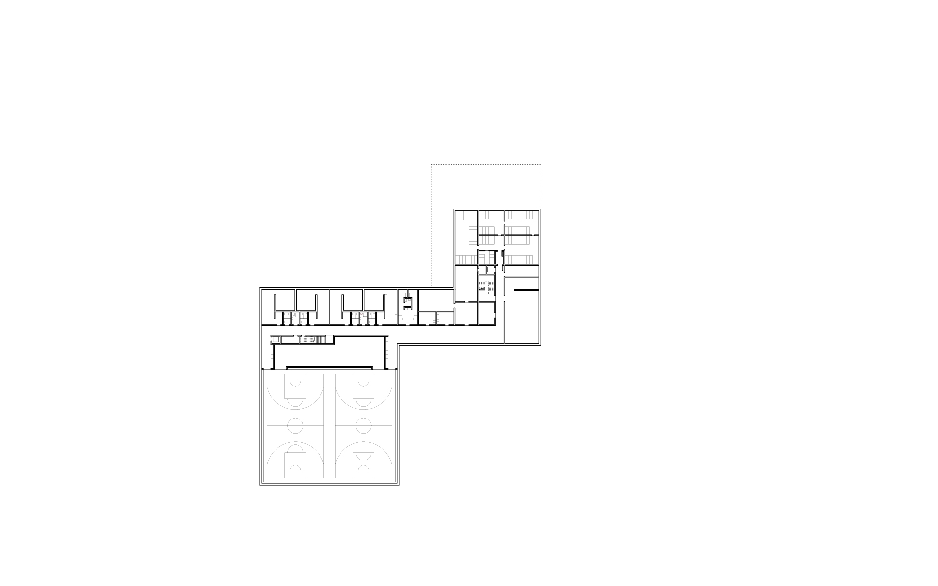 Les salles de classes sont disposées de part et d’autre d’un bloc de services qui ménage à chaque extrémité un vaste espace de dégagement ouvert en façade et pouvant accueillir des activités polyvalentes. Les salles de sport semi- enterrées sont reliées en sous-sol au bâtiment de l’école.