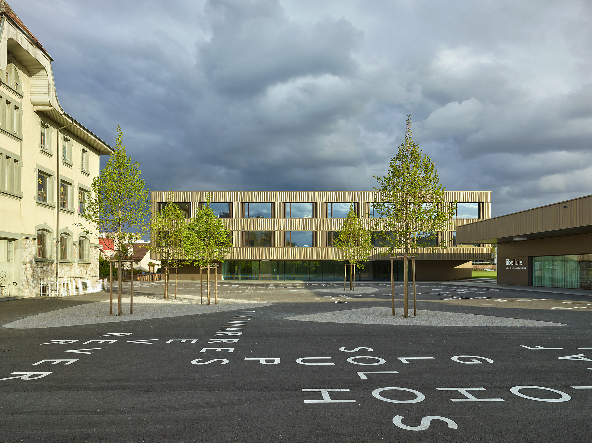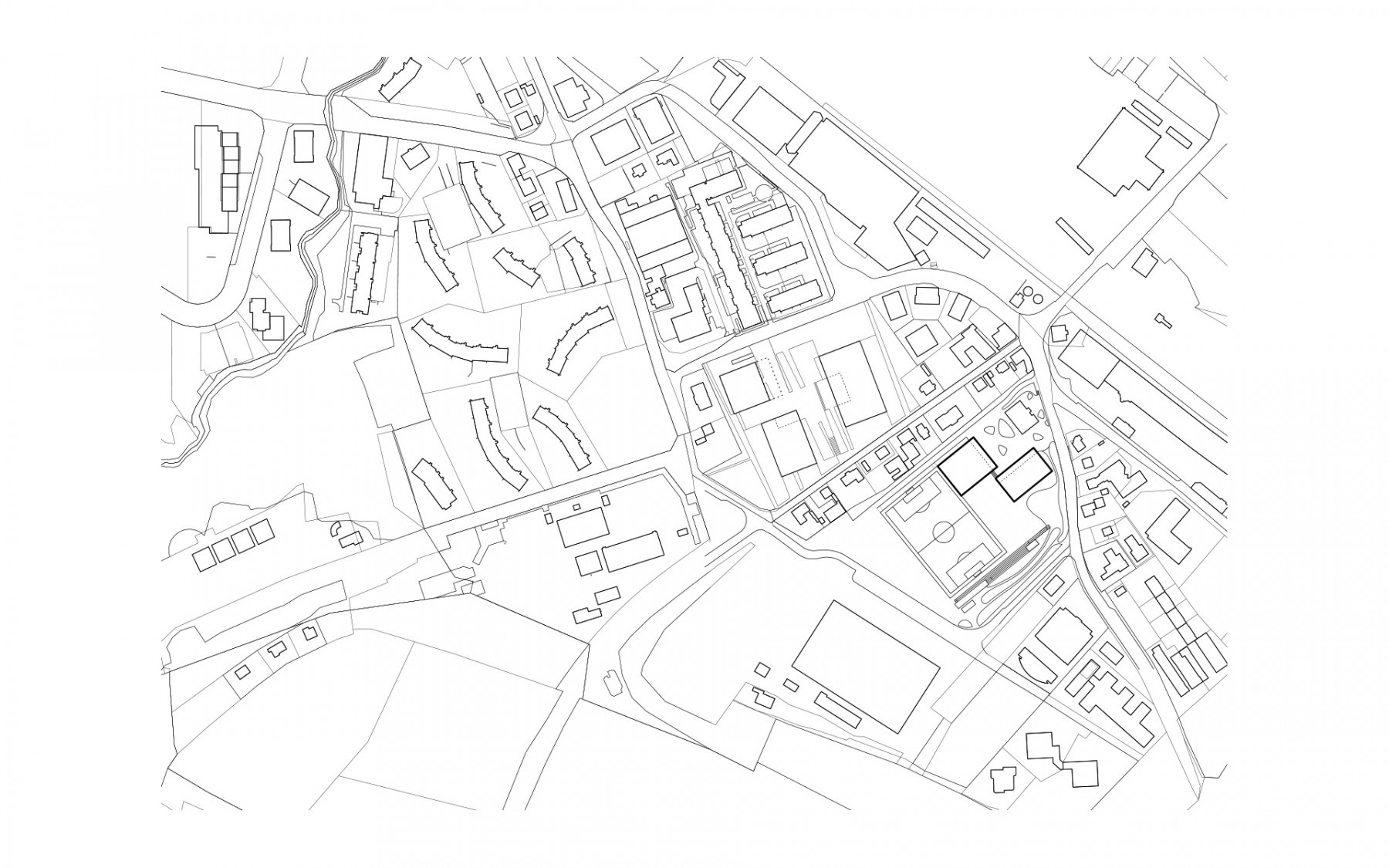 Le projet veut reconnaître l’importance de ce « chemin des écoliers » en articulant le long de ce dernier le préau de l’école, autour duquel se déploient les autres bâtiments scolaires : l’école existante, la nouvelle école et les salles de sport en relation directe avec la zone sportive existante. Ce nouvel ensemble unitaire permet de réaliser sur le reste de la parcelle un terrain de football et un parc sportif pour les habitants du quartier.