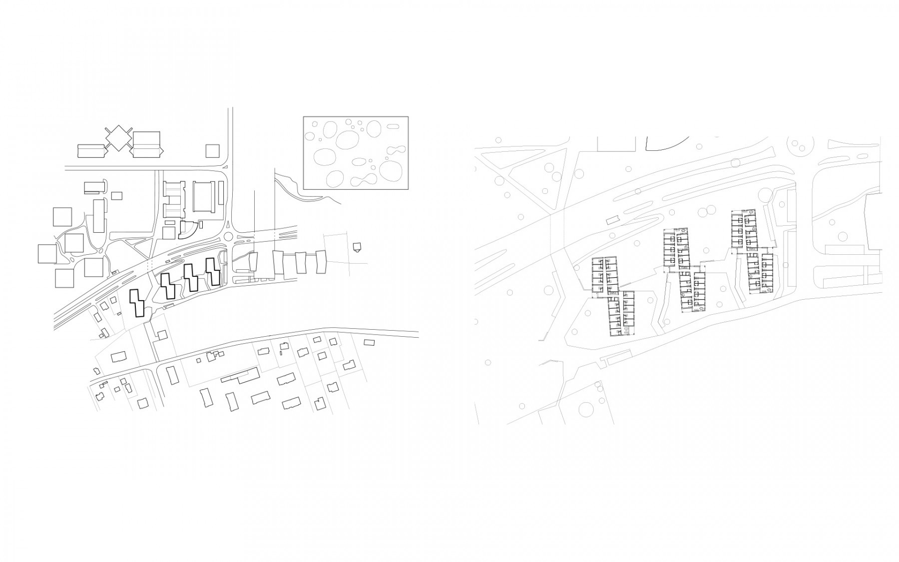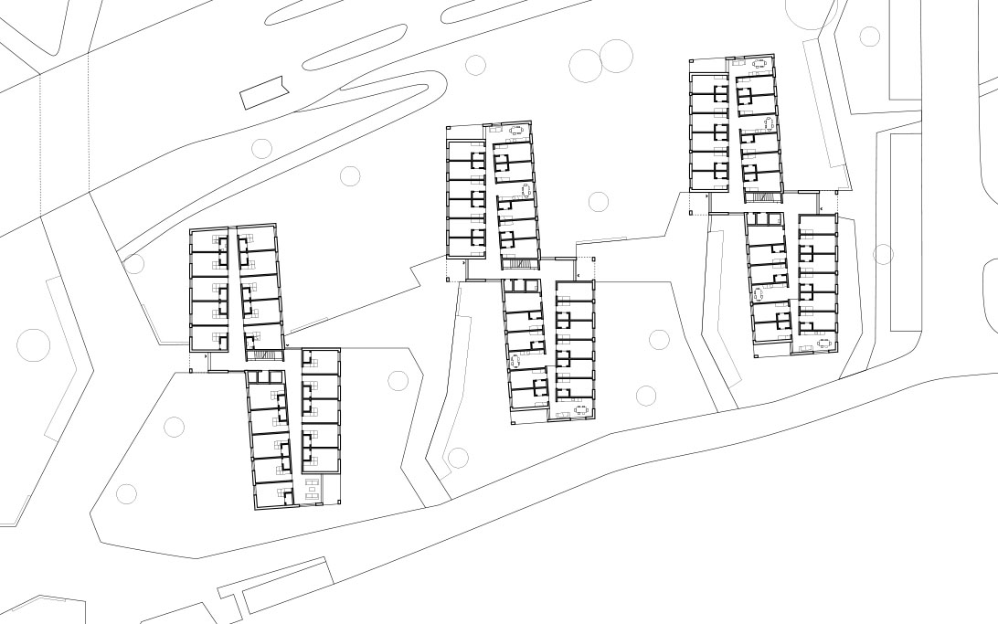 La figure en forme de baïonnette reprend et souligne  les deux géométries présentes sur le site, d’un côté celle des bâtiments EPFL, de l’autre l’orientation naturelle de la pente et des ses courbes de niveaux. Le choix de limiter la hauteur des bâtiments à 4 niveaux (rez +3) donne une échelle modeste aux bâtiments, en leur permettant une meilleure intégration dans le contexte environnant.
