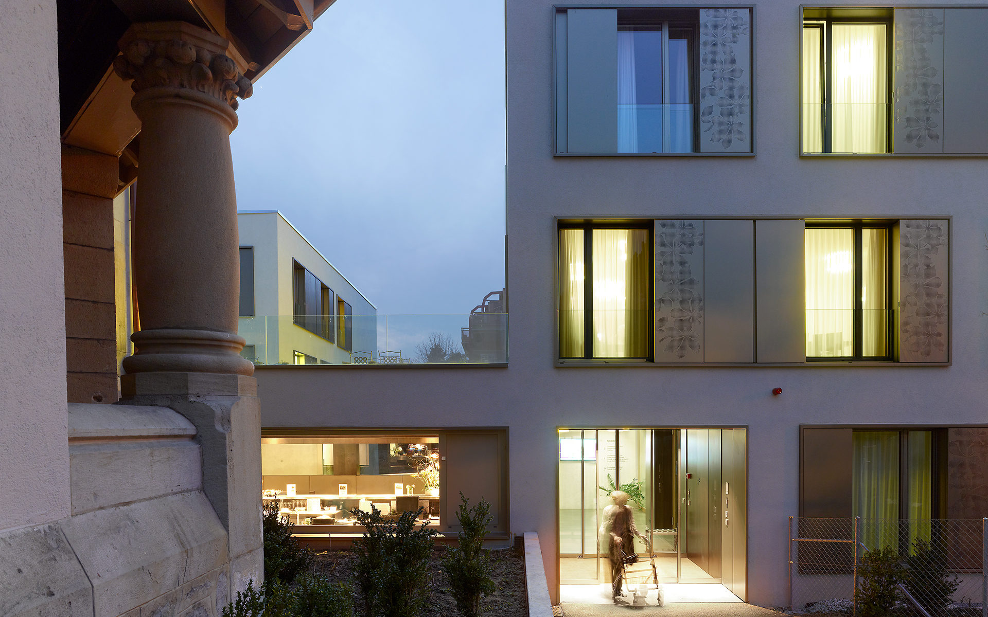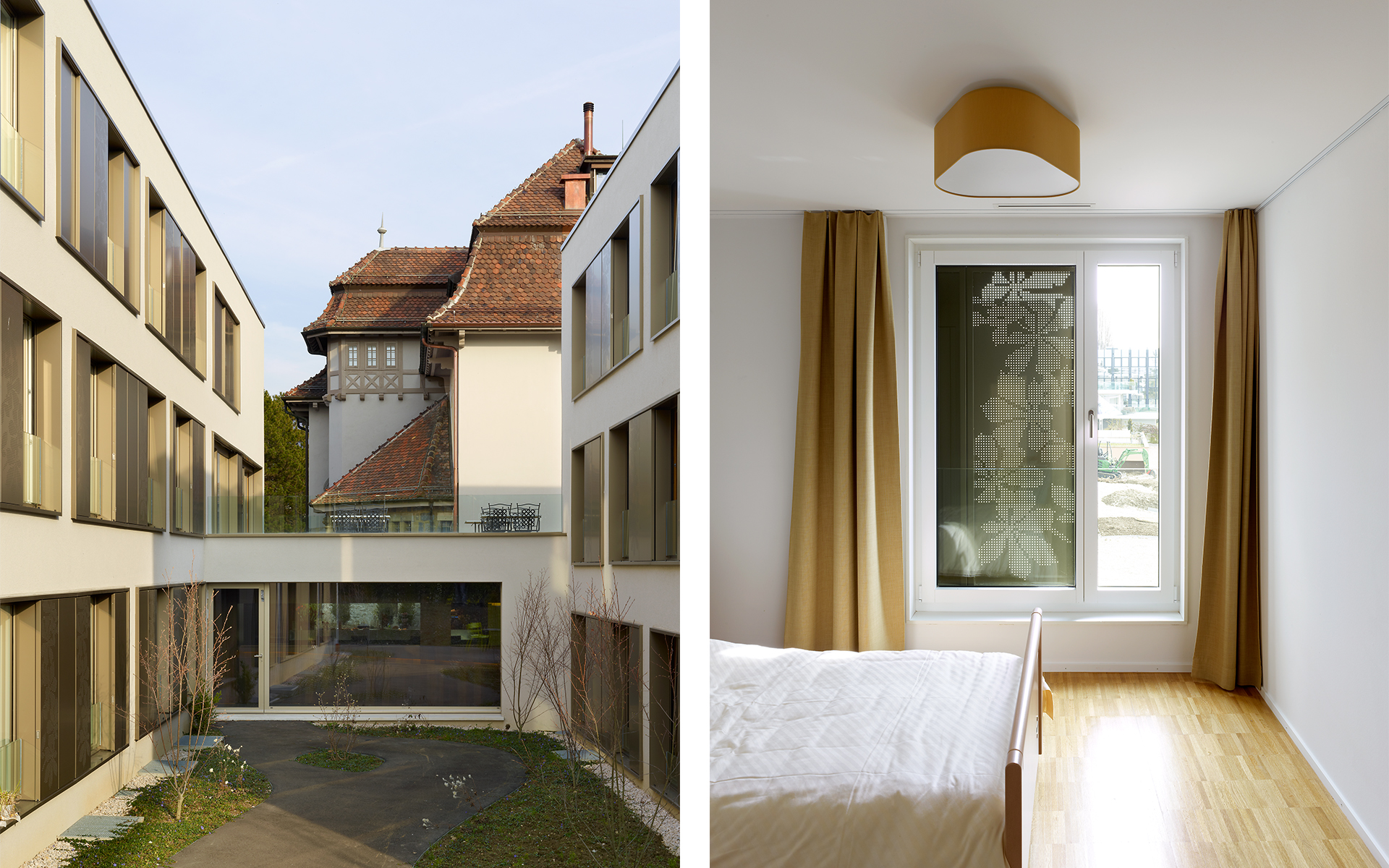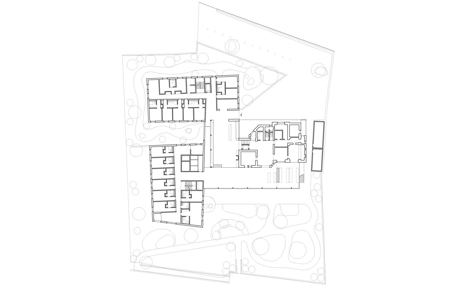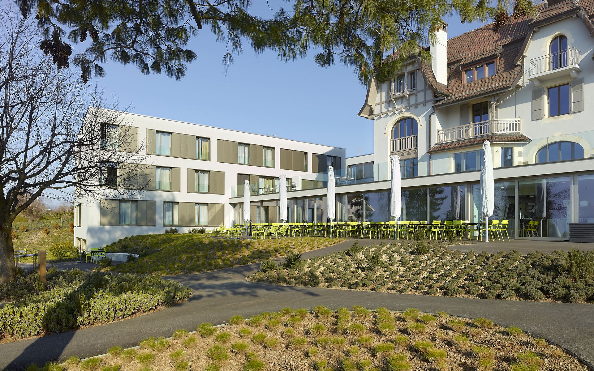 L’atout principal du site est son dégagement vers le lac et les Alpes. Le projet propose de déplacer l’entrée du site en amont, permettant la création d’une rampe en pente douce qui conduit jusqu’au niveau de la cour d’accès. Le bâti s’implante sous forme de trois volumes disposés autour d’une terrasse habitée. Le bâtiment d’Epiteaux est conservé et devient le pivot de cette composition. Ce choix de disposition permet d’offrir des orientations et jeux de jardins pour les différentes unités: cour d’entrée, jardin sécurisé pour la psychogériatrie, jardin public ouvert sur le lac et les Alpes, ou jardins privés.