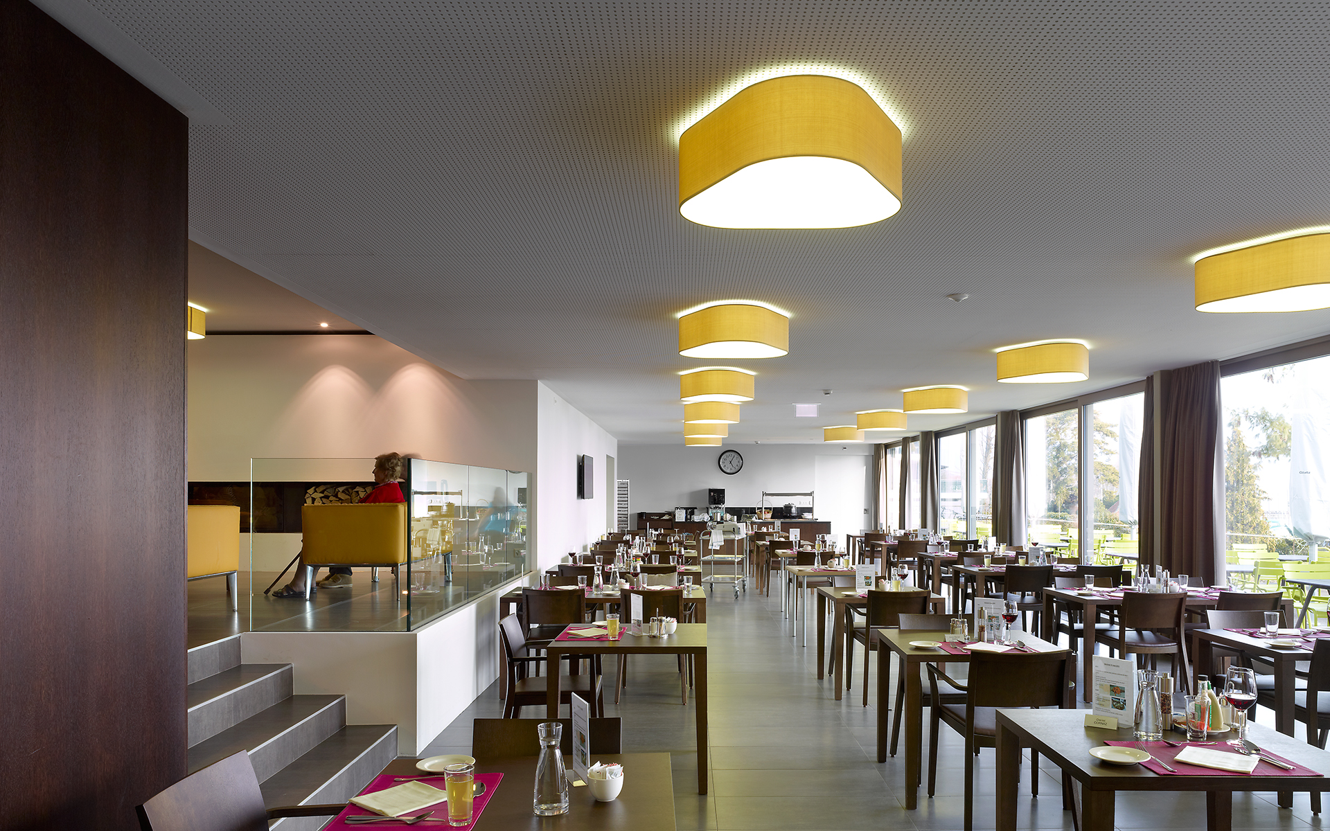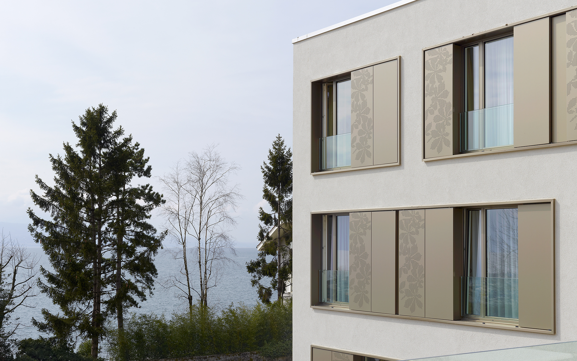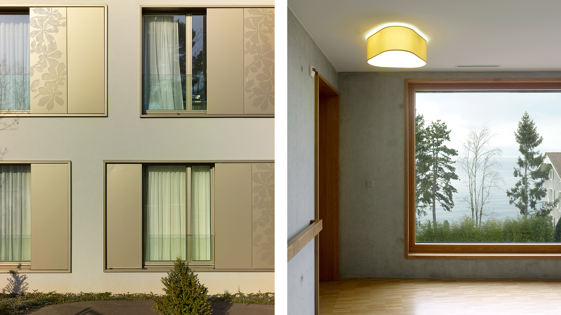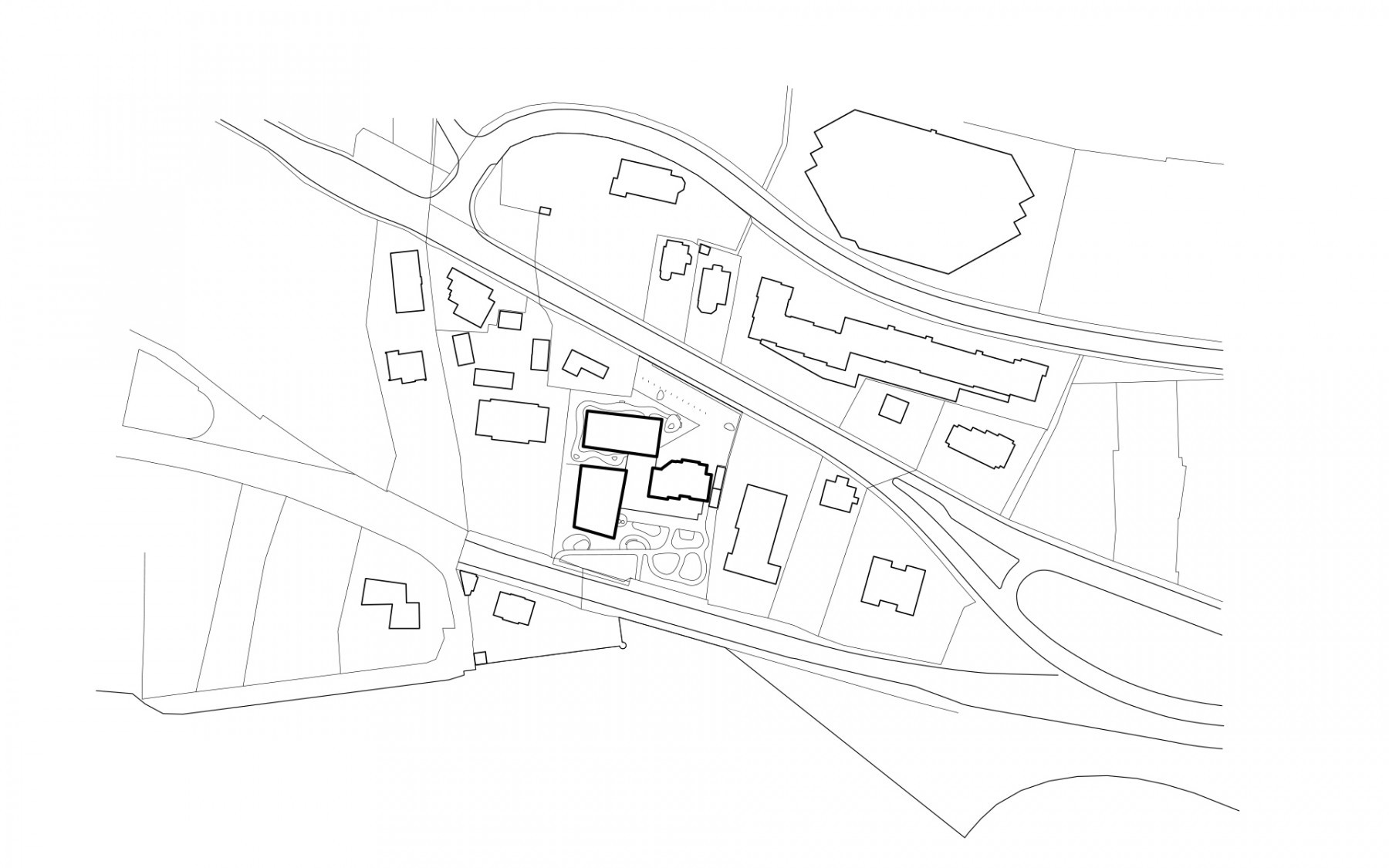 L’atout principal du site est son dégagement vers le lac et les Alpes. Le projet propose de déplacer l’entrée du site en amont, permettant la création d’une rampe en pente douce qui conduit jusqu’au niveau de la cour d’accès. Le bâti s’implante sous forme de trois volumes disposés autour d’une terrasse habitée. Le bâtiment d’Epiteaux est conservé et devient le pivot de cette composition. Ce choix de disposition permet d’offrir des orientations et jeux de jardins pour les différentes unités: cour d’entrée, jardin sécurisé pour la psychogériatrie, jardin public ouvert sur le lac et les Alpes, ou jardins privés.