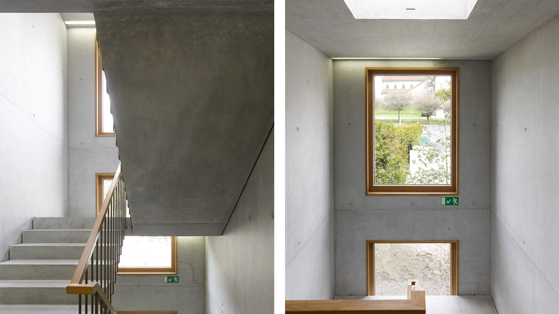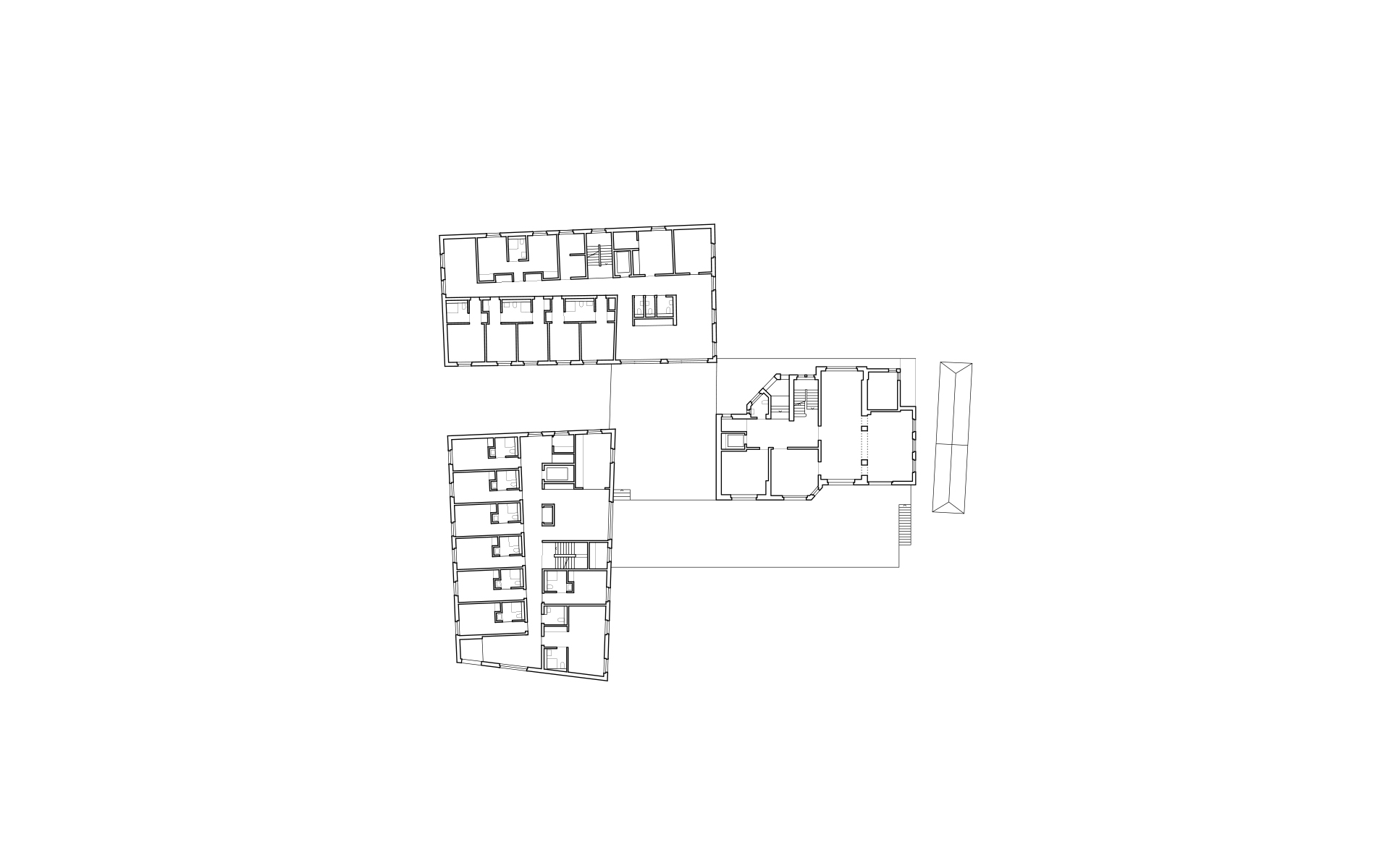 Les trois unités de soins (gériatrie, psychogériatrie, unité d’accueil temporaire) sont disposées chacune dans les trois volumes et sont reliées au rez de chaussée par un socle contenant les espaces communautaires.